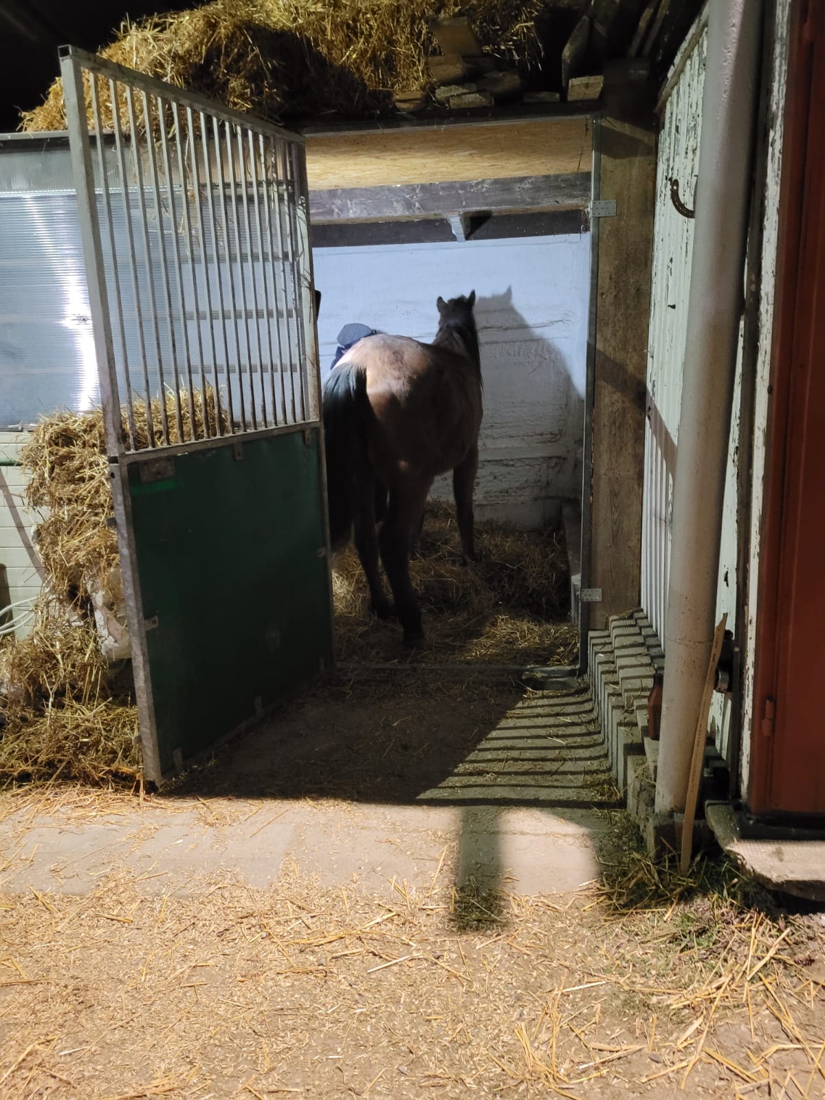 Po postawieniu konia na nogach, weterynarz zaaplikował zwierzęciu leki. Po kilku minutach koń został przeprowadzony do stajni w asekuracji pasów i traktora podjeżdżającego do drzwi wejściowych.