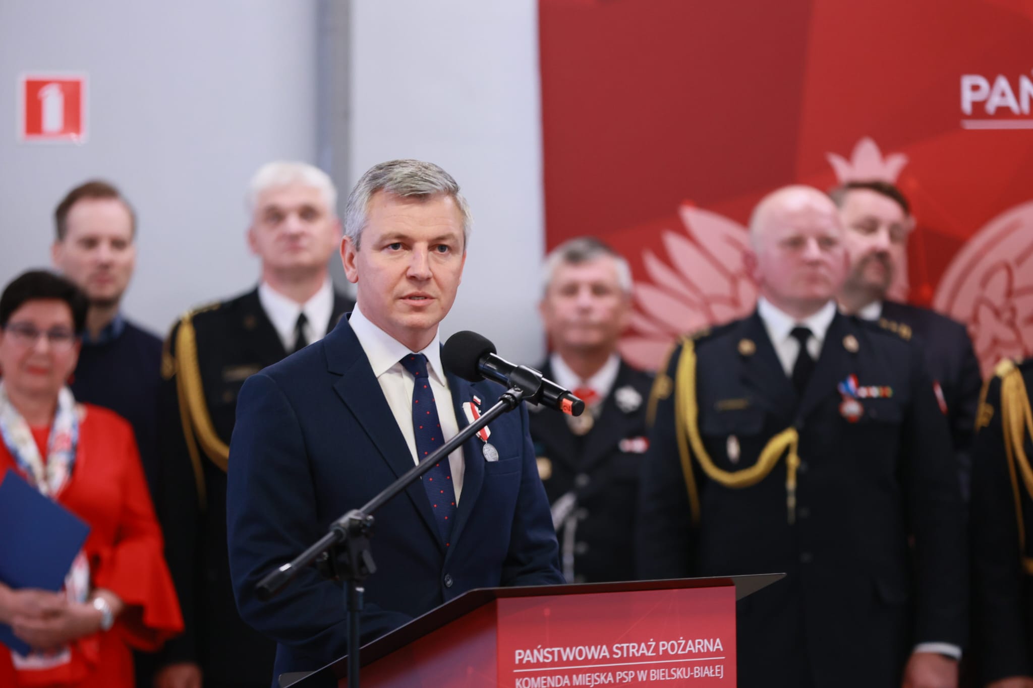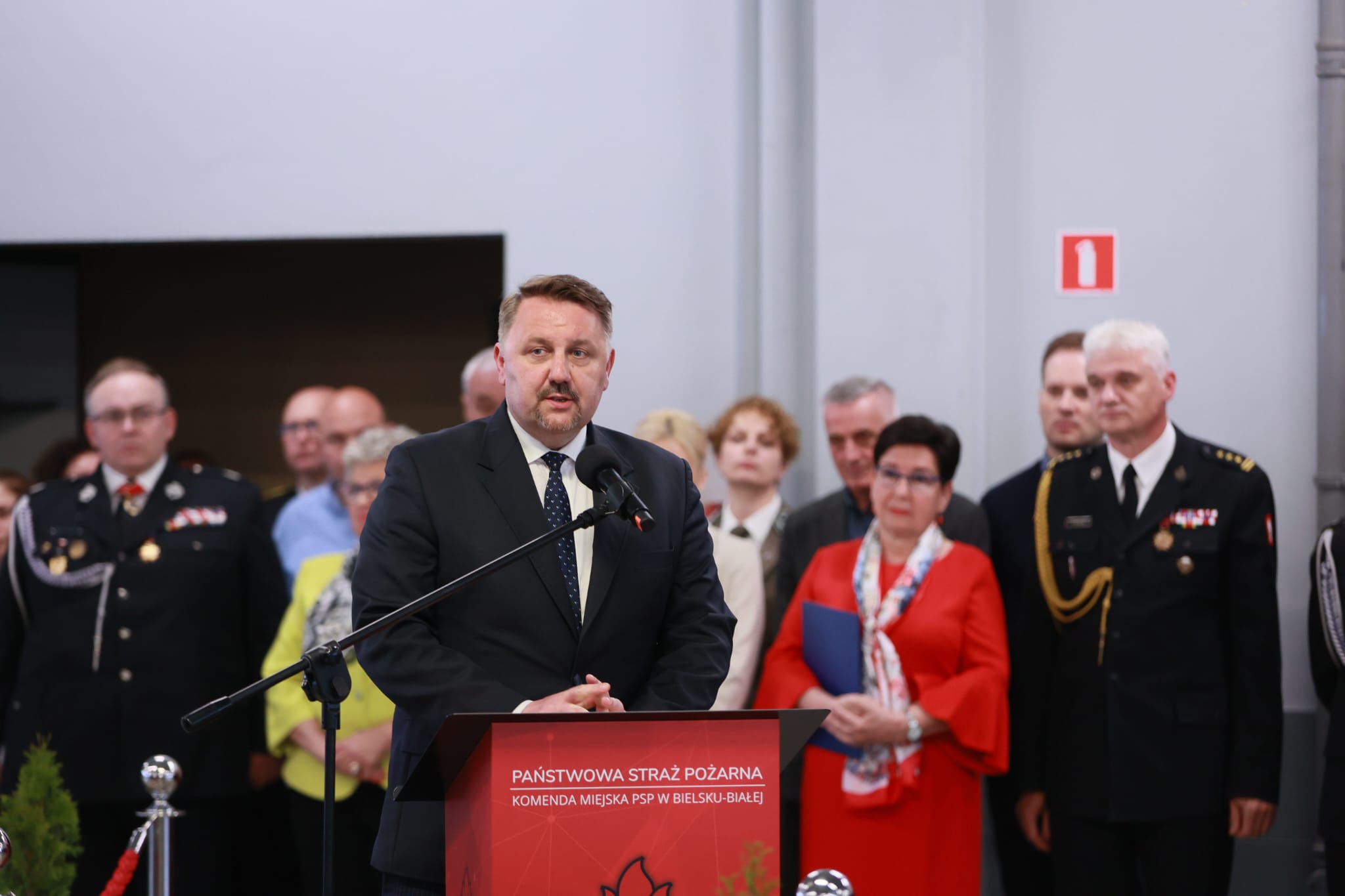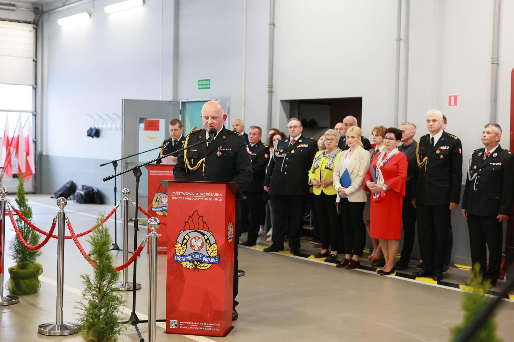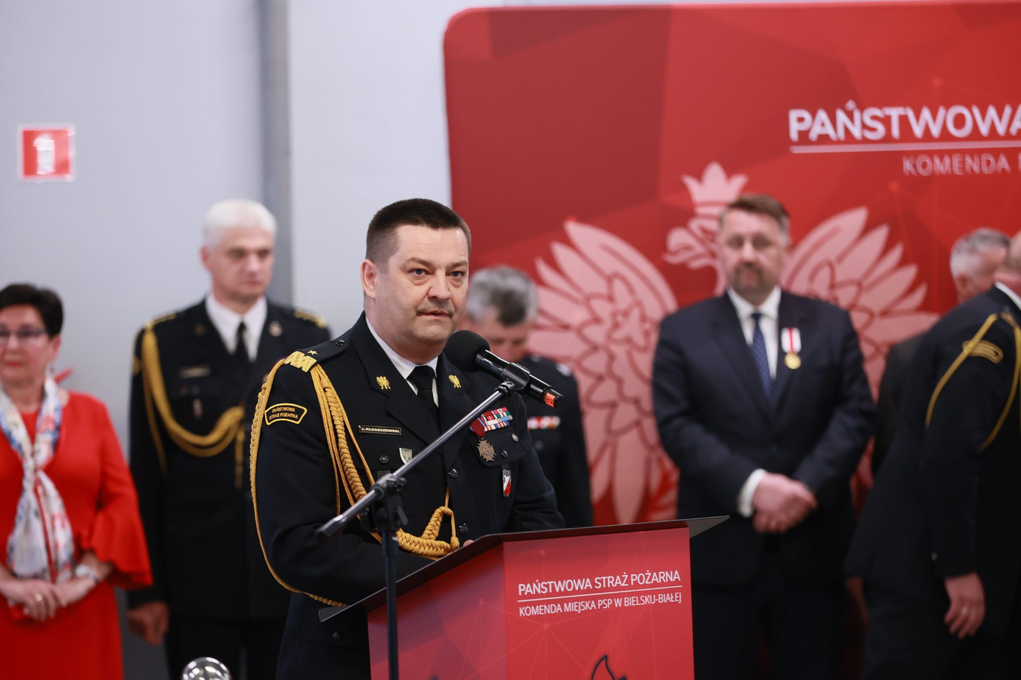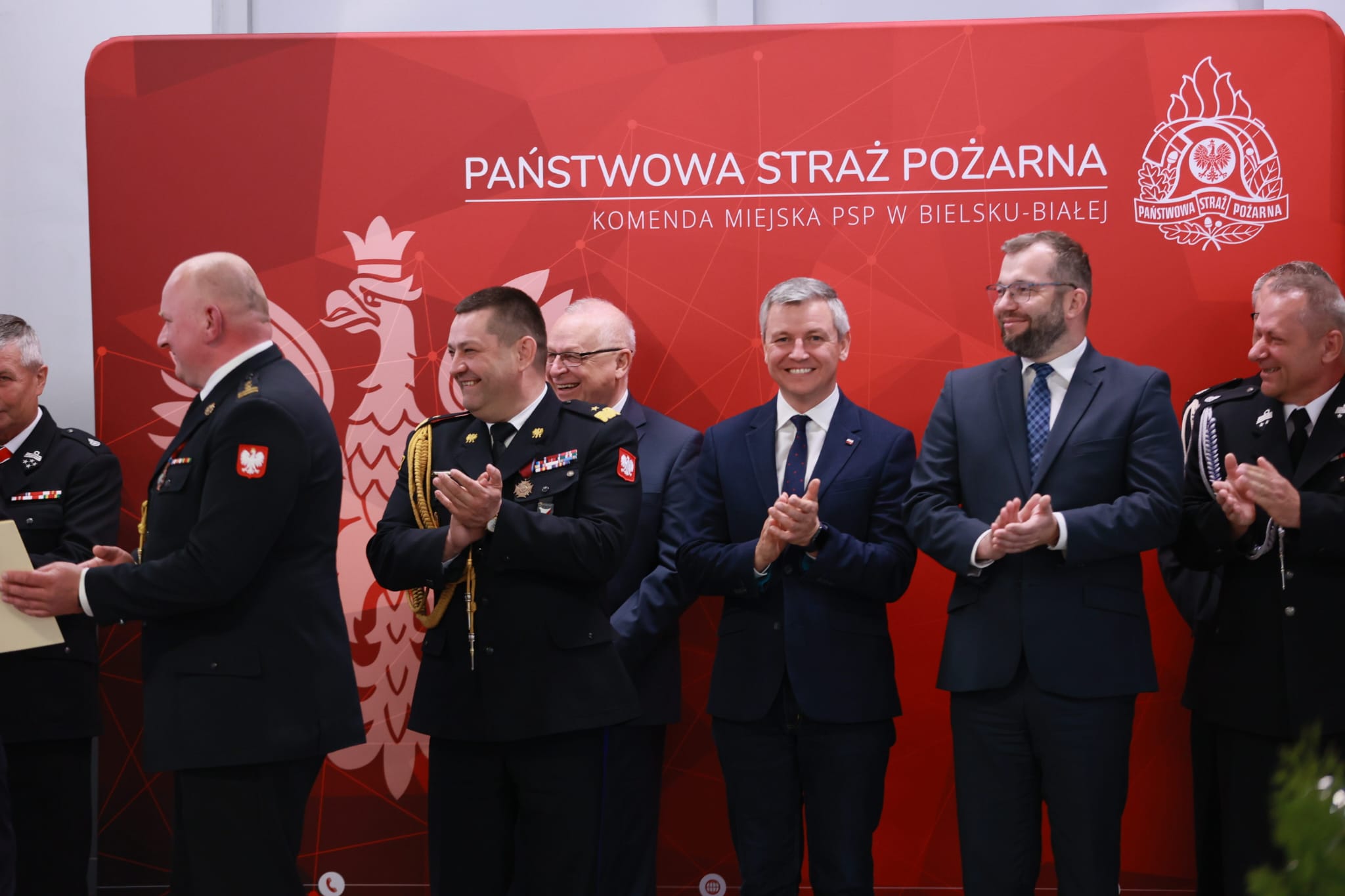 Następnie Komendant Miejski Państwowej Straży Pożarnej w Bielsku-Białej bryg. Roman Marekwica wraz z Prezydentem Miasta Bielska-Białej Jarosławem Klimaszewskim oraz Prezesem Zarządu Oddziału Powiatowego OSP w Bielsku-Białej dh Stanisławem Nyczem przywitali zaproszonych gości.