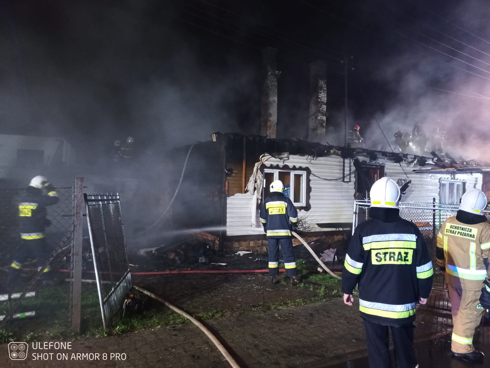 Strażacy zabezpieczyli miejsce zdarzenia oraz podali cztery prądy gaśnicze na palący się budynek oraz przybudówkę z drewnem. W między czasie przybyłe pogotowie energetyczne odcięło zasilanie do budynku. Dalsze działania polegały na całkowitym rozebraniu wiaty z drewnem oraz konstrukcji dachu budynku. Następnie przewietrzono budynek i sprawdzono na obecność tlenku węgla. W wyniku pożaru zniszczeniu uległ budynek mieszkalny oraz wiata na drewno. W działaniach trwających 3 godziny wzięło udział 10 zastępów straży pożarnej. Przyczynę pożaru ustala obecna na miejscu zderzania policja.