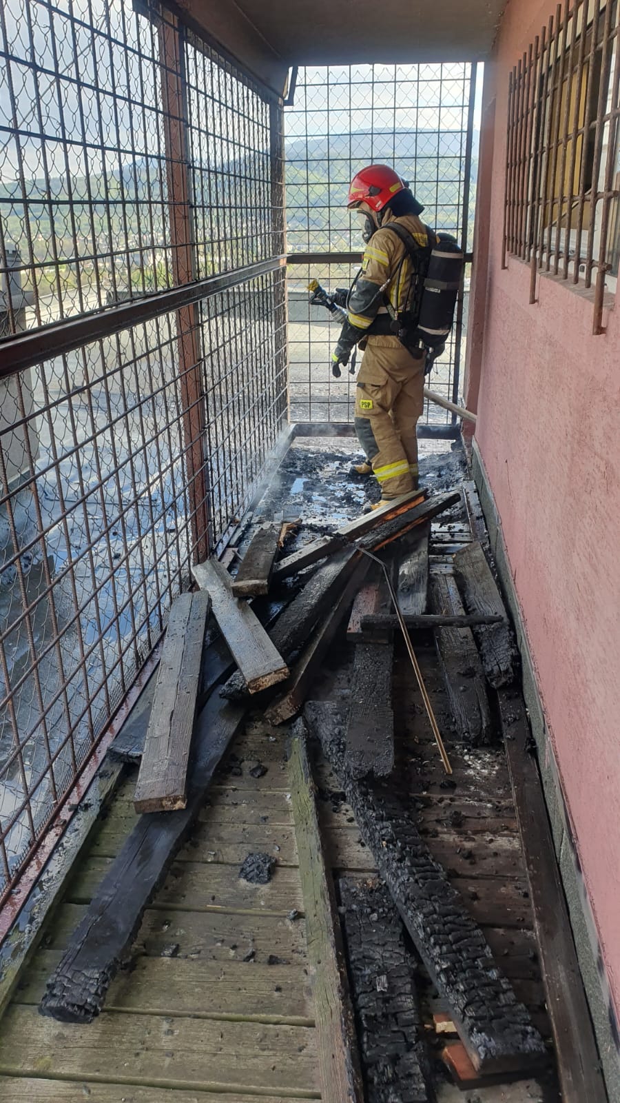 Strażacy zabezpieczeni w aparaty ochrony dróg oddechowych podali jeden prąd wody z nawodnionego pionu, znajdującego się w budynku na dach. Równocześnie rozłożono drabinę mechaniczną, z której podano drugi prąd wody. Po zlokalizowaniu i ugaszeniu pożaru, stwierdzono, że paliła się tzw. galeria ewakuacyjna na dachu (deski z podestu i papa). Dalsze czynności wyjaśniające prowadzi policja. Działania zakończono o godz. 18:51