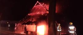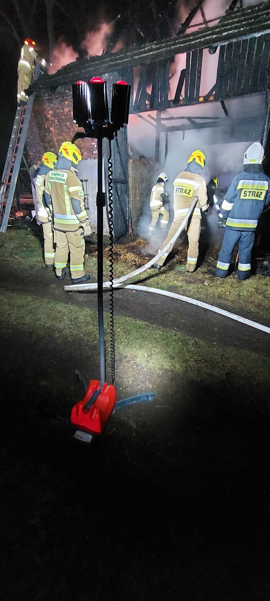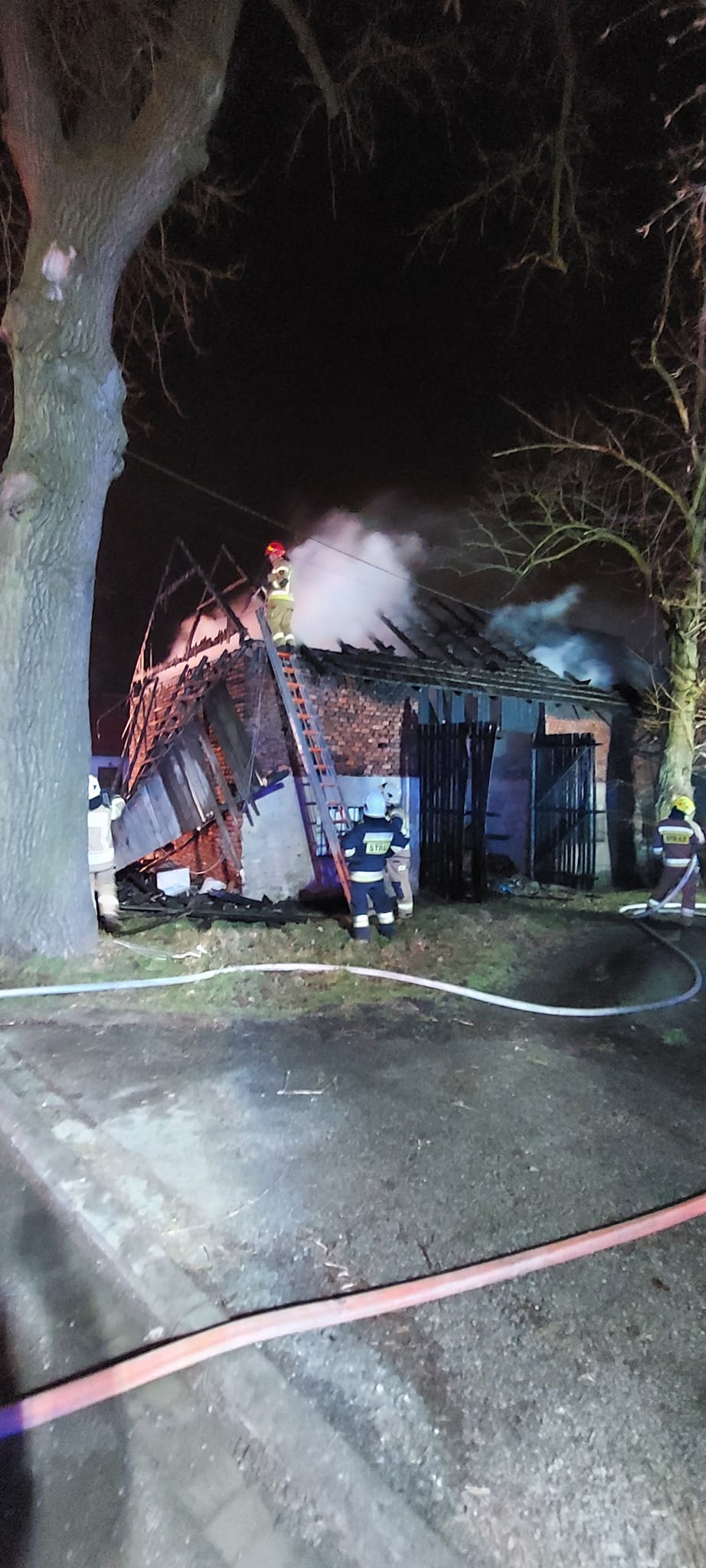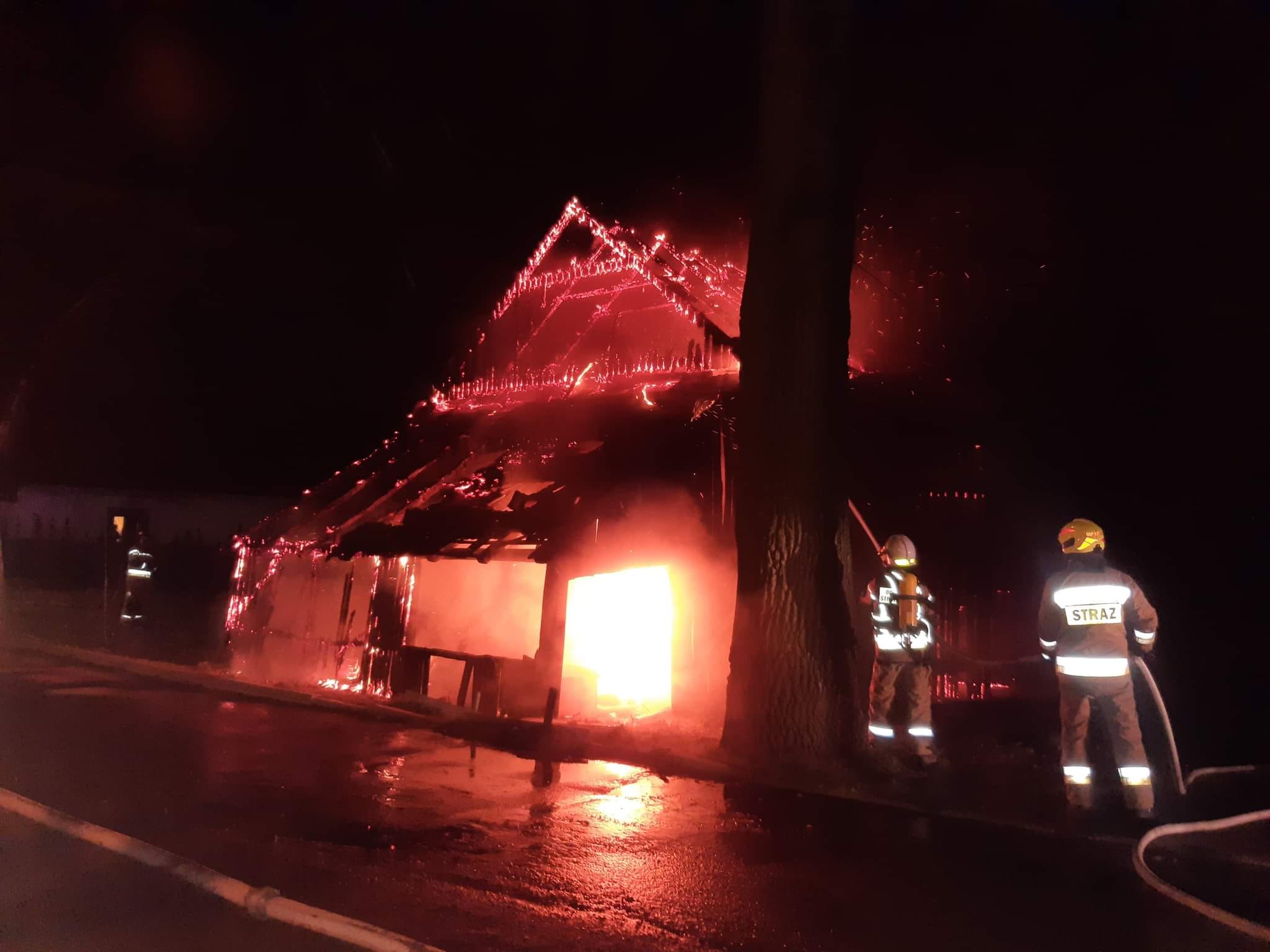 Strażacy w czasie prowadzonej akcji gaśniczej, wynieśli butlę z gazem i zbiornik z paliwem z pomieszczeń murowanych, nieobjętych pożarem. Po ugaszeniu pożaru, rozebrano niestabilne elementy konstrukcji drewnianej. Obiekt sprawdzono kamerą termowizyjną - nie stwierdzono zagrożenia. Działania zakończono o godz. 5:25.