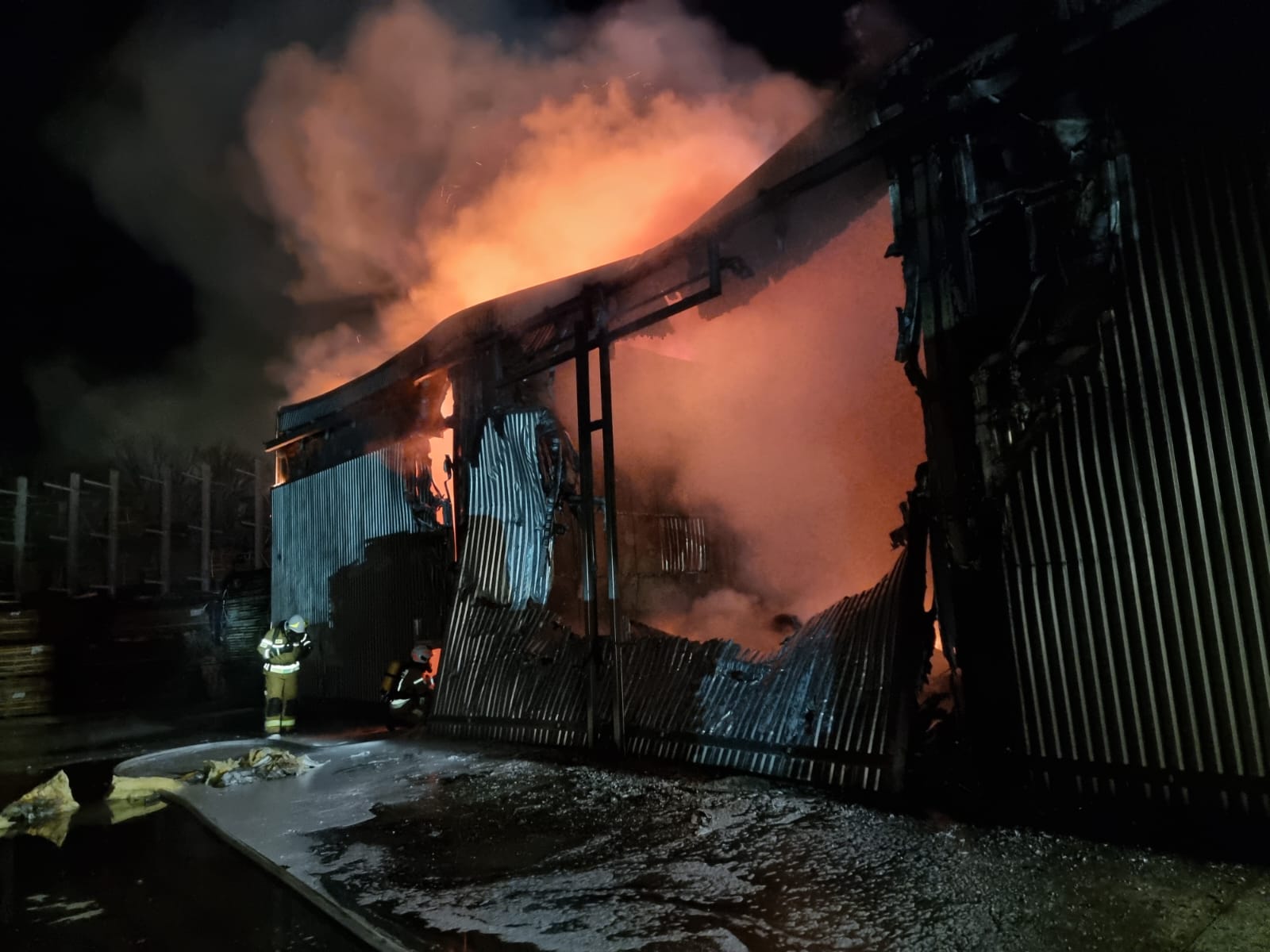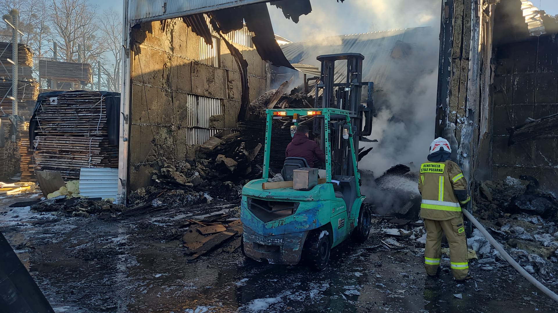 Dalsze działania strażaków polegały na opróżnianiu suszarni z zalegającego nadpalonego drzewa. Przy pomocy pracownika firmy i wózka widłowego, składowane drzewo było wywożone z komory na plac i przelewane wodą. Następnie ustawiono je w bezpiecznym miejscu pod obserwacją pracowników firmy. Na miejsce ściągnięto również ładowarkę. Za jej pomocą dokonano rozbiórki uszkodzonej instalacji grzewczej suszarni, jak i uszkodzonej bramy wjazdowej oraz część konstrukcji poszycia dachowego.