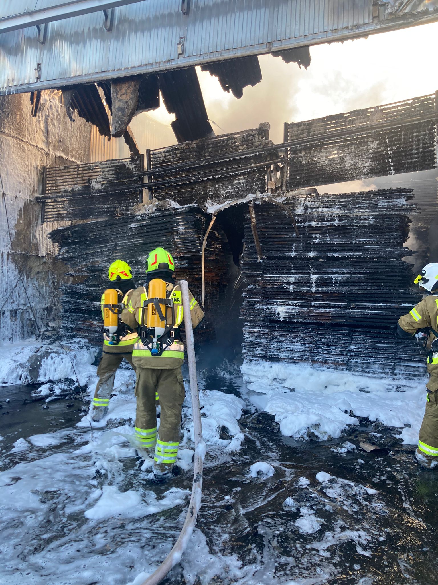 W hali (suszarni) zgromadzone były pryzmy (paczki) przekładanego drewna, co w znaczący sposób utrudniało precyzyjne podawanie środków gaśniczych na materiał palny.