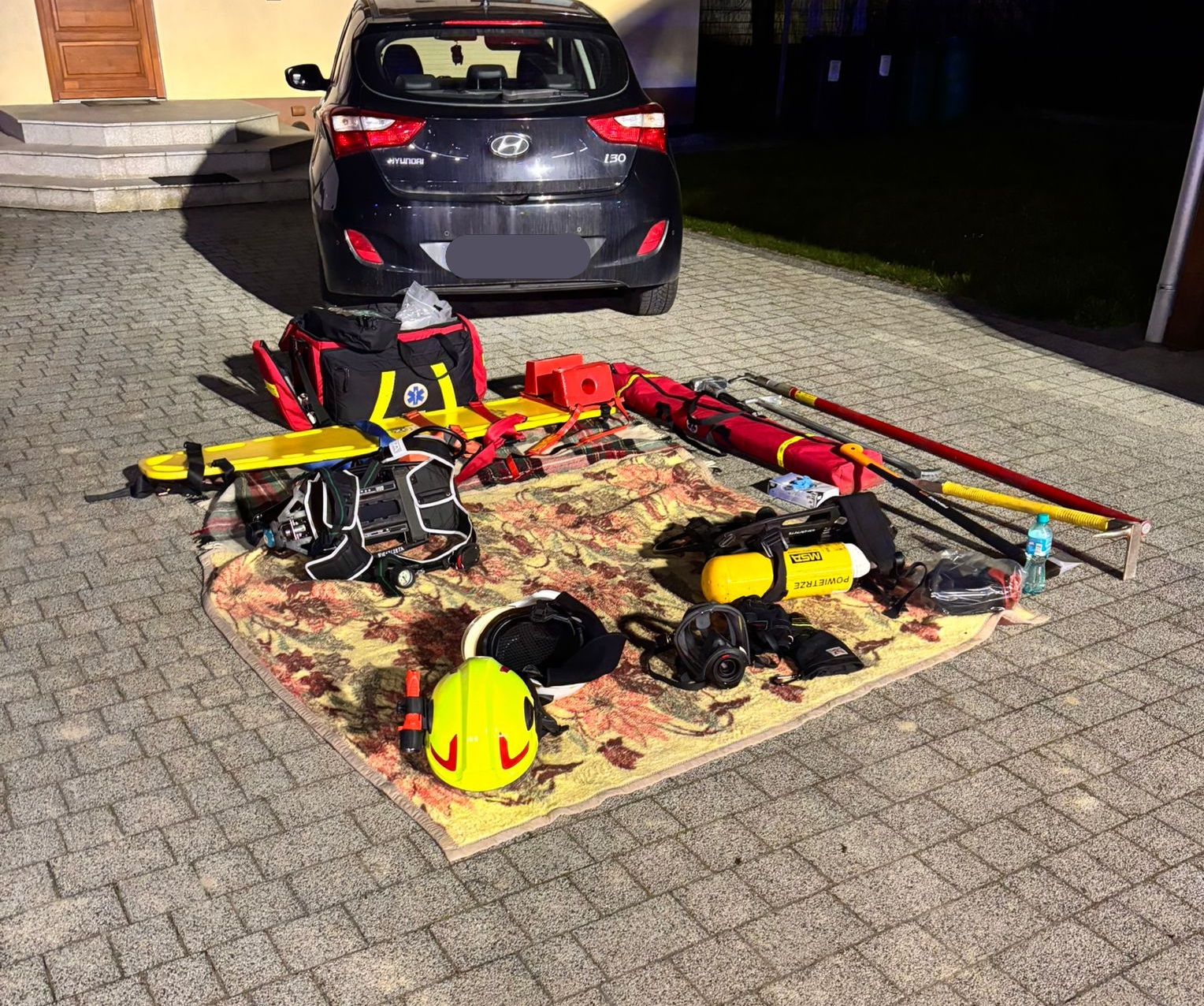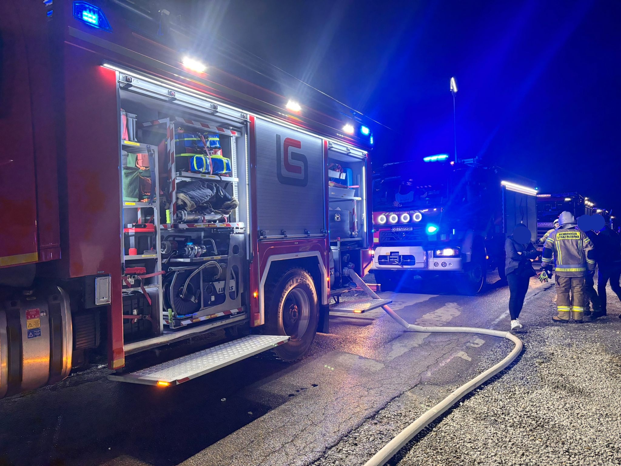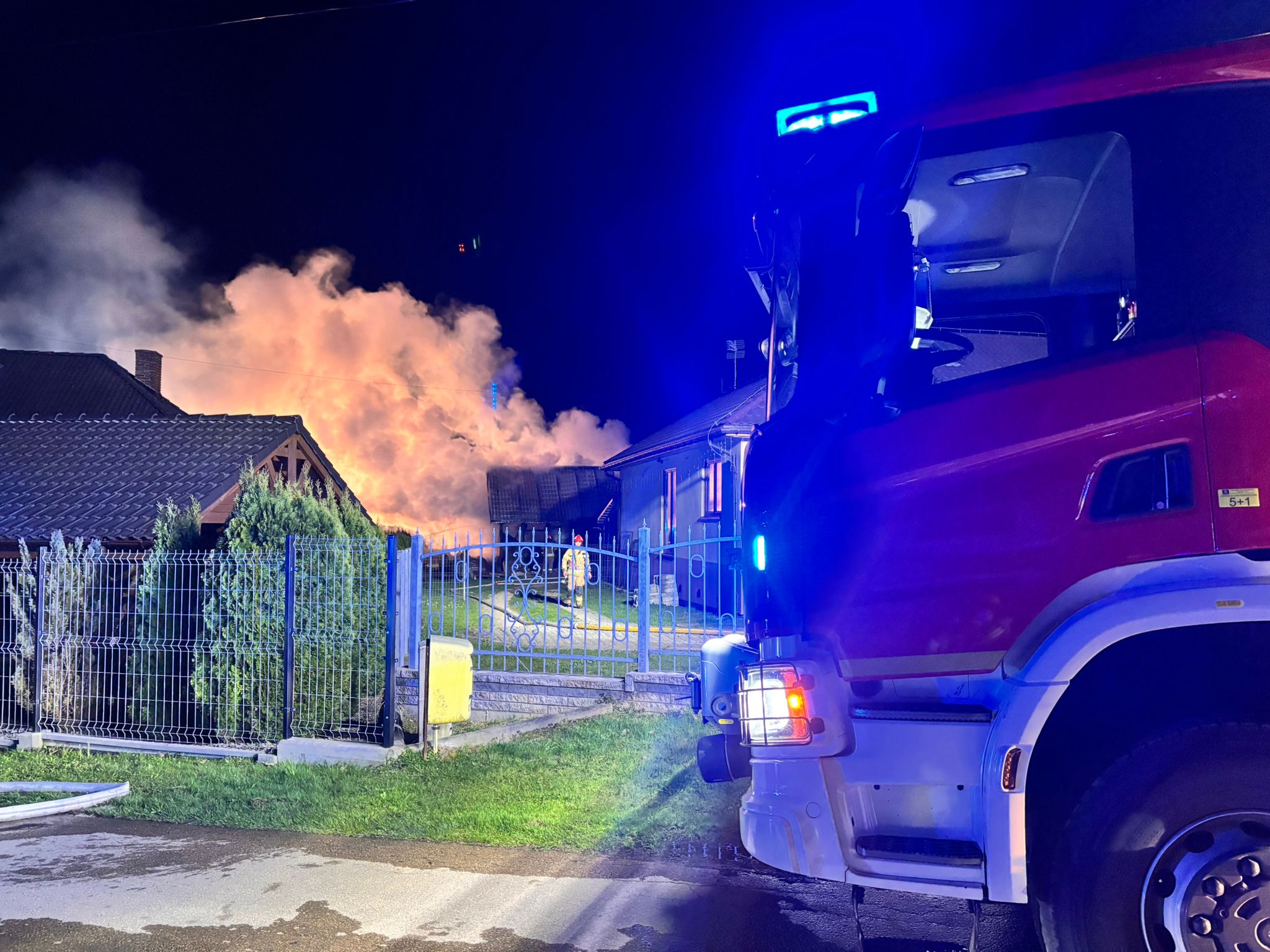 Strażacy prowadzili intensywne działania gaśnicze, podając pięć prądów gaśniczych – dwa skierowane na chłodzenie butli z acetylenem i tlenem oraz trzy w natarciu na objęte ogniem budynki. Teren działań został odpowiednio zabezpieczony, a osoby postronne odsunięto poza strefę zagrożenia.