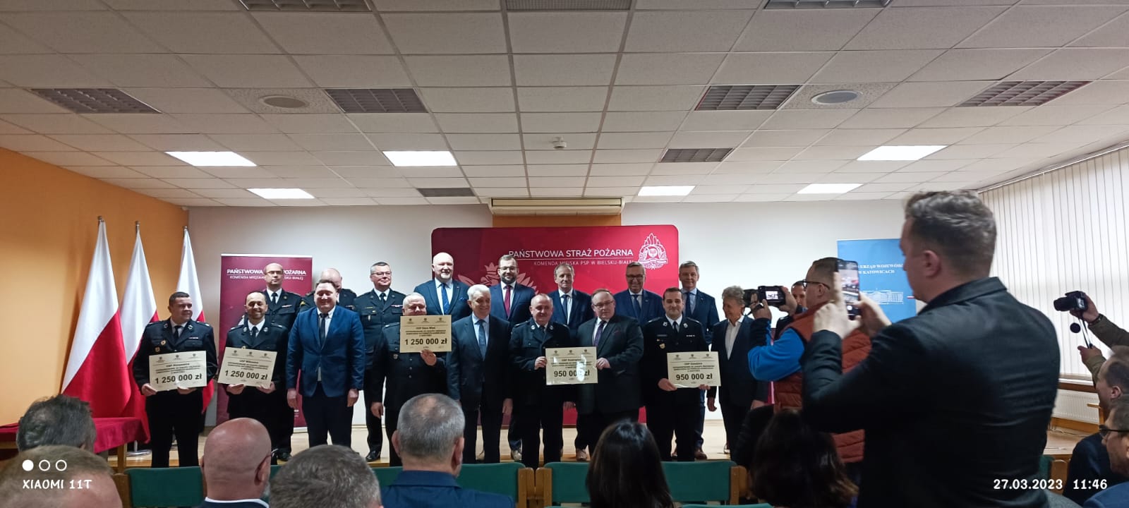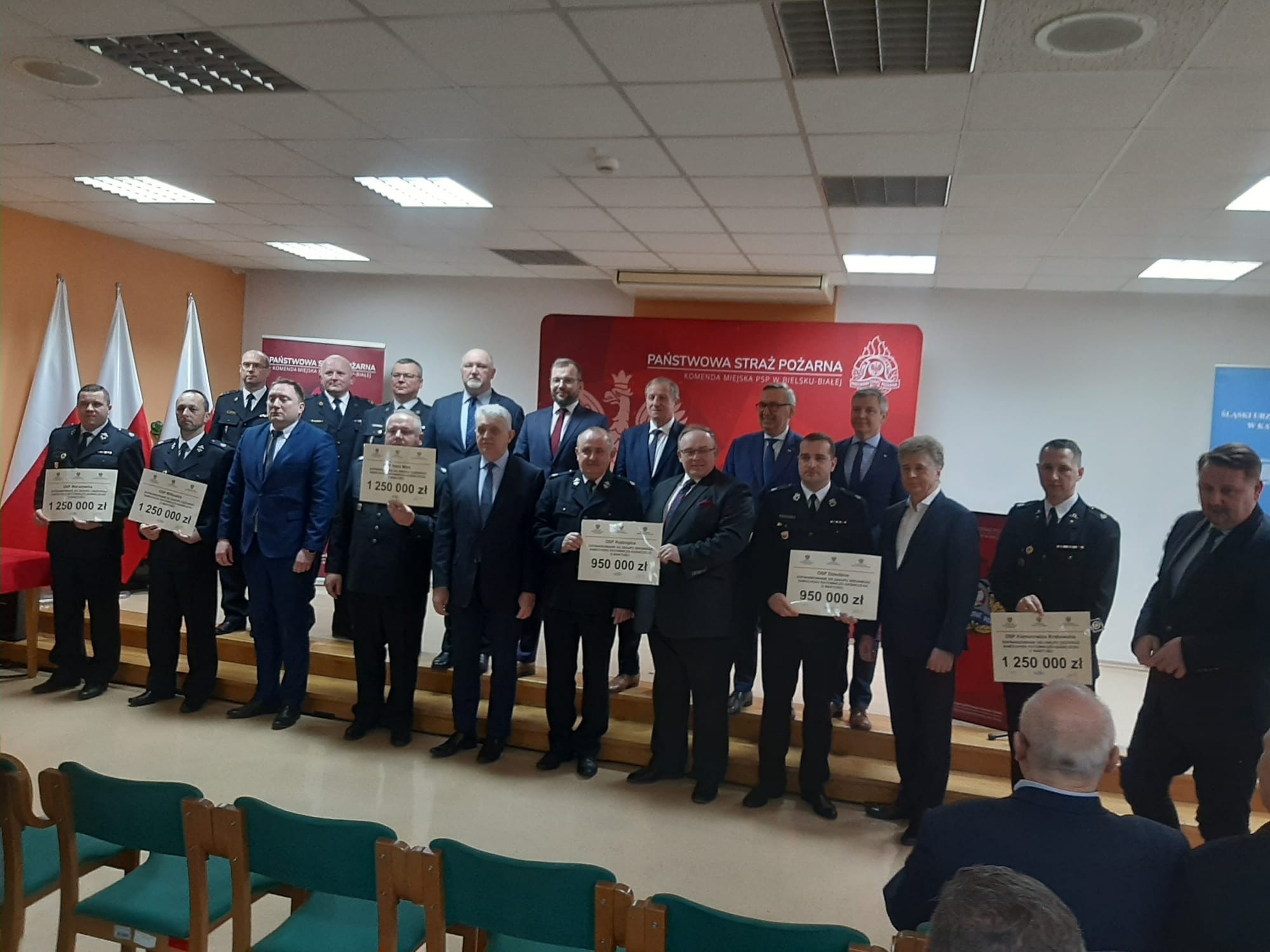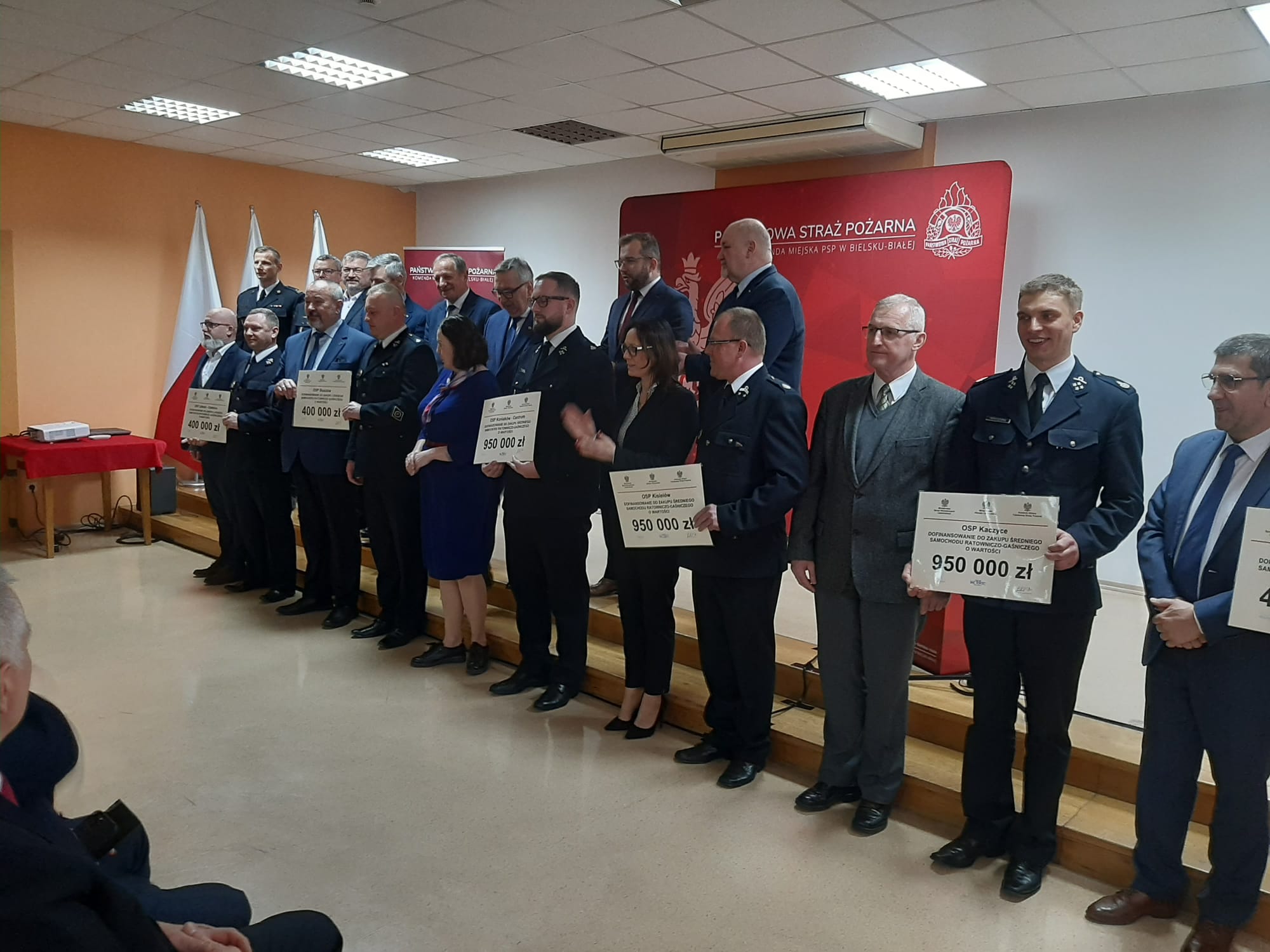 Następnie odbyło się uroczyste przekazanie promes na zakup nowych pojazdów dla OSP z terenu m. Bielsko-Biała, powiatu bielskiego, cieszyńskiego, pszczyńskiego i żywieckiego. Promesy trafiły do: