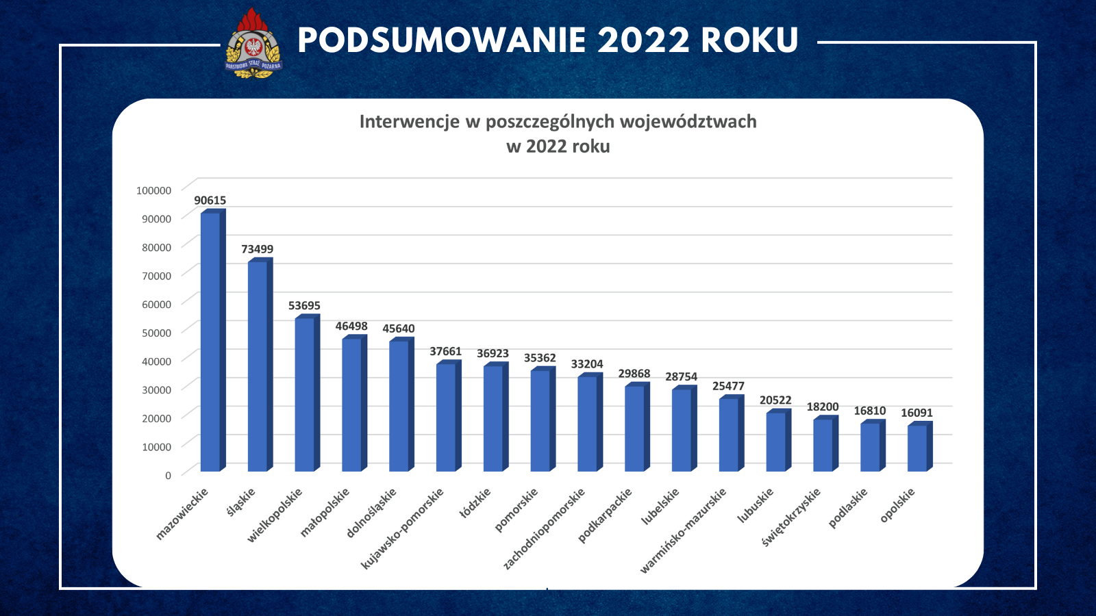 Jeśli chodzi o interwencje Państwowej Straży Pożarnej w całym kraju to w 2022 roku strażacy odnotowali ponad 608 tysięcy interwencji, co jest największą liczbą zdarzeń notowaną w 30-letniej historii Państwowej Straży Pożarnej. Jest to o 29 102 interwencje więcej niż w 2021 roku. Ponadto, strażacy interweniowali o 21% częściej niż pięć lat temu kiedy odnotowano 502 055 zdarzeń oraz o 36% więcej razy niż w 2016 roku kiedy miały miejsce 447 003 zdarzenia.