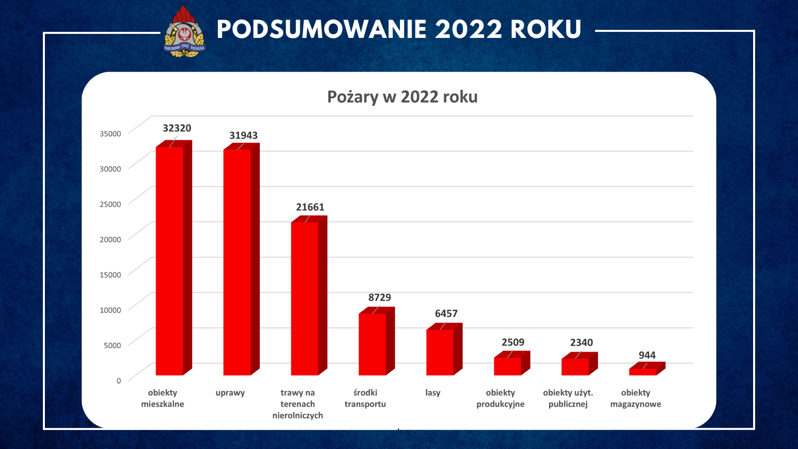 Ubiegły rok to 135 968 pożarów, 424 956 miejscowe zagrożenia oraz 47 895 fałszywych alarmów. Przez cały 2022 rok powstało 32 320 pożarów w obiektach mieszkalnych, niestety 387 osób straciło życie a 2338 odniosło obrażenia. Ponadto, w związku z emisją tlenku węgla, strażacy odnotowali 4686 interwencji, w których 68 osób uległo śmiertelnemu zatruciu czadem, a 1224 uległy podtruciu. Od rozpoczęcia sezonu grzewczego w październiku 2022 roku strażacy interweniowali 1298 razy w związku z emisją czadu. W wyniku zatrucia tlenkiem węgla 34 osoby straciły życie, a 429 odniosło obrażenia.