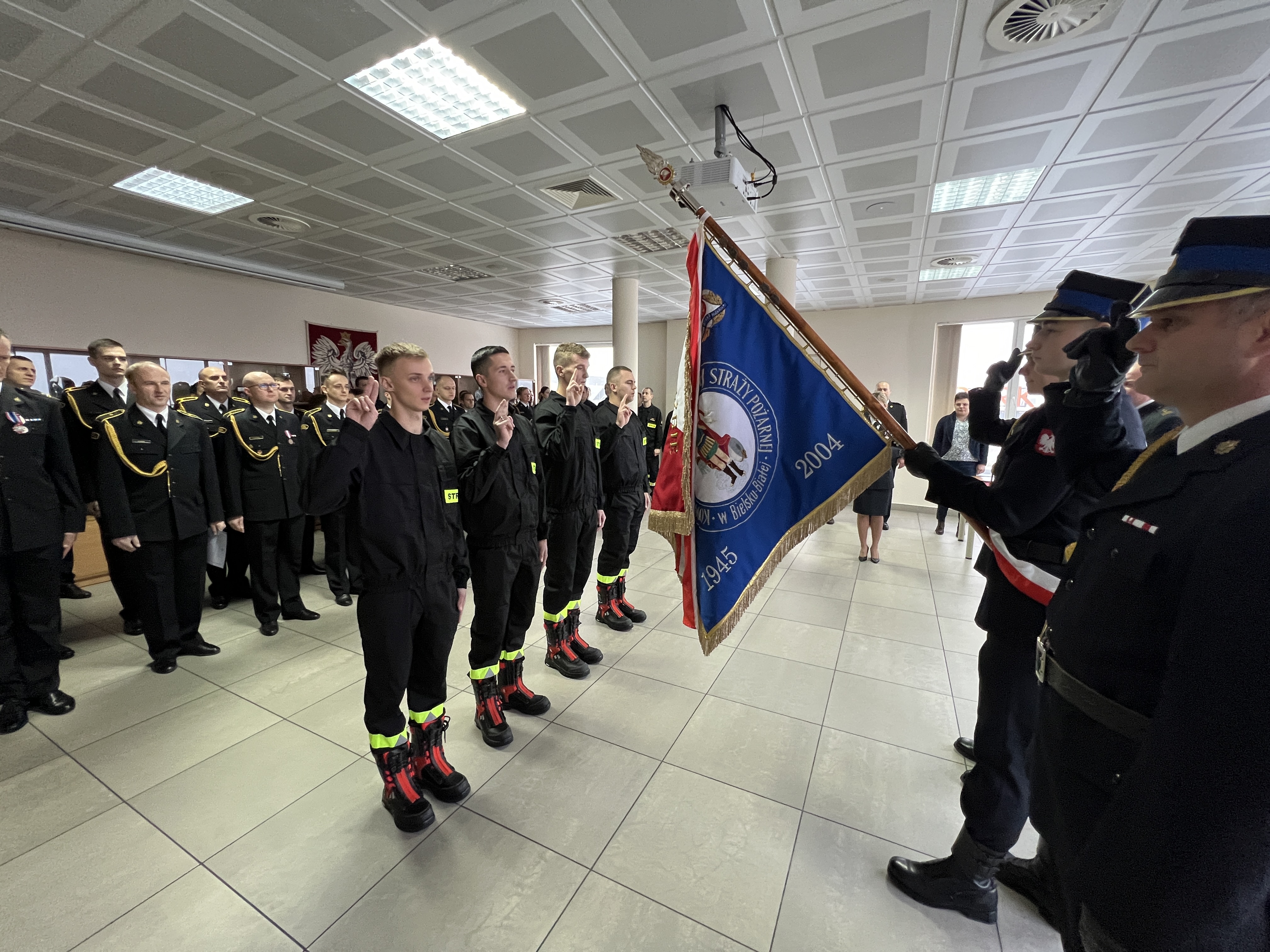 Ślubowanie to bardzo uroczysta i podniosła chwila w życiu zawodowym każdego strażaka. Podejmując służbę w Państwowej Straży Pożarnej strażak składa ślubowanie według następującej roty: “Ja, obywatel Rzeczypospolitej Polskiej, świadom podejmowanych obowiązków strażaka, uroczyście ślubuję być ofiarnym i mężnym w ratowaniu zagrożonego życia ludzkiego i wszelkiego mienia – nawet z narażeniem życia. Wykonując powierzone mi zadania, ślubuję przestrzegać prawa, dyscypliny służbowej oraz wykonywać polecenia przełożonych. Ślubuję strzec tajemnic związanych ze służbą, a także honoru, godności i dobrego imienia służby oraz przestrzegać zasad etyki zawodowej”.