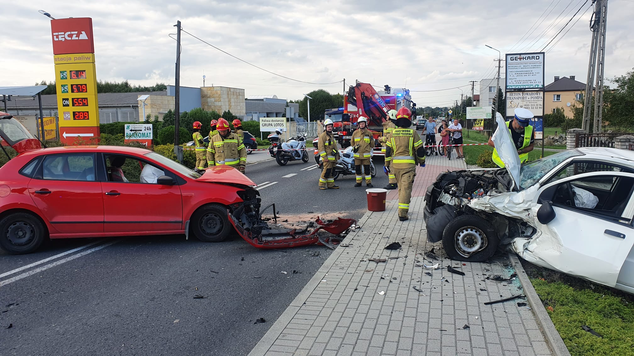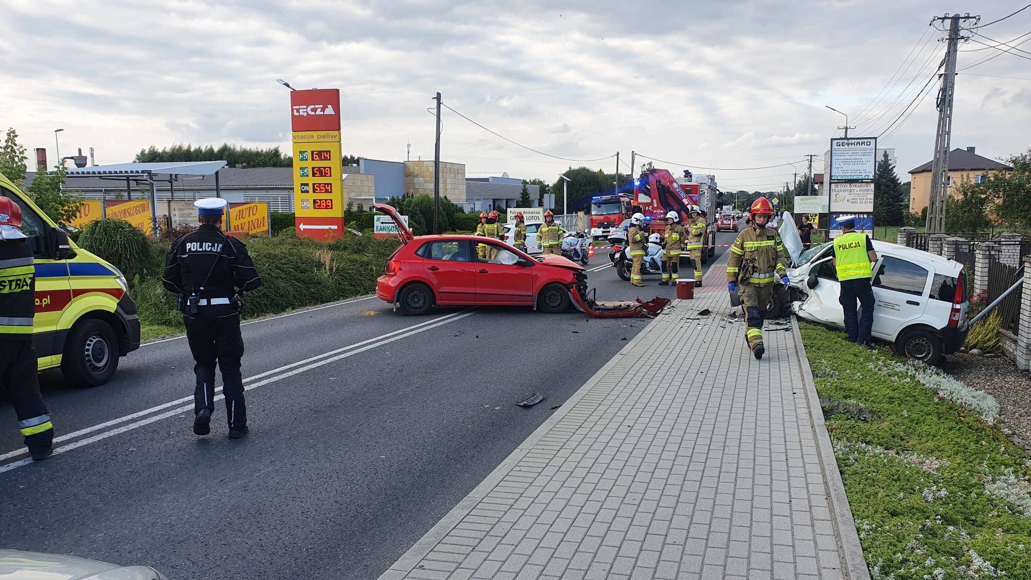 Kiedy jednostki przybyły na miejsce zdarzenia, potwierdzono zderzenie czołowe pojazdów. Kierujący pojazdami zostali przebadani przez obecny na miejscu zdarzenia zespół ratownictwa medycznego. Ratownicy podjęli decyzję o hospitalizacji 61-letniego kierowcy samochodu marki Volkswagen. Działania ratowników polegały na zabezpieczeniu miejsca zdarzenia, odłączeniu akumulatorów, usunięciu zagrożenia chemiczno-ekologicznego oraz usunięciu elementów karoserii i szkła z rozbitych pojazdów. Obecna na miejscu policja prowadzi dalsze czynności dochodzeniowe. W następstwie wypadku uszkodzony został znak drogowy znajdujący się przy poboczu ulicy. Działania zakończono o godz. 19:31.