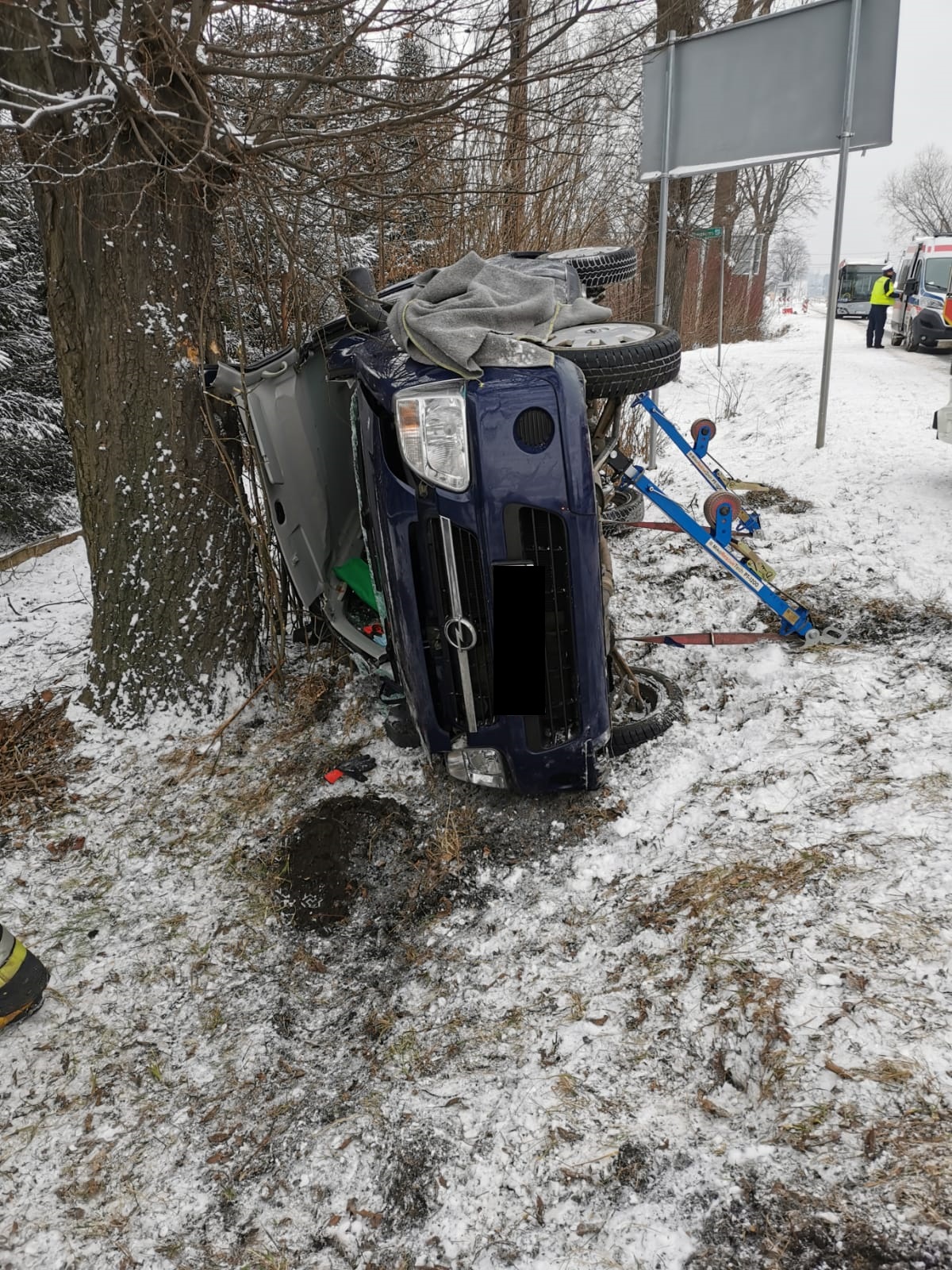 Kiedy jednostki straży pożarnej przybyły na miejsce zdarzenia, samochód osobowy marki Opel Agila leżał na prawym boku w rowie. W pojeździe znajdował się przytomny mężczyzna, który nie był w stanie wydostać się samodzielnie z pojazdu.