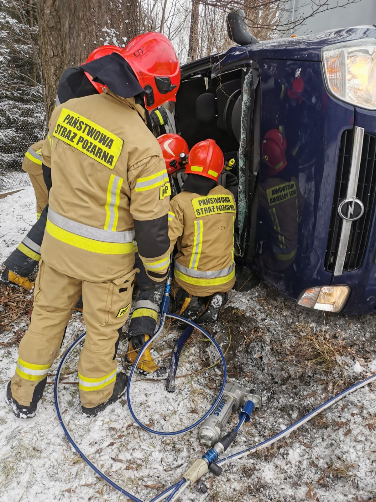 Strażacy zabezpieczyli miejsce zdarzenia oraz zablokowali ruch w obu kierunkach. Następnie przy pomocy klinów dokonano stabilizacji pojazdu i przystąpiono do uwalniania zakleszczonego mężczyzny przy użyciu specjalistycznych narzędzi hydraulicznych. Poszkodowanego zabrał zespół pogotowia ratunkowego do szpitala. Działania zakończono o godz. 12:12.