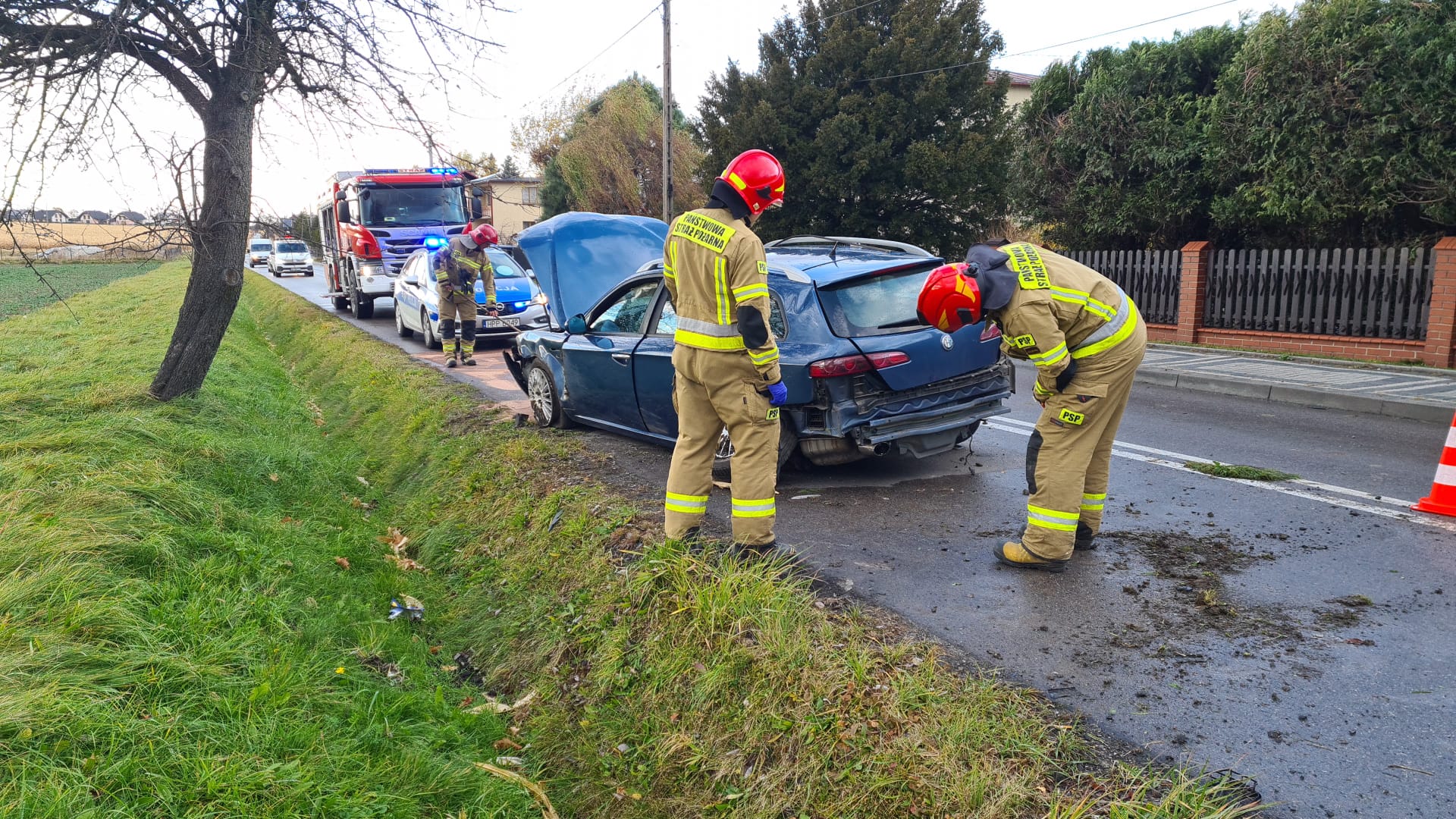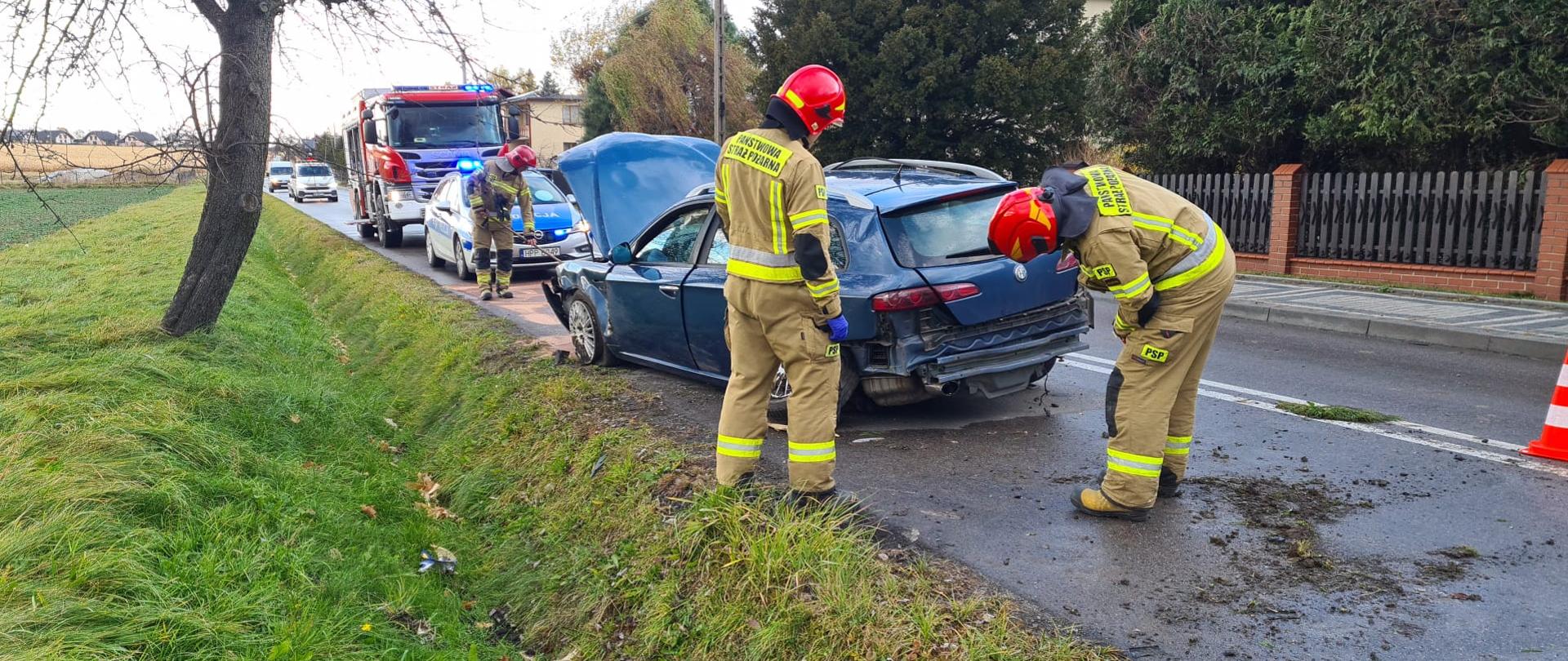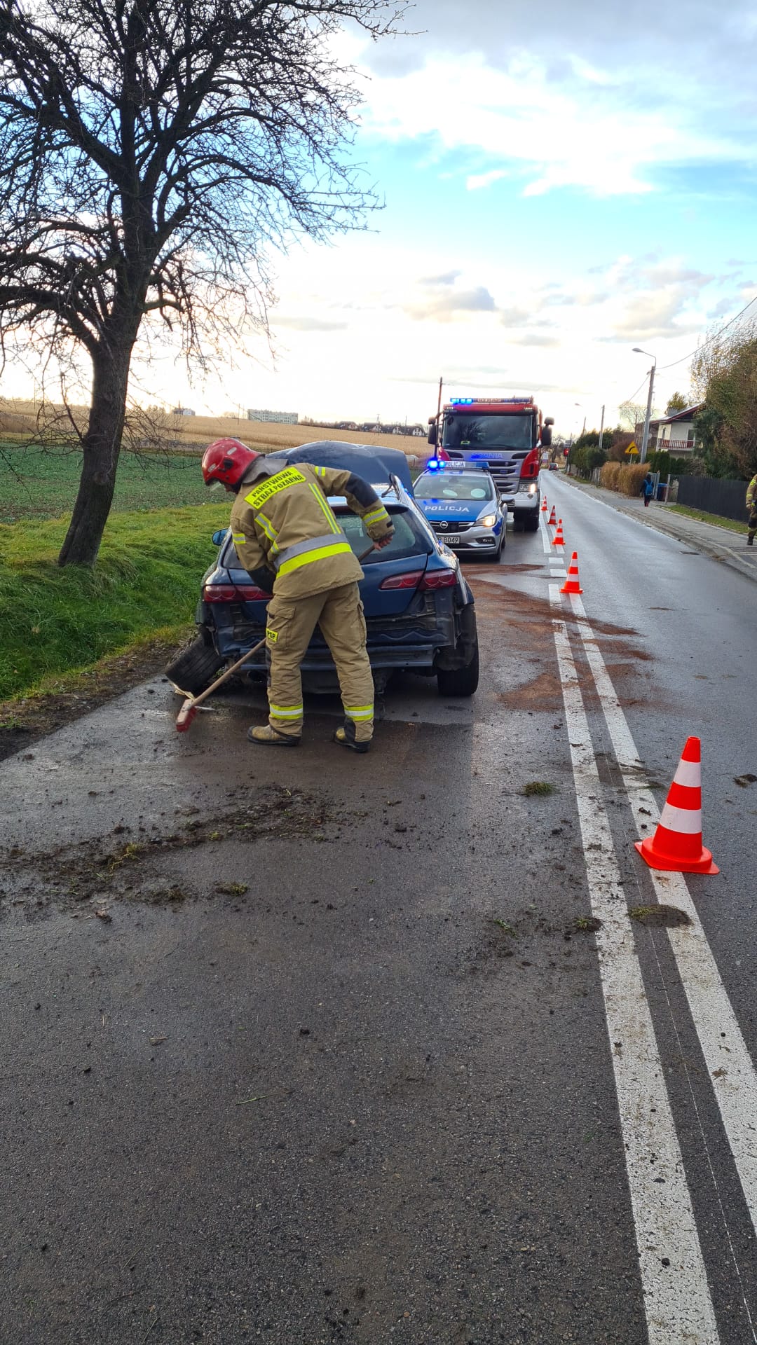 Kiedy jednostki straży pożarnej przybyły na miejsce zdarzenia, w pojeździe nie było osób poszkodowanych. Obecna na miejscu policja prowadzi czynności, mające na celu zlokalizowanie kierującego samochodem. Strażacy zabezpieczyli miejsce zdarzenia, odłączyli akumulator, a następnie usunęli powstały wyciek oleju przy użyciu sorbentu. Działania zakończono o godz. 17.00.