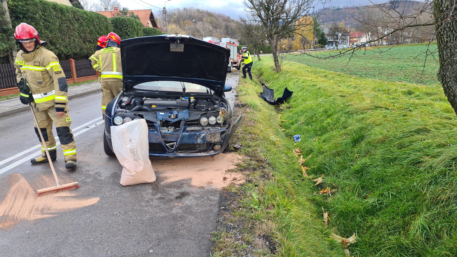 Wczoraj przed godziną piętnastą straż pożarna została wezwana do zdarzenia drogowego z udziałem samochodu osobowego marki Alfa Romeo. Prawdopodobnie podczas jazdy, kierowca Alfy Romeo uderzył w barierki energochłonne i przejechał na drugą stronę jezdni, po czym wpadł do rowu z którego się odbił, uszkadzając gałąź na wysokości ok 1,5m.