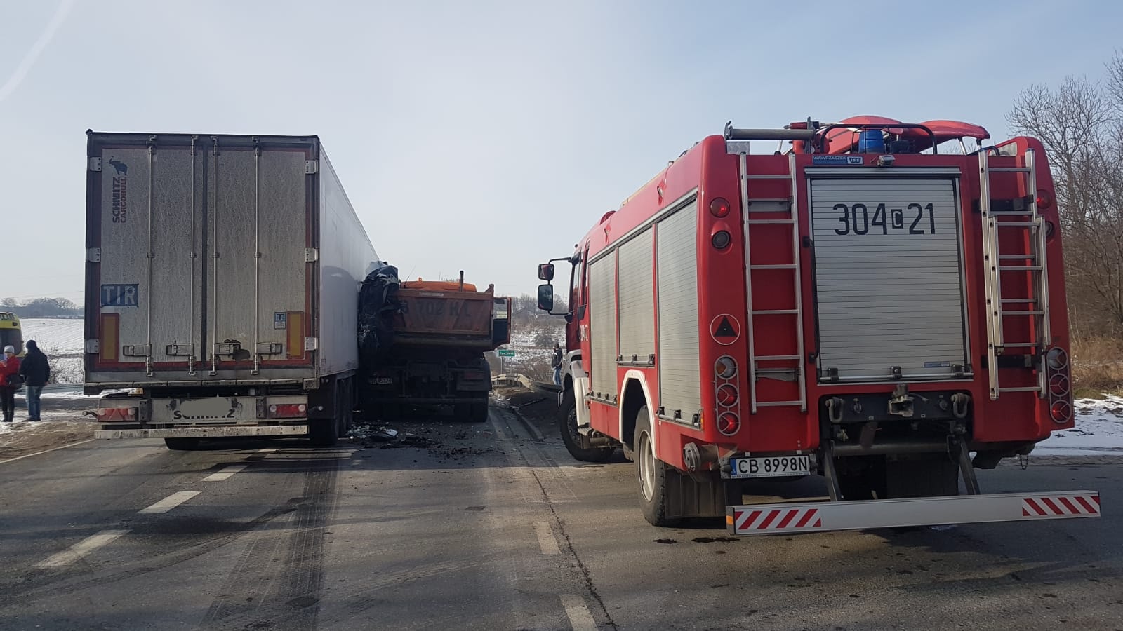 W dniu 1.02.2021 roku o godz. 11:38 do Stanowiska Kierowania Komendanta Miejskiego Państwowej Straży Pożarnej w Bydgoszczy wpłynęło zgłoszenie mówiące o zderzeniu dwóch aut ciężarowych oraz auta osobowego na Drodze Krajowej nr 10 w miejscowości Pawłówek. Działania przybyłych na miejsce zastępów polegały na zabezpieczeniu miejsca zdarzenia. Jedna osoba została przebadana przez Zespół Ratownictwa Medycznego i pozostała na miejscu. Ruch na czas działań był całkowicie zablokowany.