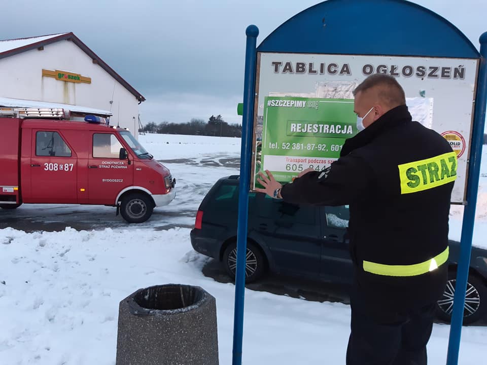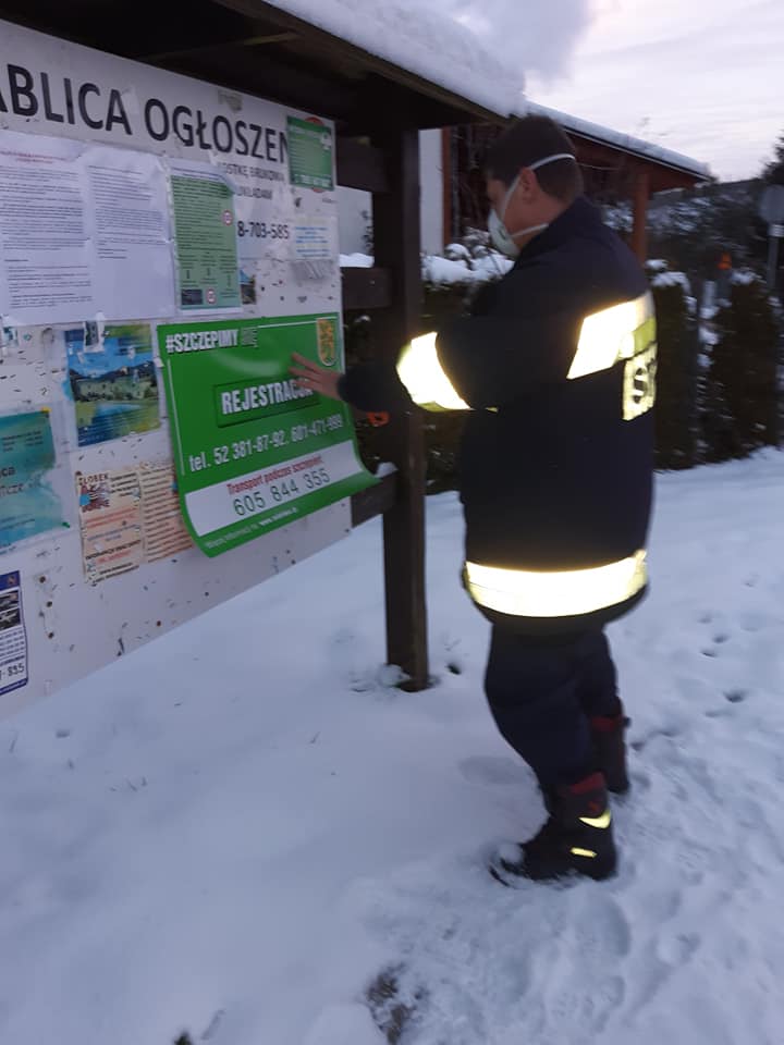 W ostatnich dniach strażacy ochotnicy z terenu powiatu bydgoskiego wspomagali samorządy terytorialne w działaniach informacyjnych odnoszących się do realizacji Narodowego Programu Szczepień. Na terenie gminy Osielsko Ochotnicza Straż Pożarna Bydgoszcz z siedzibą w Myślęcinku rozwieszała w miejscach ogólnodostępnych plakaty informujące mieszkańców o szczegółach szczepień. Na plakatach umieszczono również numery telefonów, gdzie można uzyskać wszelkie szczegóły odnośnie przebiegu akcji szczepień.