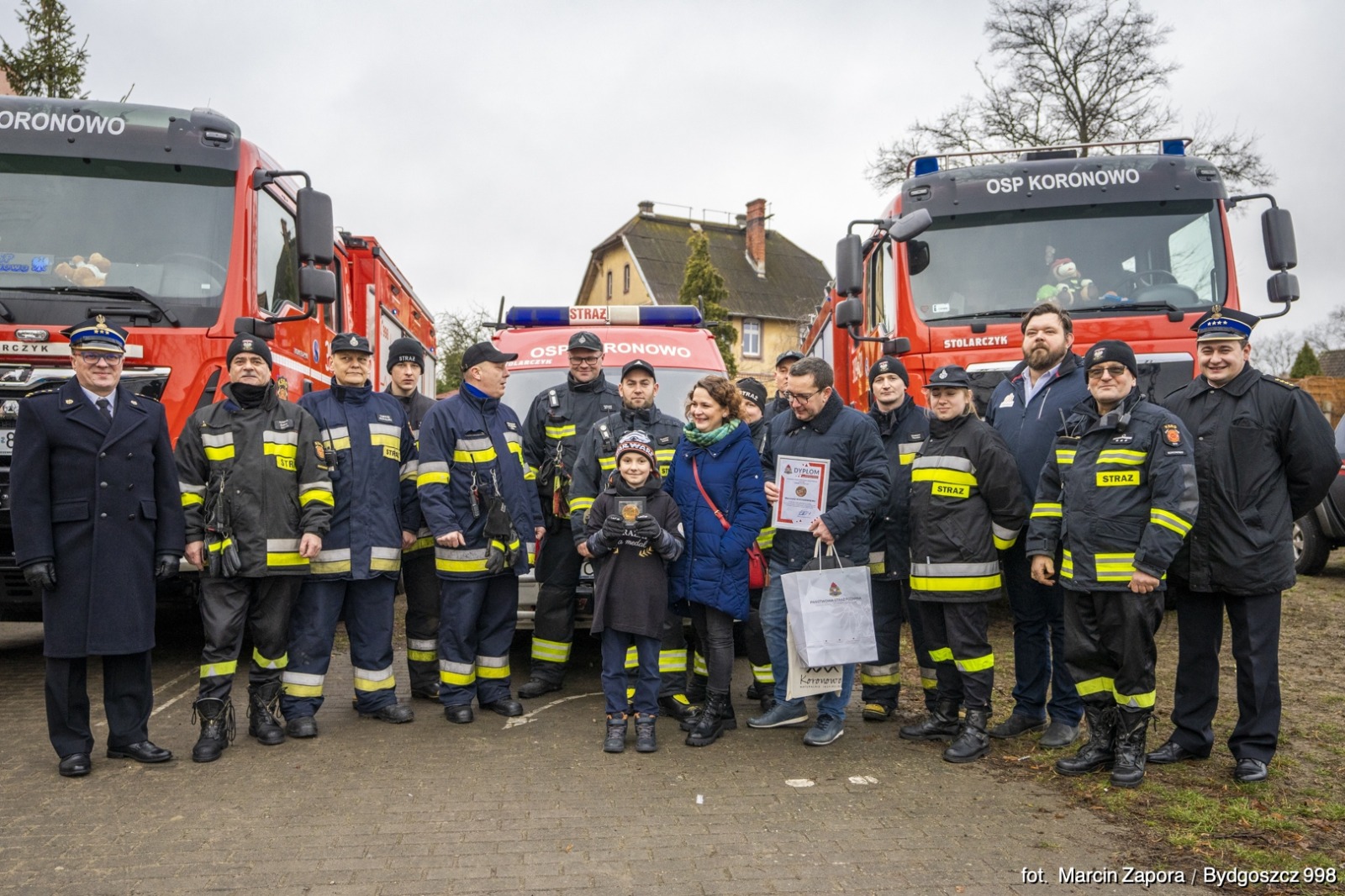 13 stycznia 2022 roku na boisku Szkoły Podstawowej nr 2 im. Jana Pawła II w Koronowie miała miejsce niezwykła uroczystość. Podczas zbiórki wręczono odznakę "Iuvenis Forti" 10-letniemu Marcinowi Kochańskiemu. Chłopiec 4 grudnia 2021 roku zgłosił pożar przyczepy kempingowej, zdarzenie miało miejsce przy ul. Leśnej w Koronowie około godziny 19:30. Marcin wyróżnił się nie tylko godną do naśladowania postawą obywatelską, ale przede wszystkim pełnym opanowaniem i pewnością siebie w przekazywaniu informacji podczas zgłaszania niebezpiecznego zdarzenia. Dzięki jego postawie udało się strażakom szybko dotrzeć do miejsca zdarzenia i rozpocząć skuteczne działania. Rozwinięty pożar zagrażał pobliskim budynkom mieszkalnym. Postawa chłopca stanowi wzór do naśladowania i zasługuje na najwyższe słowa uznania. Odznaka "Iuvenis Forti" jest nadawana przez Komendanta Głównego Państwowej Straży Pożarnej, przyznawana jest młodym ludziom, którzy swoją wzorową, godną do naśladowania postawą przyczynili się do uratowania życia i zdrowia, wykazując się między innymi dzielnością i opanowaniem w sytuacji niebezpiecznej. W te słowa w pełni wpisuje się postawa 10-letniego Marcina z Koronowa. W uroczystej zbiórce uczestniczyli uczniowie, nauczyciele, dyrekcja, rodzice Marcina, przedstawiciele władz samorządowych z burmistrzem Koronowa Patrykiem Mikołajewskim na czele, st. bryg. mgr inż. Jarosław Jakub Koprowski - Zastępca Komendanta Miejskiego PSP w Bydgoszczy, dh Mirosław Wiese – Komendant Miejsko-Gminny OSP oraz strażacy Państwowej i Ochotniczej Straży Pożarnej.