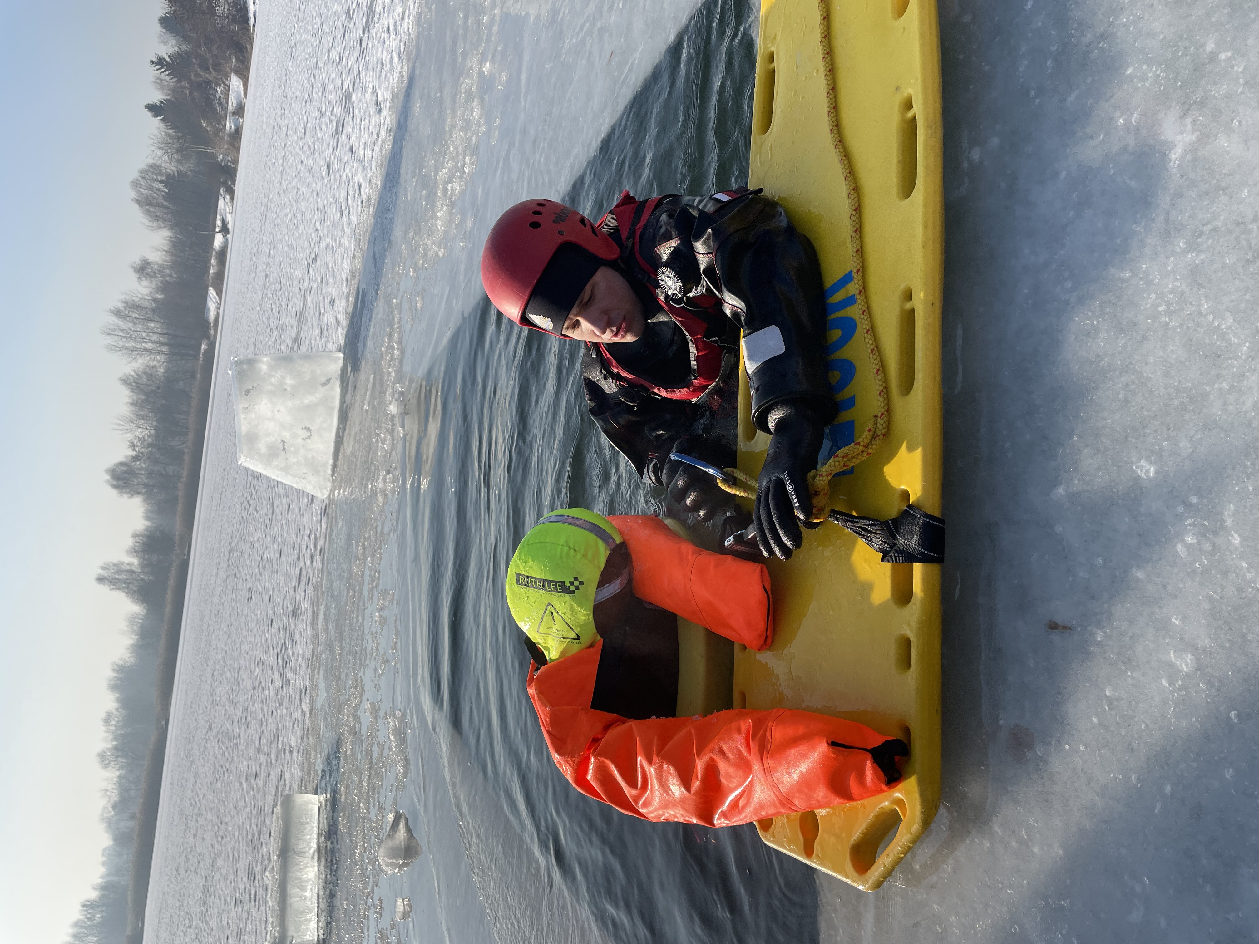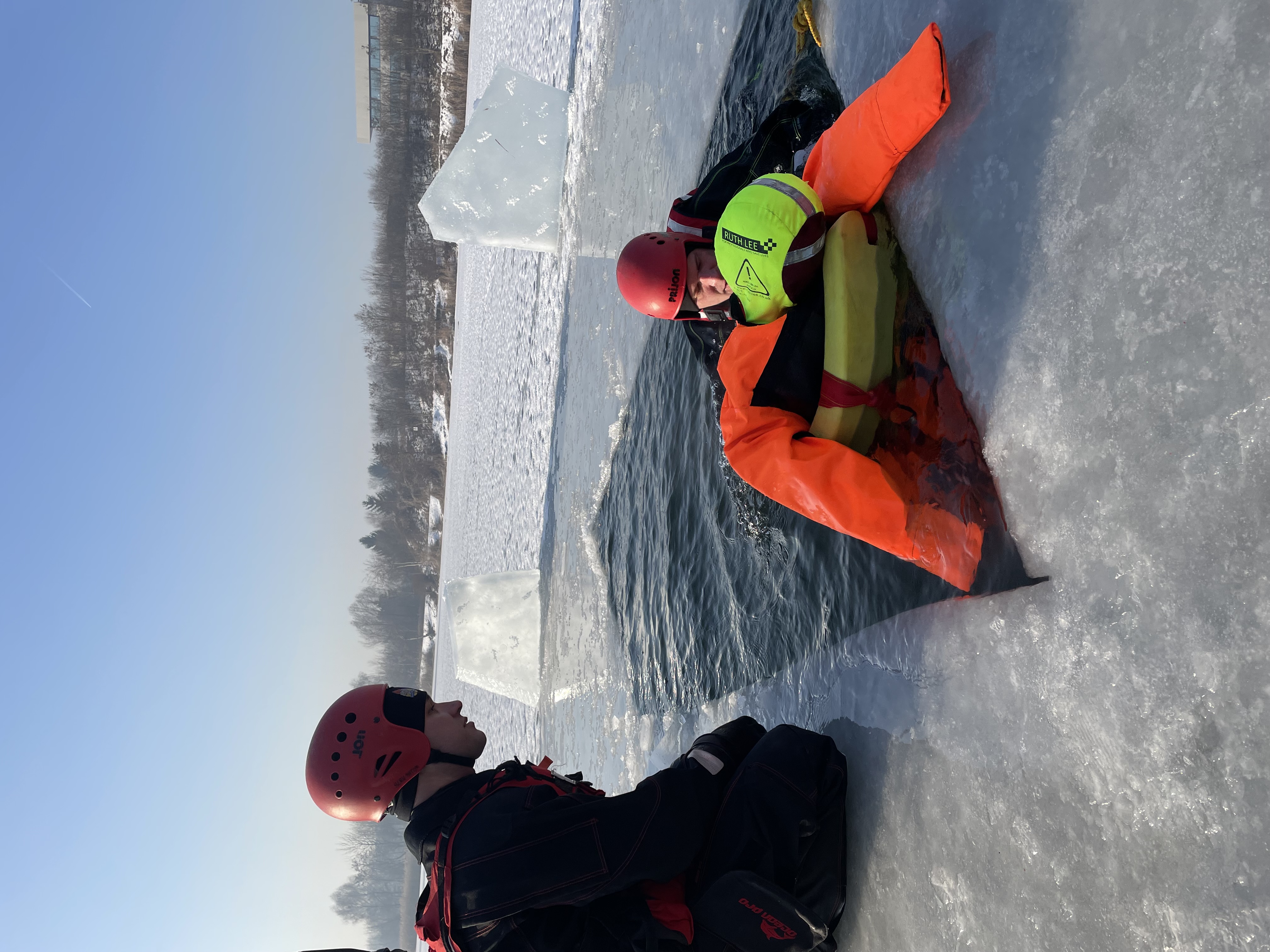 Strażacy ćwiczyli podejmowanie osób z tafli lodu, z wody po załamaniu się tafli lodu oraz techniki związane z samoratowaniem.
