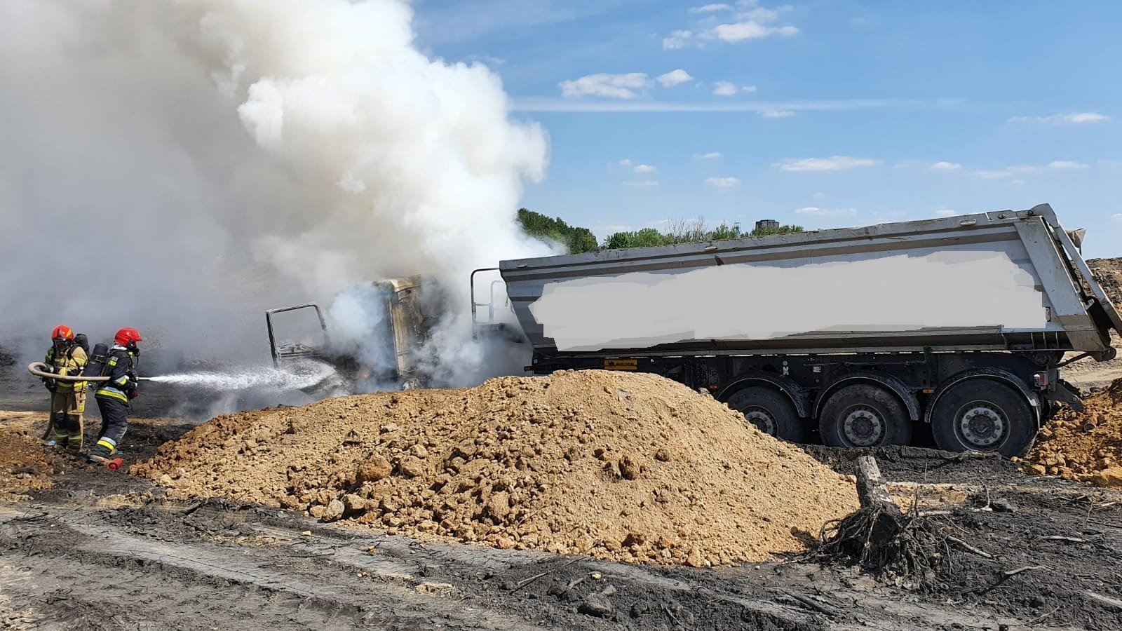 Po przybyciu na miejsce zdarzenia stwierdzono, że pożarem całkowicie objęty jest ciągnik siodłowy, do którego podpięta jest naczepa wypełniona ziemią.