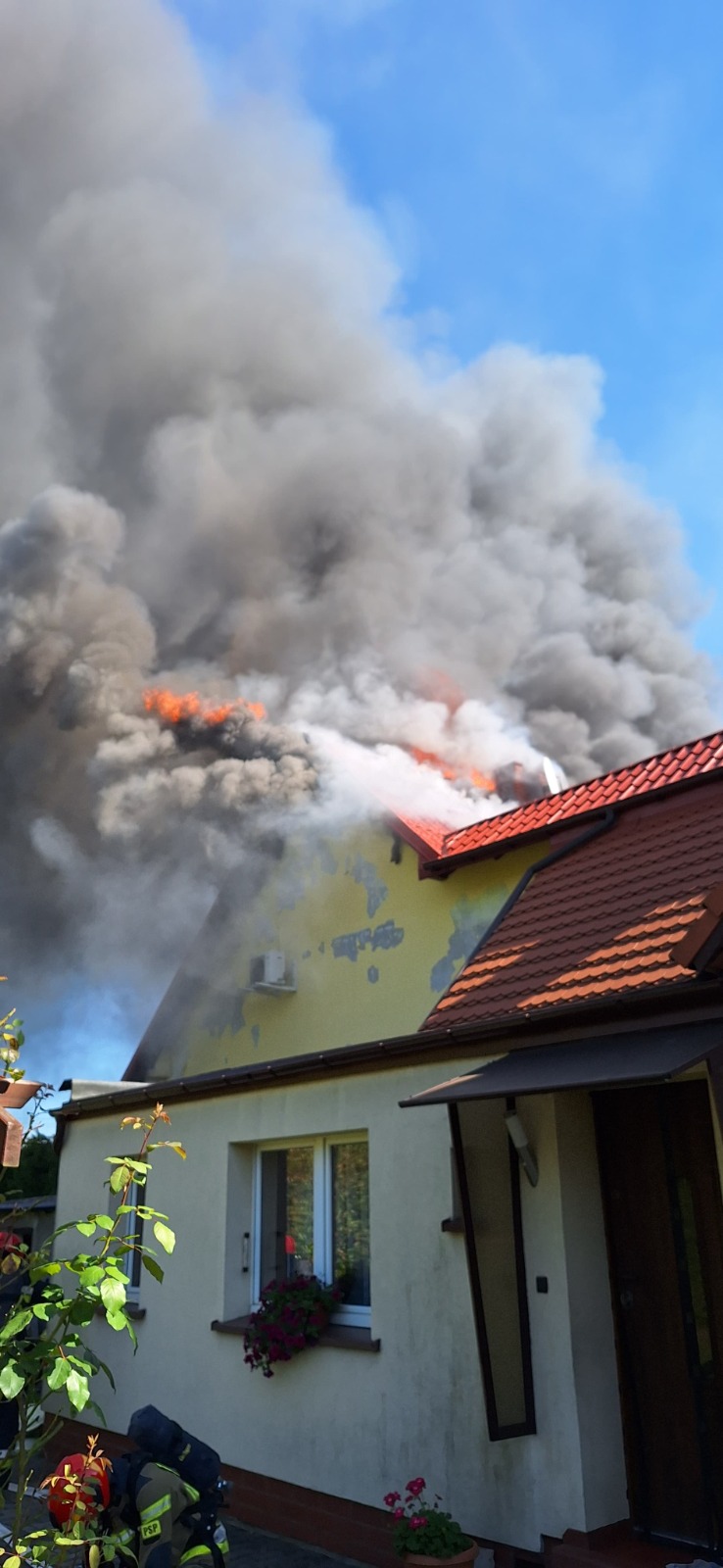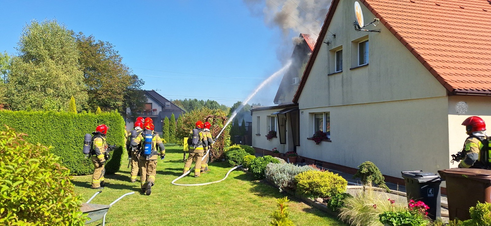 Po przybyciu na miejsce zdarzenia stwierdzono, że pożarem objęta jest elewacja na jednej ze ścian, poddasze oraz dach domu jednorodzinnego wraz z zainstalowaną na nim instalacją fotowoltaiczną. Mieszkańcy budynku znajdowali się na zewnątrz.