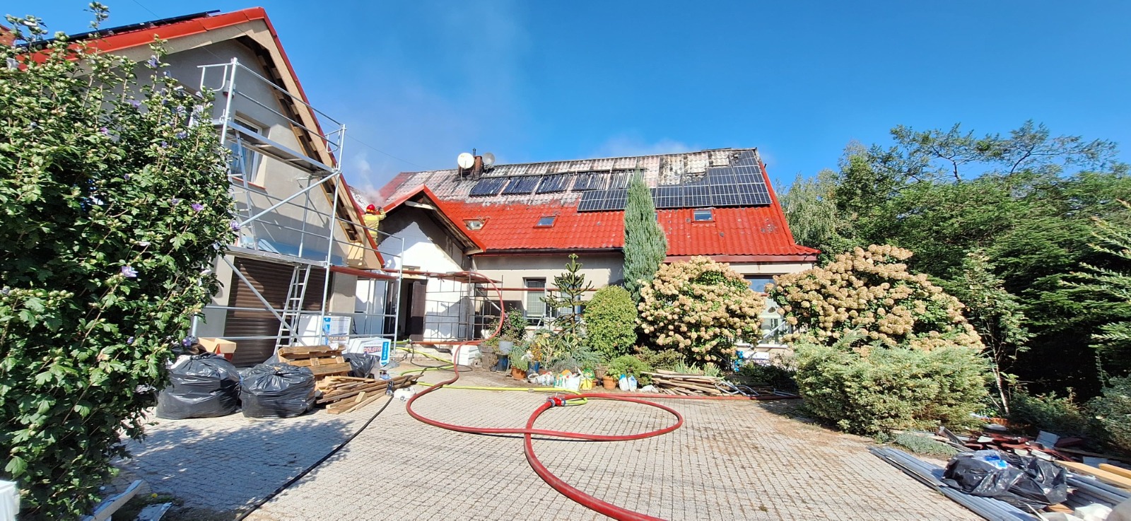 Od właściciela budynku otrzymano informację, że przed przybyciem straży odłączył media i falownik instalacji fotowoltaicznej. Działania straży polegały na zabezpieczeniu miejsca zdarzenia i podaniu trzech prądów wody z zewnątrz na palący się dach budynku oraz jednego prądu wody od wewnątrz budynku na poddasze. Pożar ugaszono, budynek oddymiono i sprawdzono. Brak poszkodowanych.