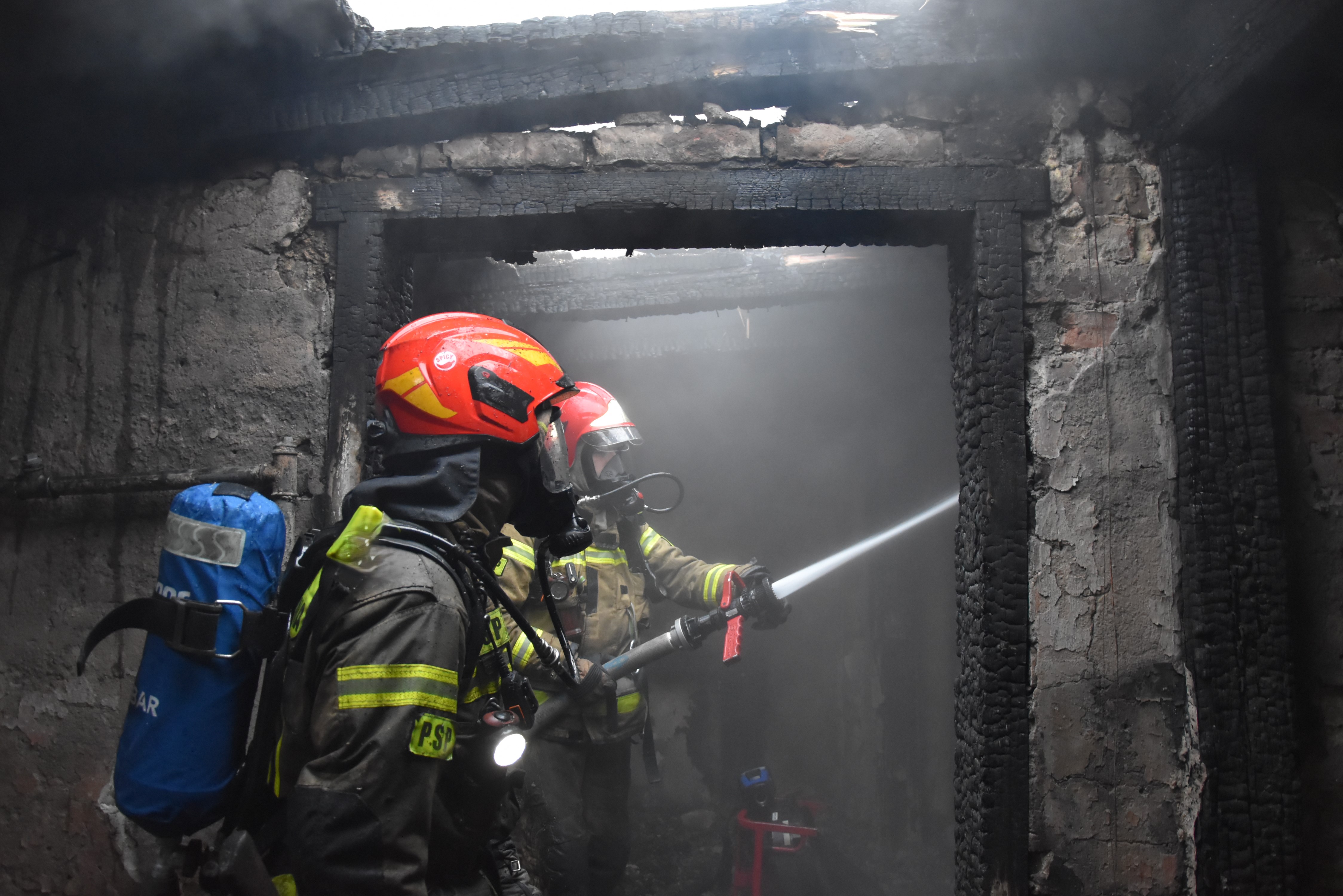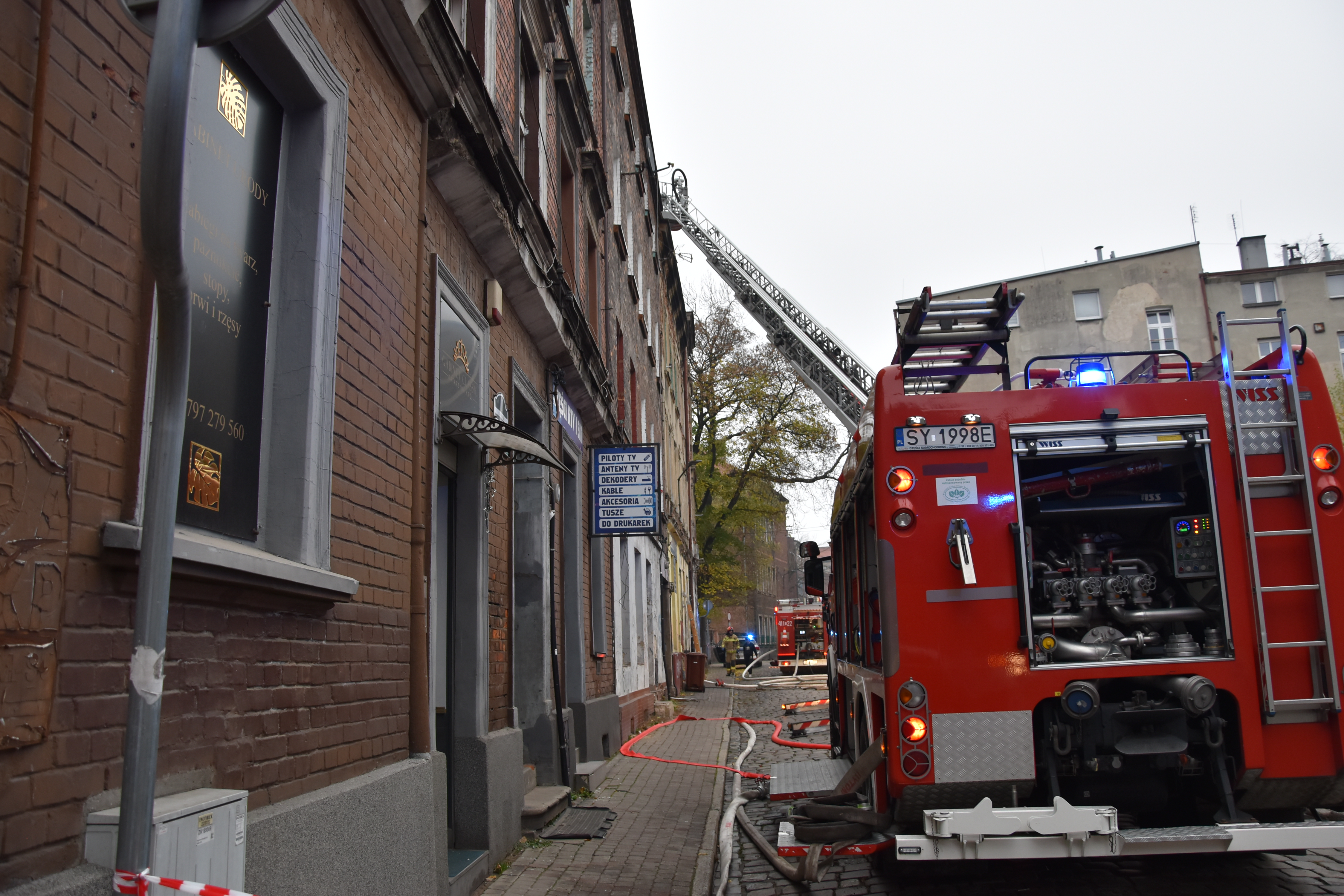 Po przybyciu na miejsce zdarzenia stwierdzono, że z okien na poddaszu budynku (cztery kondygnacje) wydobywa się dym. Obecni na miejscu funkcjonariusze Policji pomogli w ewakuacji pięciu osób z zamieszkałych lokali znajdujących się na drugiej kondygnacji przed przybyciem straży. Pozostałe lokale w budynku to pustostany.
