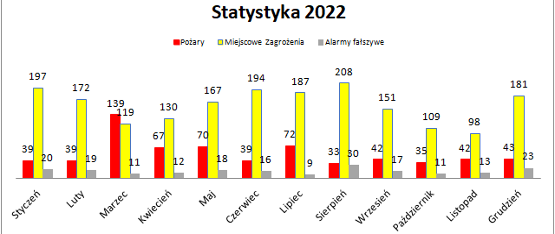 - 199 alarmów fałszywych (w tym: 106 w dobrej wierze, 73 z instalacji wykrywania i 20 złośliwych)