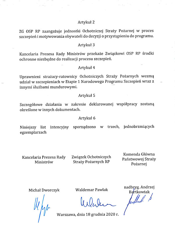 18 grudnia 2020 roku w siedzibie Zarządu Głównego Związku Ochotniczych Straży Pożarnych Rzeczypospolitej Polskiej odbyło się spotkanie Michała Dworczyka, szefa Kancelarii Prezesa Rady Ministrów z nadbryg. Andrzejem Bartkowiakiem, komendantem głównym PSP i dh. Waldemarem Pawlakiem prezesem ZG ZOSP RP.