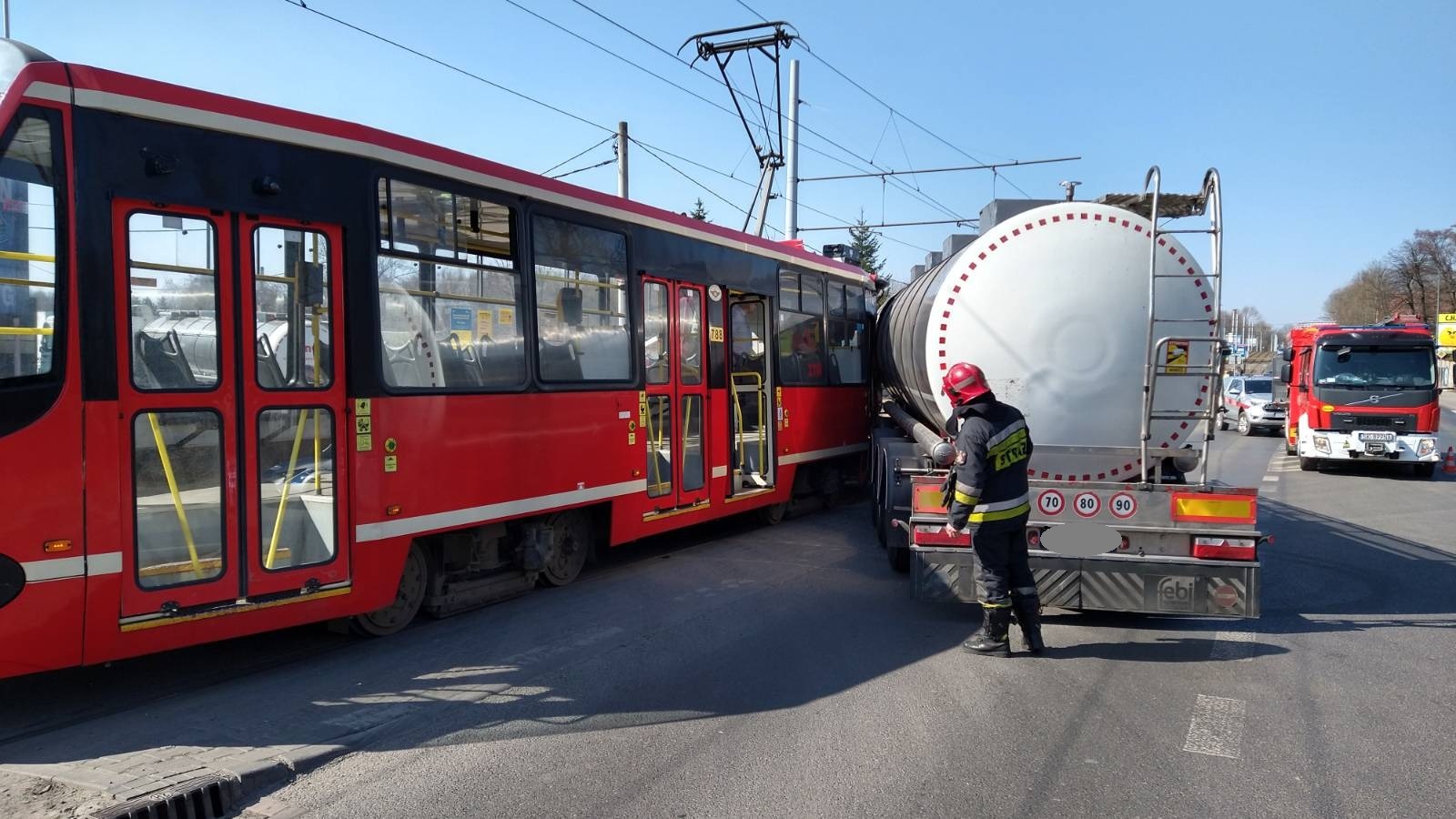 24 marca o godz. 12:28 Stanowisko Kierowania Komendanta Miejskiego Państwowej Straży Pożarnej w Bytomiu przyjęło zgłoszenie o kolizji tramwaju i cysterny na ul. Łagiewnickiej.