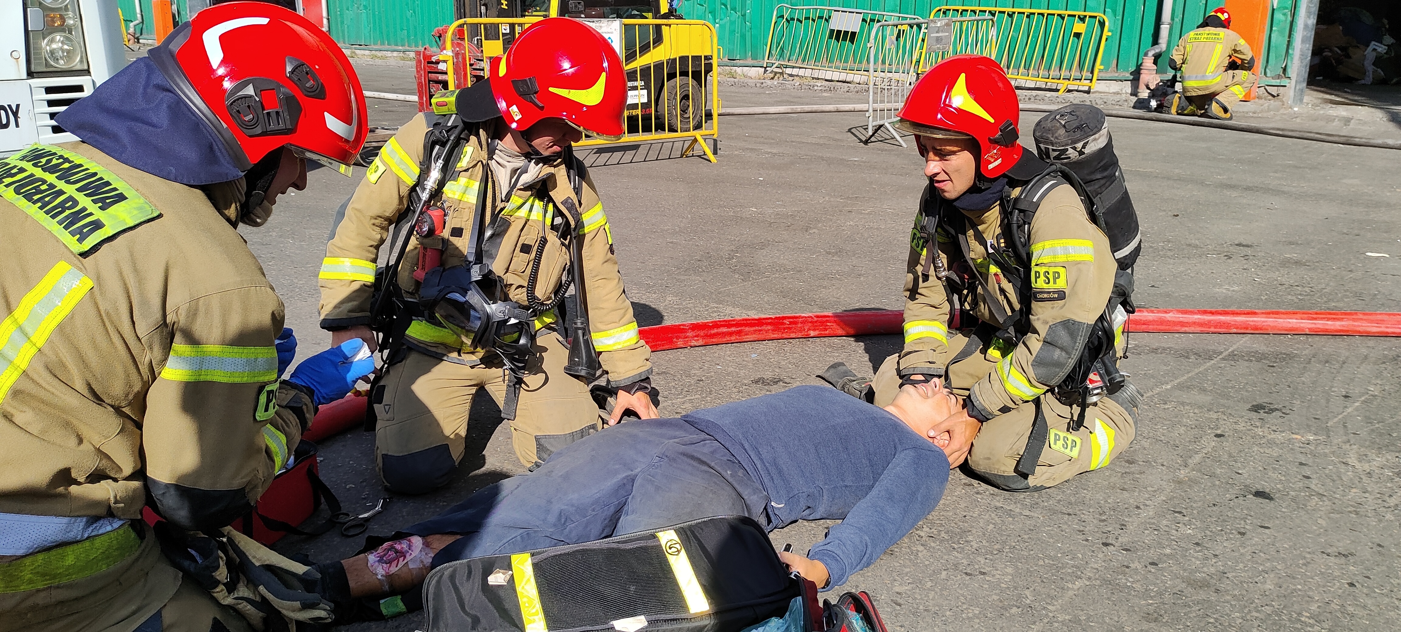 Ćwiczenia symulowały sytuację pożarową, w której doszło do samoczynnego zapalenia się materiału w magazynie, co szybko rozprzestrzeniło ogień.