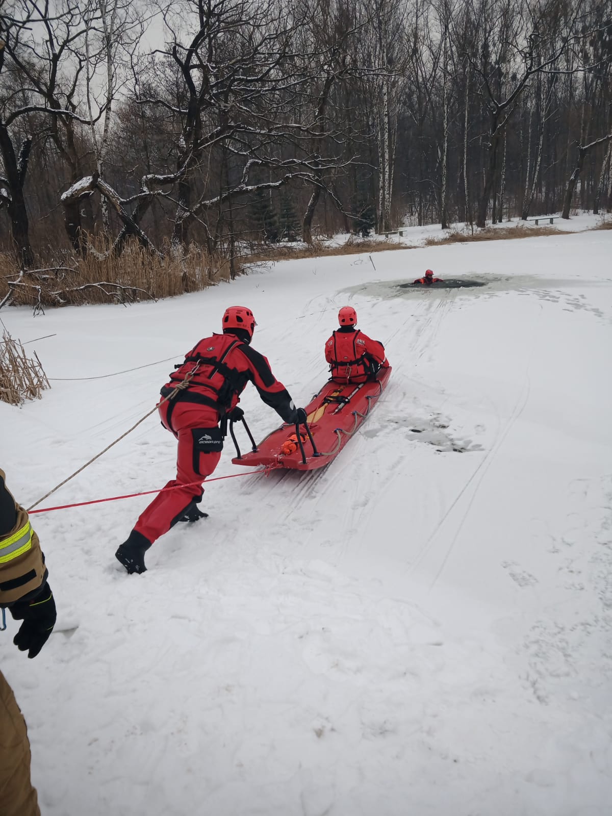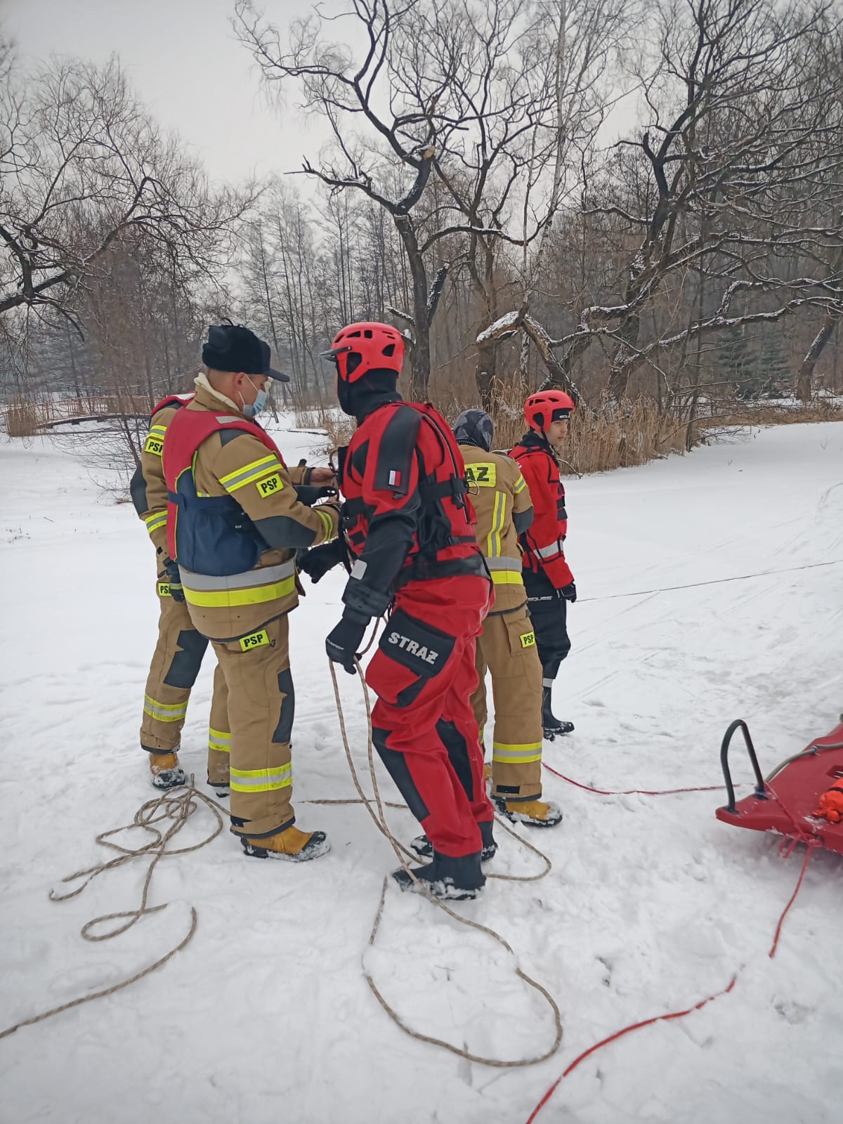 W dniu 10 lutego 2021 r. na stwie w "Dolinie Górnika" odbyły się ćwiczenia z ratownictwa wodno - lodowego. Podczas ćwiczeń strażacy doskonalili rózne techniki ratowania ludzi pod którymi załamał się lód. Pamiętajmy NIE WOLNO WCHODZIĆ NA LÓD w warunkach innych niż ćwiczenia i akcje ratownicze, a i w tym wypadku z zachowaniem wszelkich zasad bezpieczeństwa.