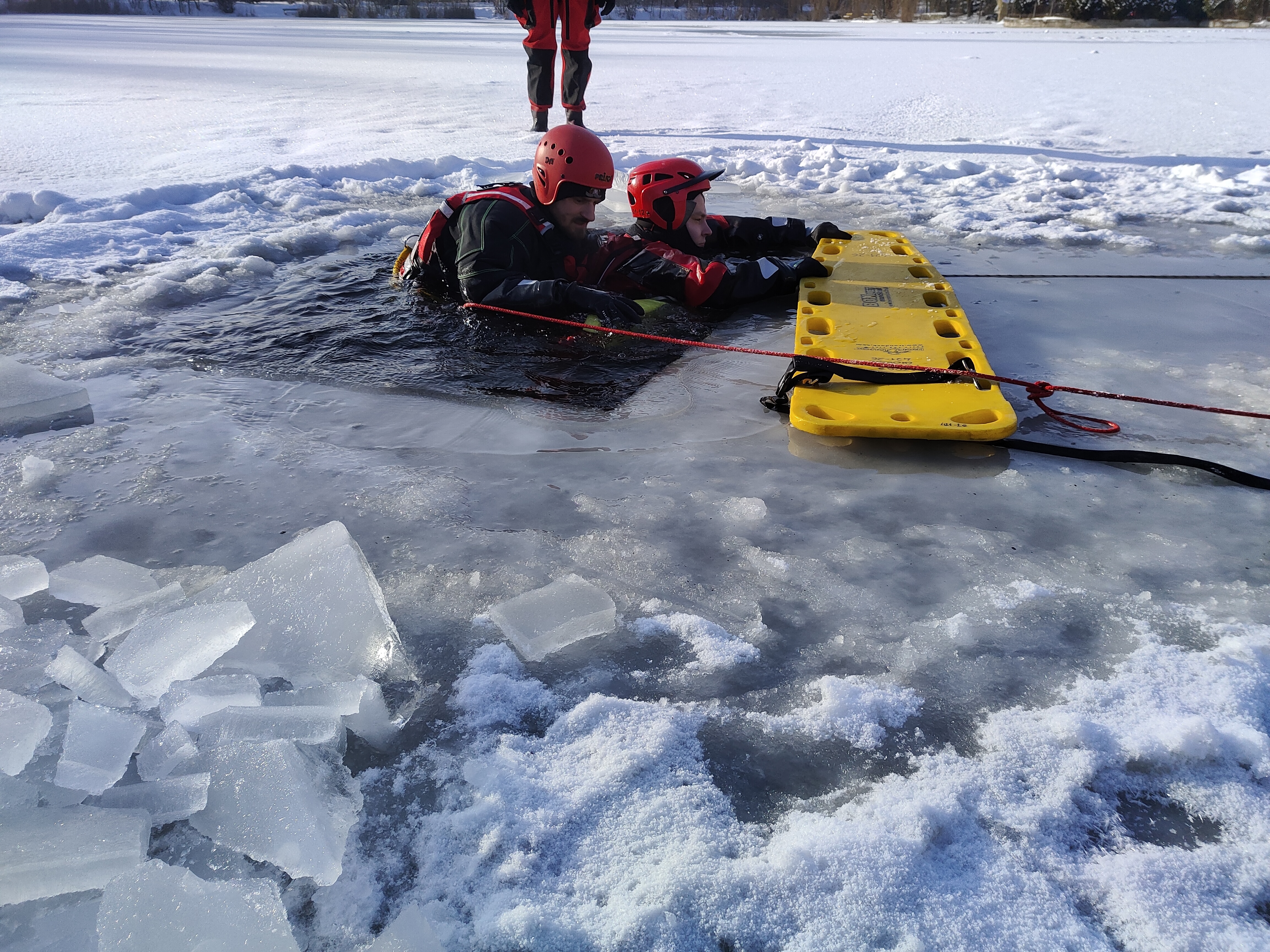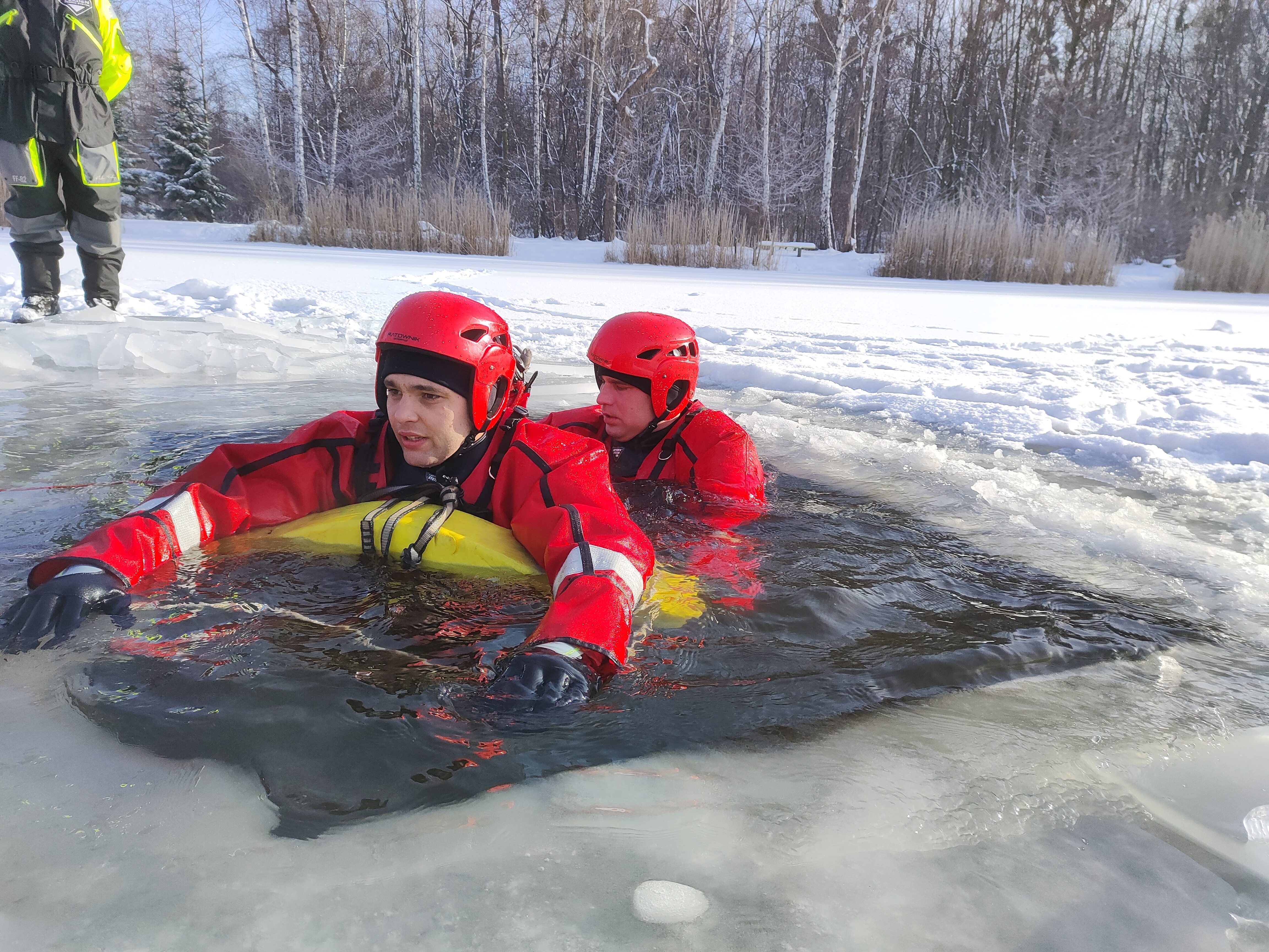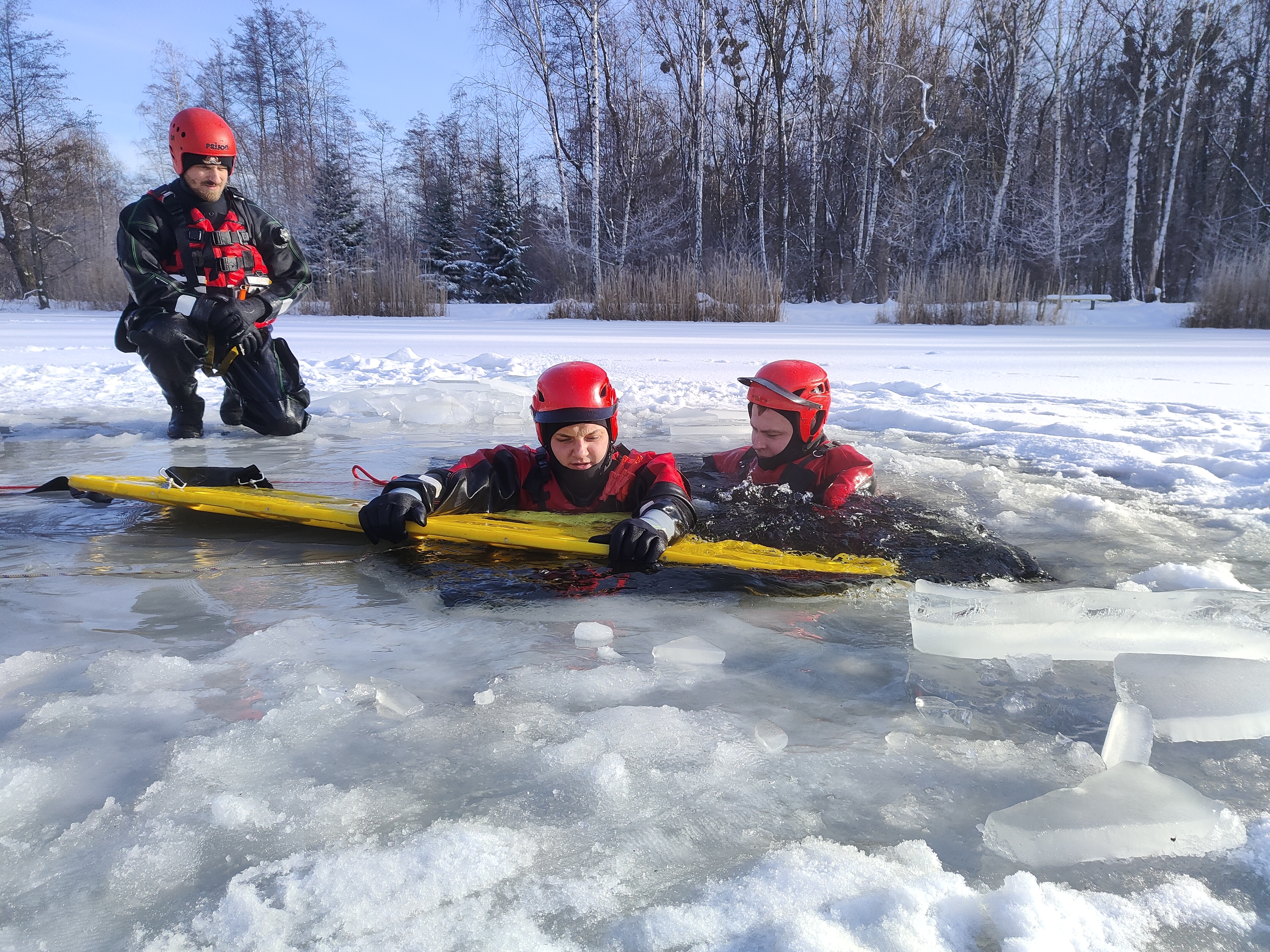- Pamiętaj! Najważniejsze jest własne bezpieczeństwo. Jeśli lód załamał się pod osobą poszkodowaną, może załamać się również pod Tobą. Dlatego tak ważne jest wezwanie pomocy profesjonalistów. Ratownik bez odpowiedniego zabezpieczenia może przebywać w zimnej wodzie krótko. Po 3. minutach dochodzi do wyziębienia organizmu.