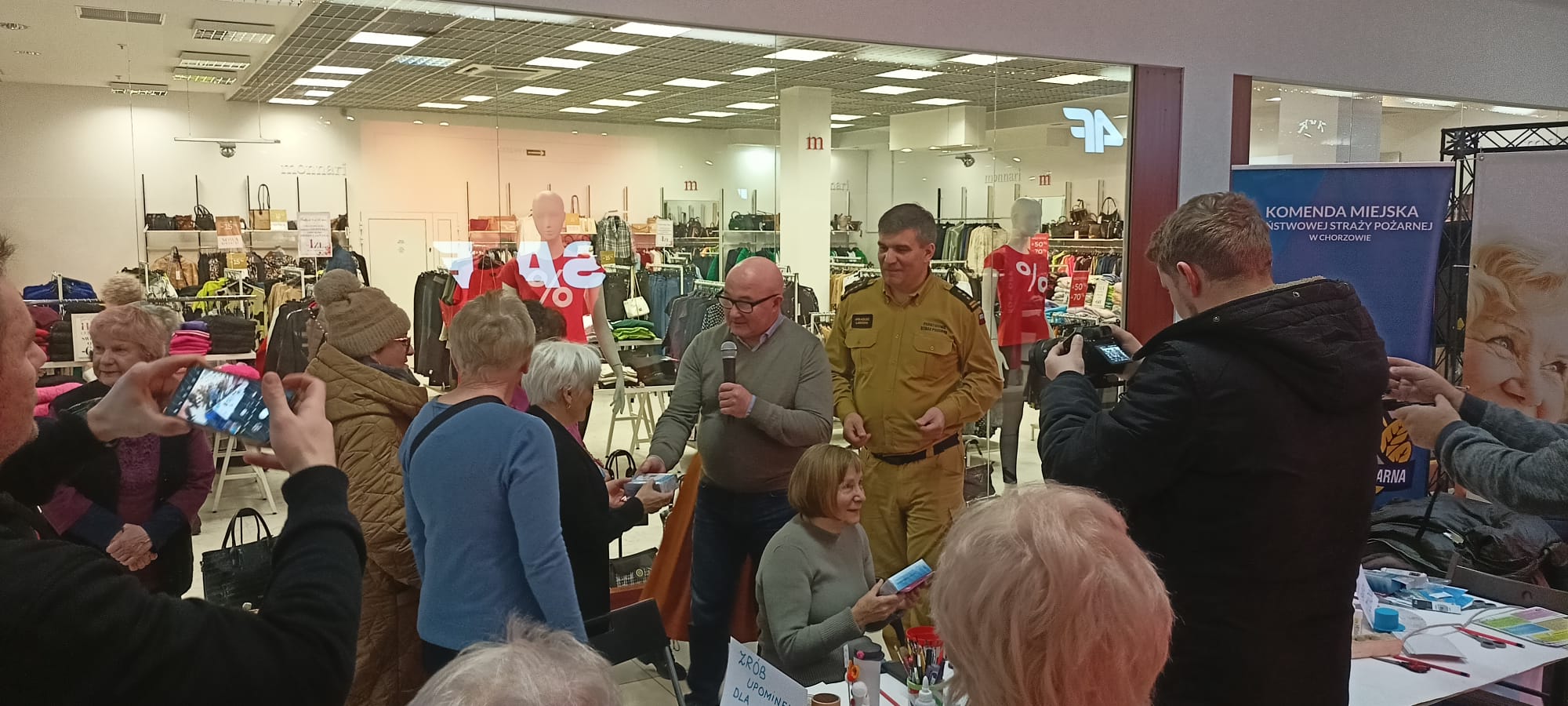 Komendant Miejski PSP w Chorzowie omówił kwestię zagrożenia zatrucia tlenkiem węgla: mechanizmy jego powstawania, objawy podtrucia i metody profilaktyki. Po zakończonej prelekcji wręczono pięćdziesiąt czujek tlenku węgla chorzowskim seniorom przez Prezydenta Miasta Chorzów Pana Andrzej Kotalę oraz Komendanta Miejskiego Państwowej Straży Pożarnej st. bryg. Arkadiusz Labochę.