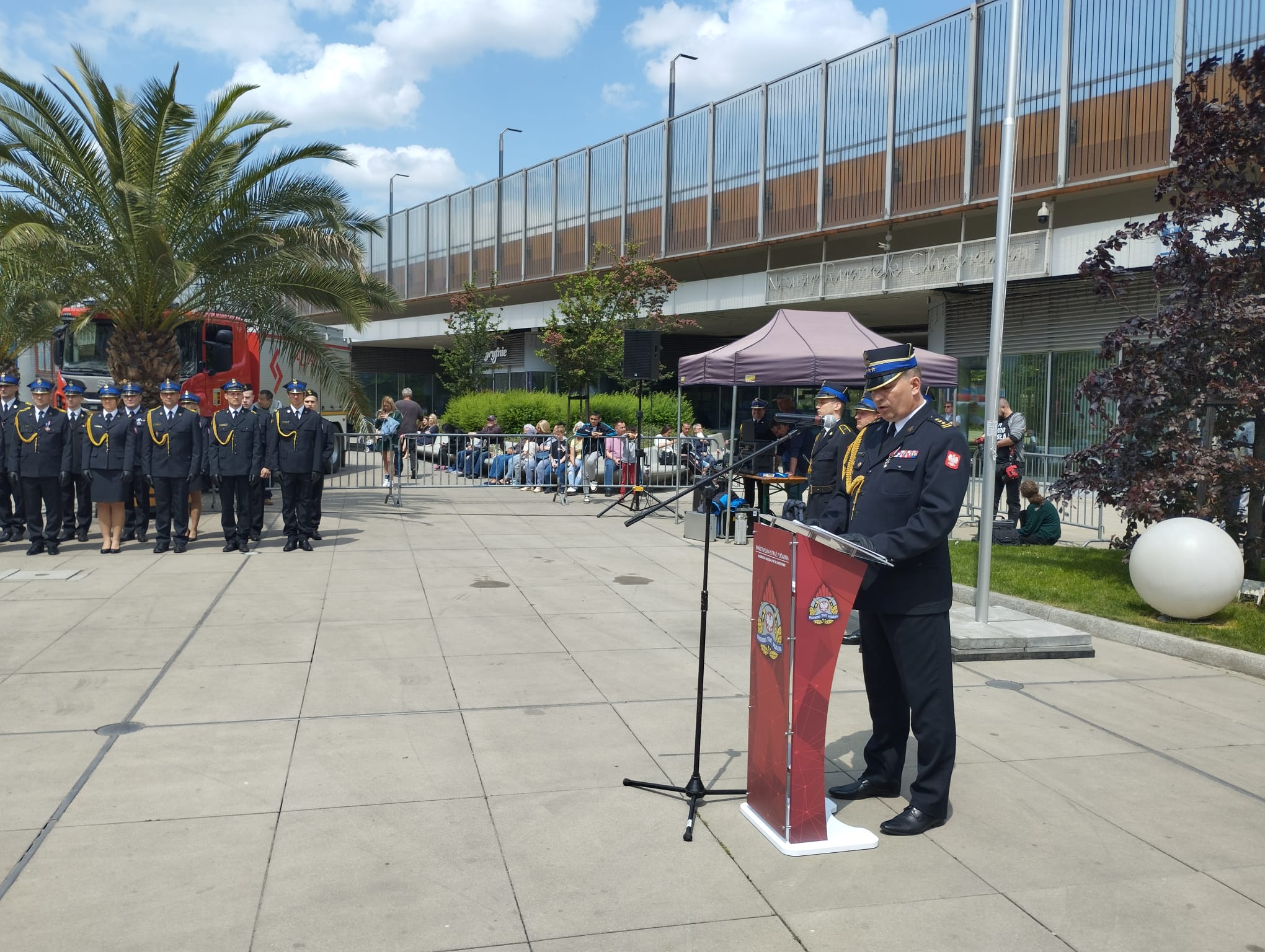 Meldunek o rozpoczęciu uroczystej zbiórki przyjął Zastępca Śląskiego Komendanta Wojewódzkiego Państwowej Straży Pożarnej, st. bryg. Mirosław Synowiec, po czym dokonał przeglądu pododdziału i przywitał się z funkcjonariuszami.