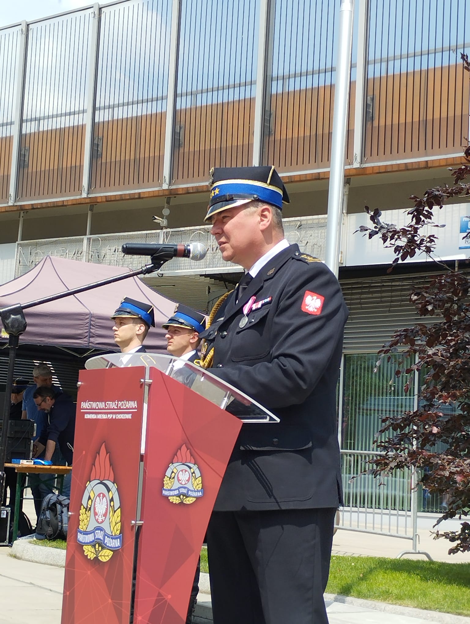 Następnie głos zabrał Komendant Miejski Państwowej Straży Pożarnej w Chorzowie, st. bryg. Arkadiusz Labocha, który powitał zaproszonych gości. Komendant podczas wystąpienia przedstawił działalność Komendy Miejskiej PSP oraz złożył serdeczne podziękowania wszystkim, którzy wspierają działania chorzowskiej komendy.
