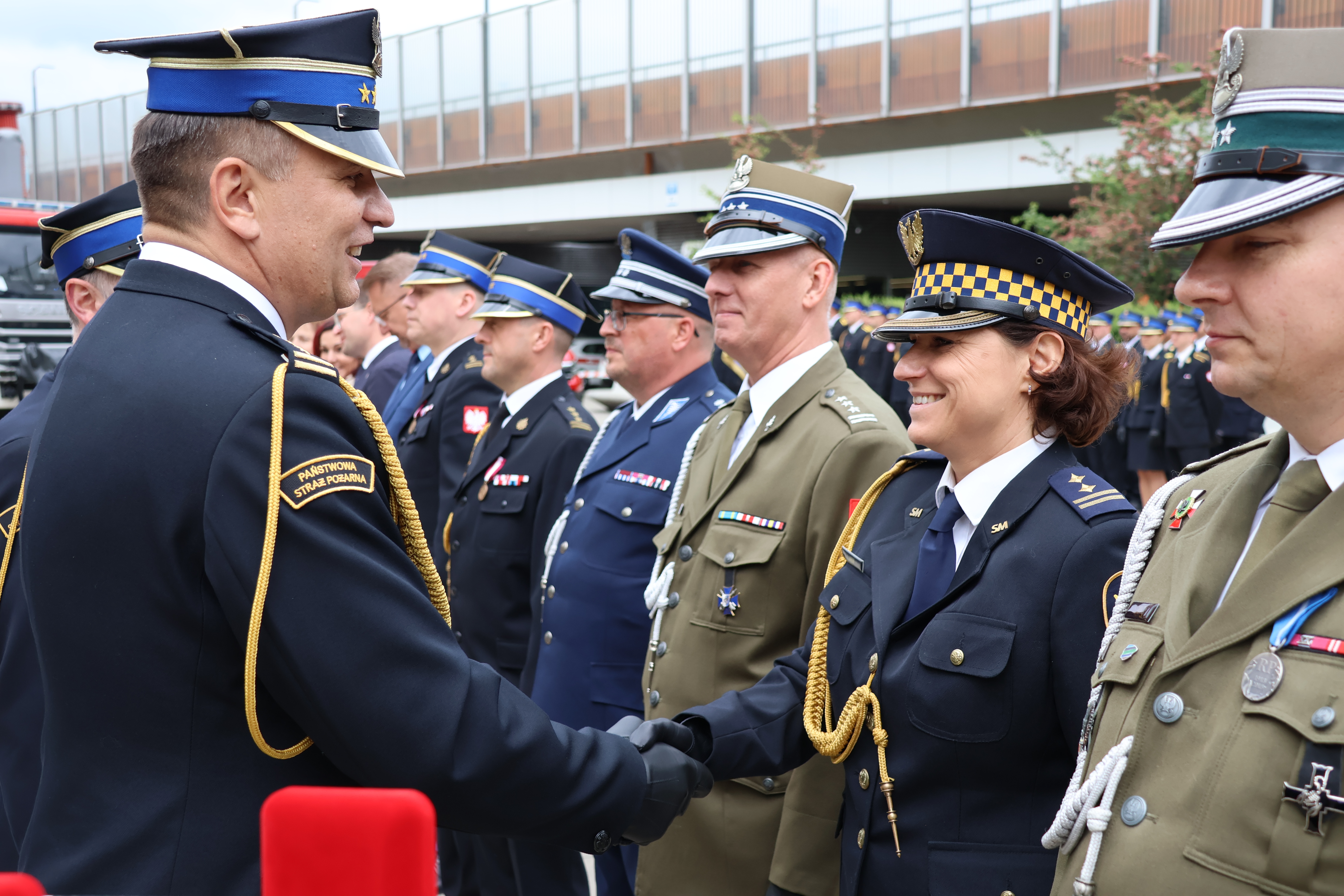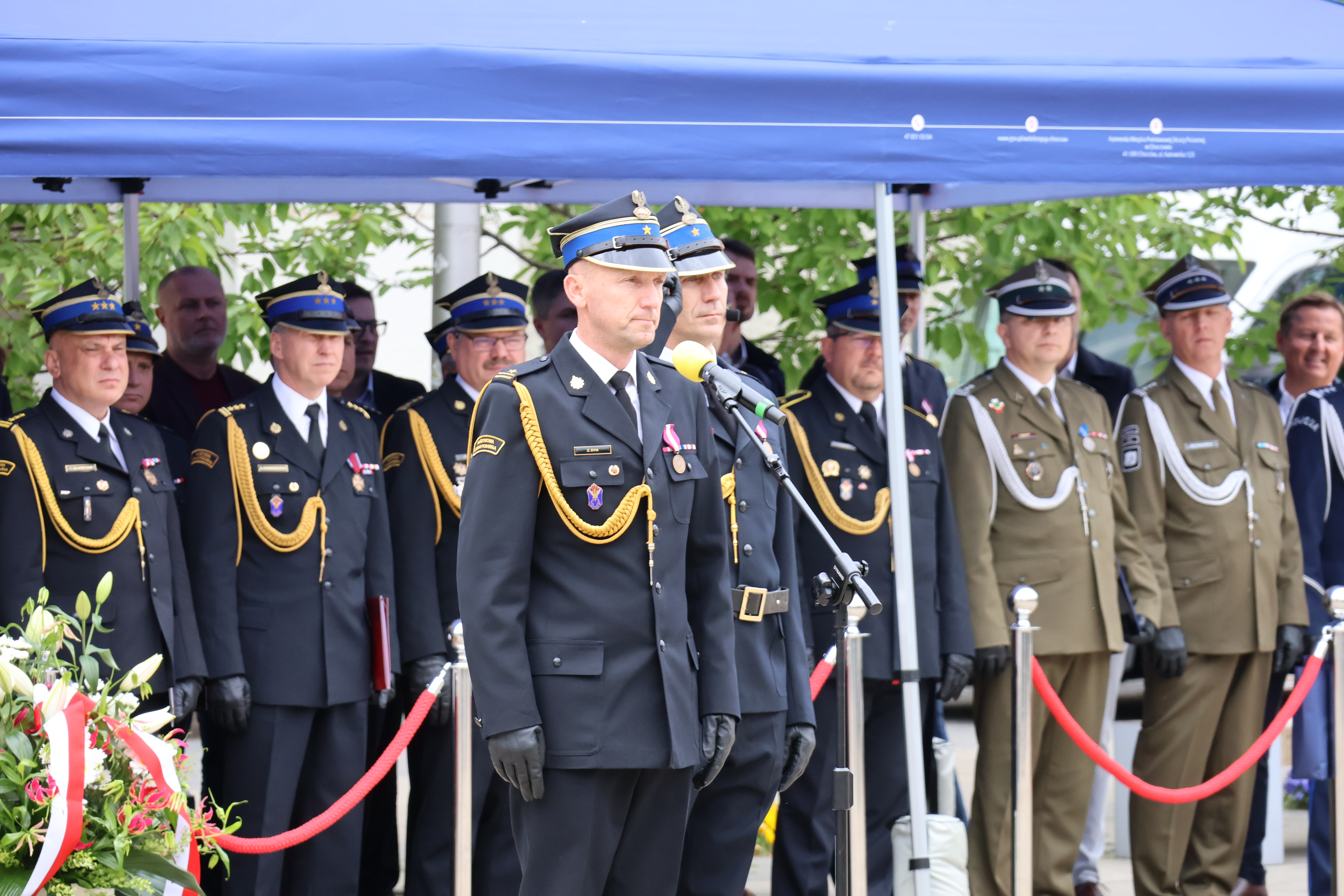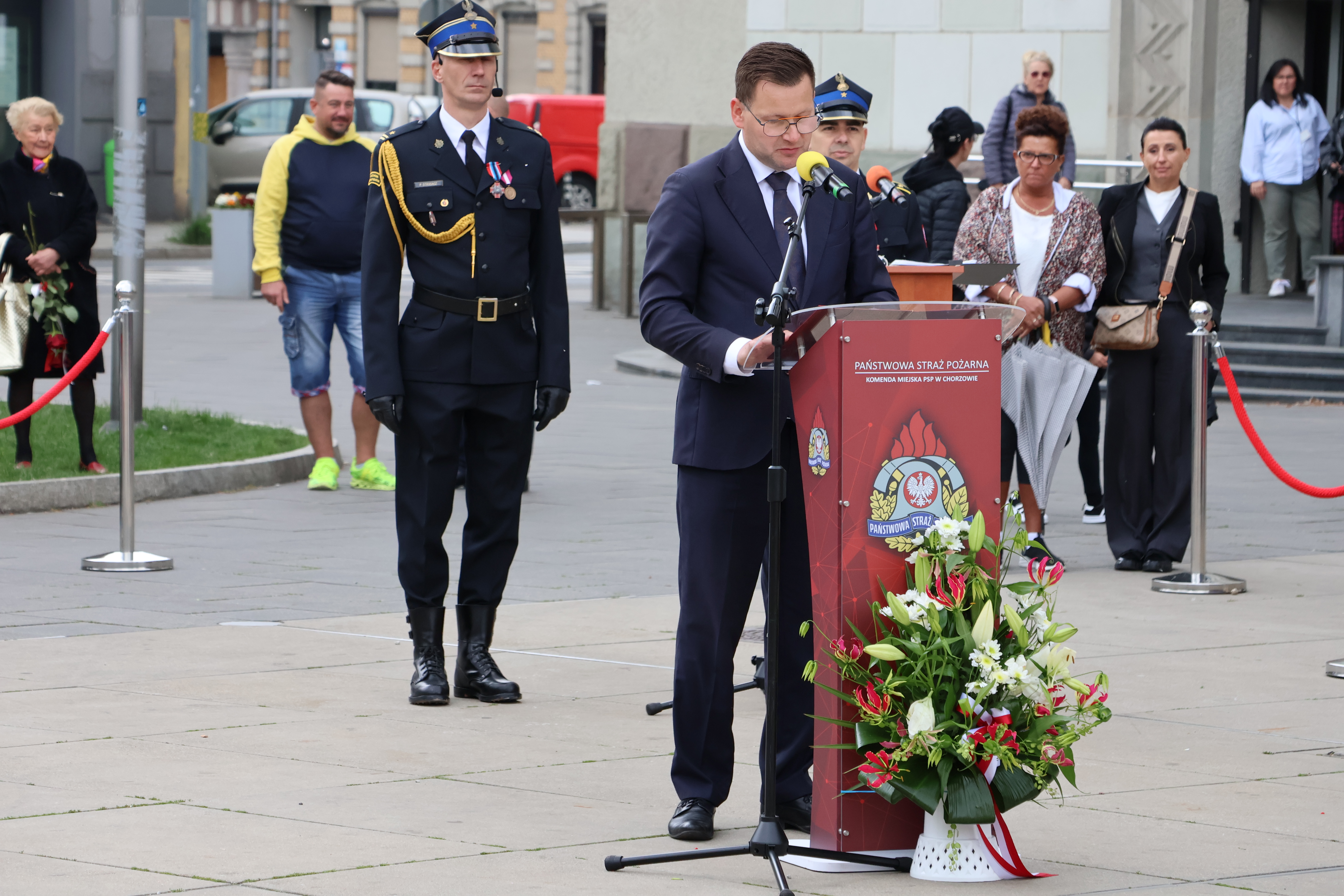 „…Tegoroczne obchody dnia strażaka w tym tak wyjątkowym dla naszego miasta miejscu oraz tak liczna obecność tak znamienitych gości odbieram jako wyraz szacunku i uznania dla chorzowskich strażaków, strażaków którzy w roku 2024 podjęli 1819 interwencji z czego 268 to wyjazdy poza granice administracyjne miasta Chorzów. To rok, w którym zabezpieczyliśmy 31 imprez masowych na terenie stadionu Śląskiego, Wojewódzkiego Parku Kultury