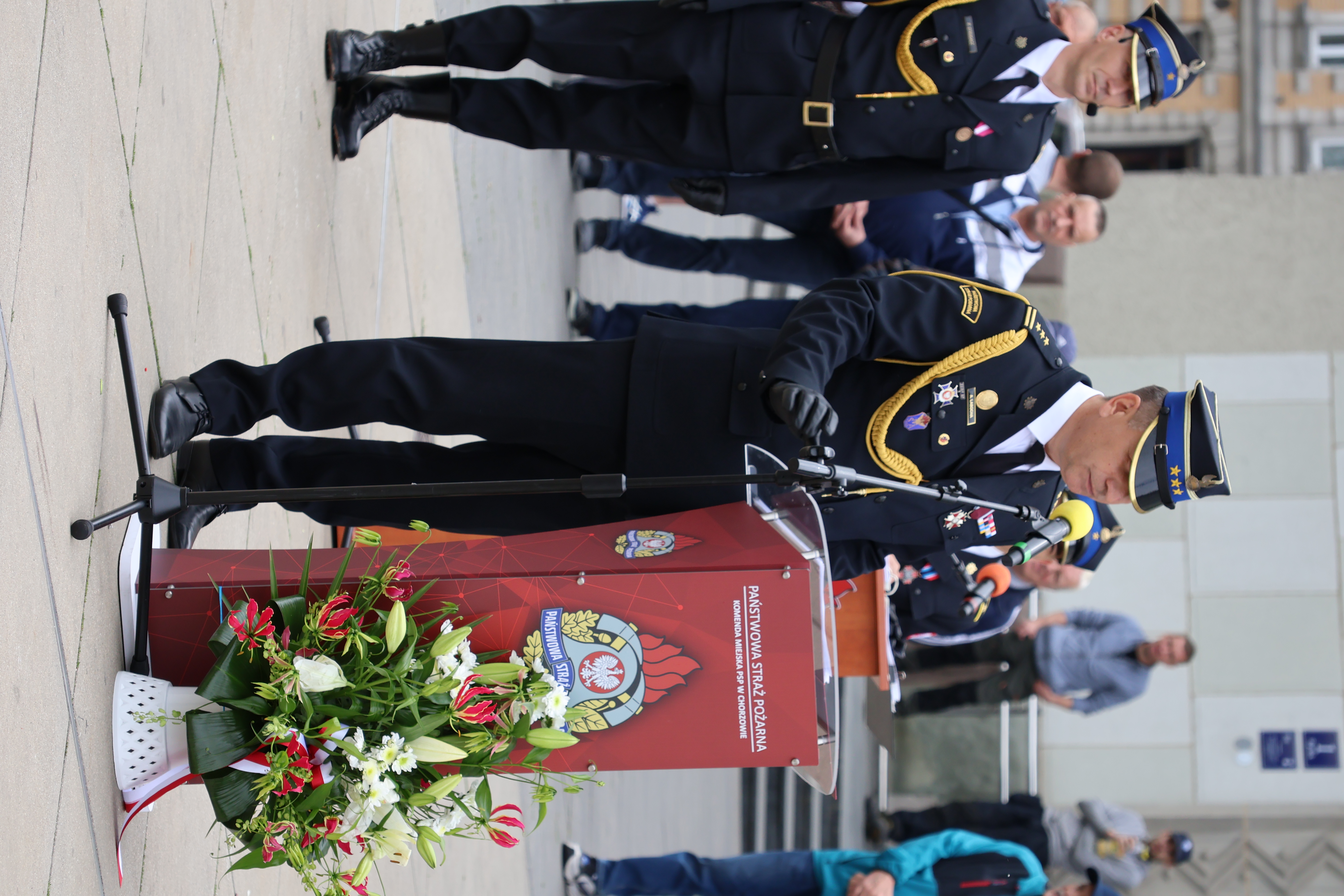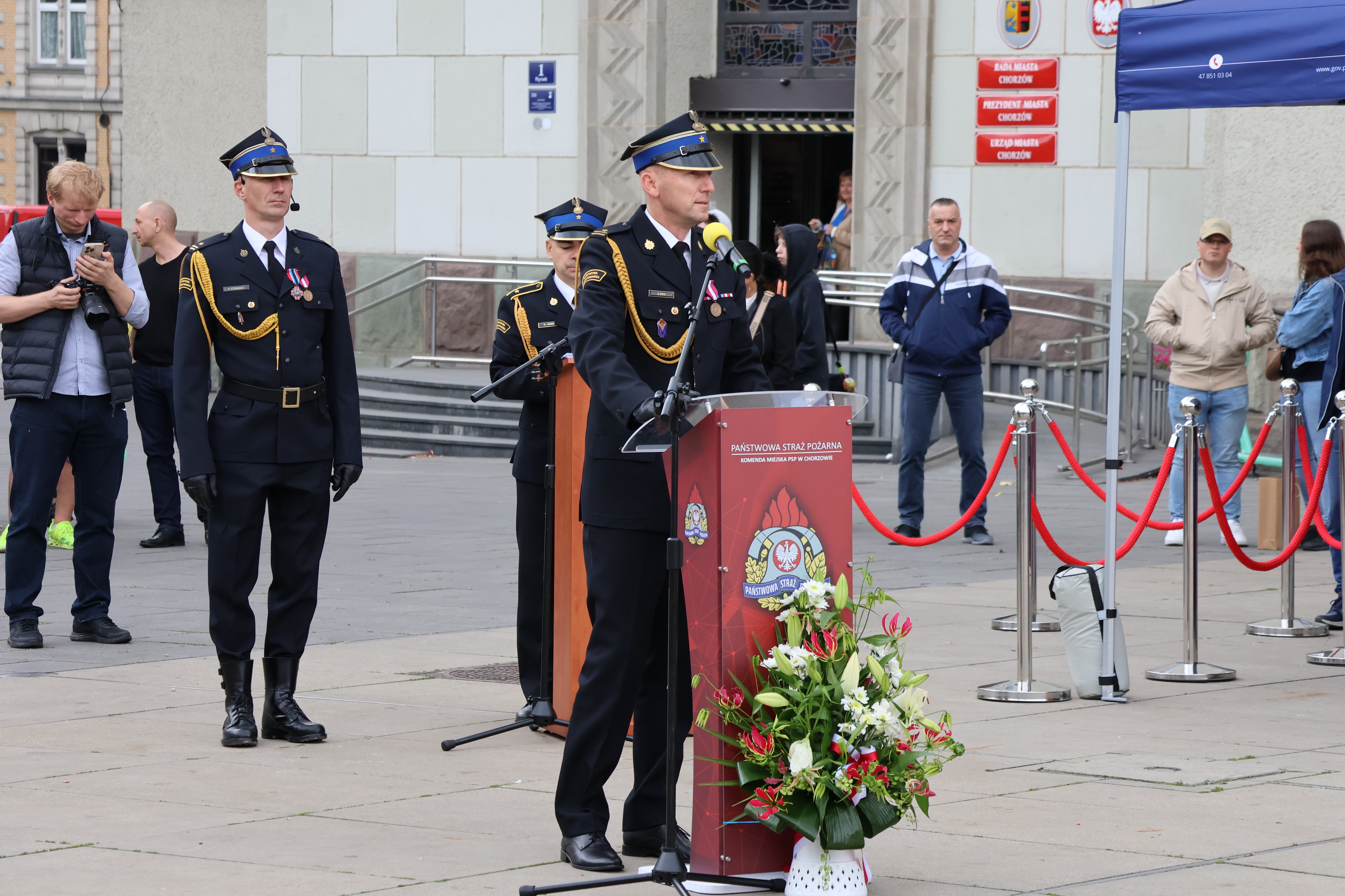 …Bardzo ważnym jest sprzęt ratowniczo-gaśniczy i specjalistyczny, który jest niezbędny do prowadzenia działań gaśniczych czy likwidacji miejscowych zagrożeń, ale czymże byłby owy sprzęt gdyby nie było Was, ludzi z pasją, oddaniem, ludzi gotowych do najwyższych poświęceń…Świętując i dziękując sobie nawzajem za to co było, realizujemy stawiane przed nami wyzwania i już myślimy o tym co przed nami, a przed nami kolejny wyjątkowy rok bo rok 2026, to rok, w którym będziemy obchodzić 120 lecie powstania dzisiejszej siedziby…Chciałbym ogromne słowa podziękowania złożyć na ręce obecnego tutaj Zastępcy Śląskiego Komendanta Wojewódzkiego Państwowej Straży Pożarnej w Katowicach mł. bryg. Zbigniewa Dyka z prośbą o przekazanie ich na ręce Śląskiego Komendanta Wojewódzkiego st. bryg. Damiana Legierskiego za pomoc i ciągłe wspieranie naszej chorzowskiej Komendy…Dziękuję Wam - żonom i dziewczynom chorzowskich strażaków - dziękuję za Wasze wsparcie, za dobre słowo za uśmiech czy pocałunek na progu domu wychodząc do służby. Dziękuję za to, że jesteście bo wiem że życie u boku strażaka nie jest łatwe. Dziękuję za to wszystko co na co dzień robicie, a co pozwala zapomnieć, o trudach służby, a nam pozwala jeszcze bardziej oddać się służbie dla drugiego człowieka zgodnie z naszą strażacką dewizą…”