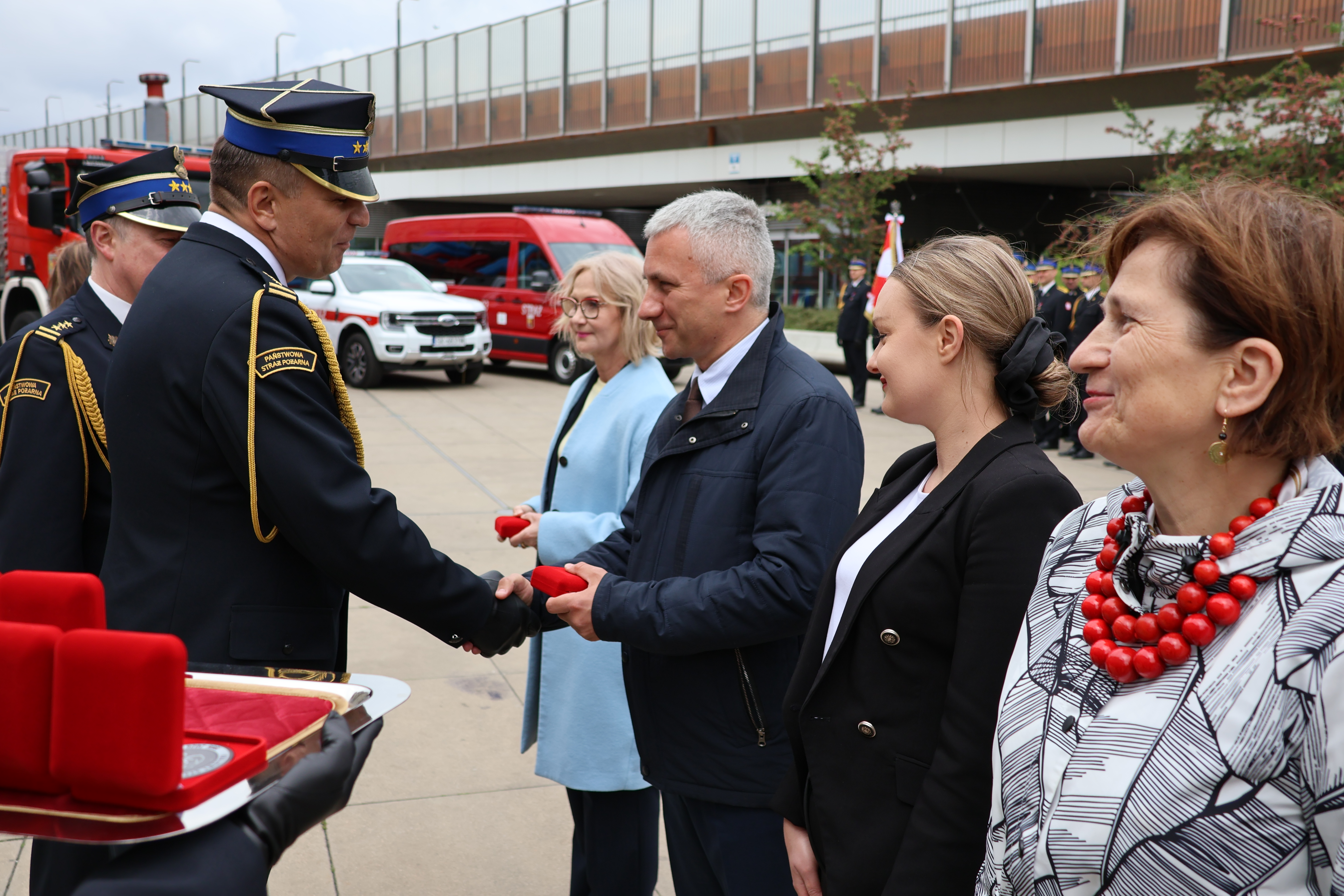 Następnie z okazji jubileuszu 30-lecia Krajowego Systemu Ratowniczo-Gaśniczego, Komendant Miejski Państwowej Straży Pożarnej w Chorzowie w dowód uznania za wkład
