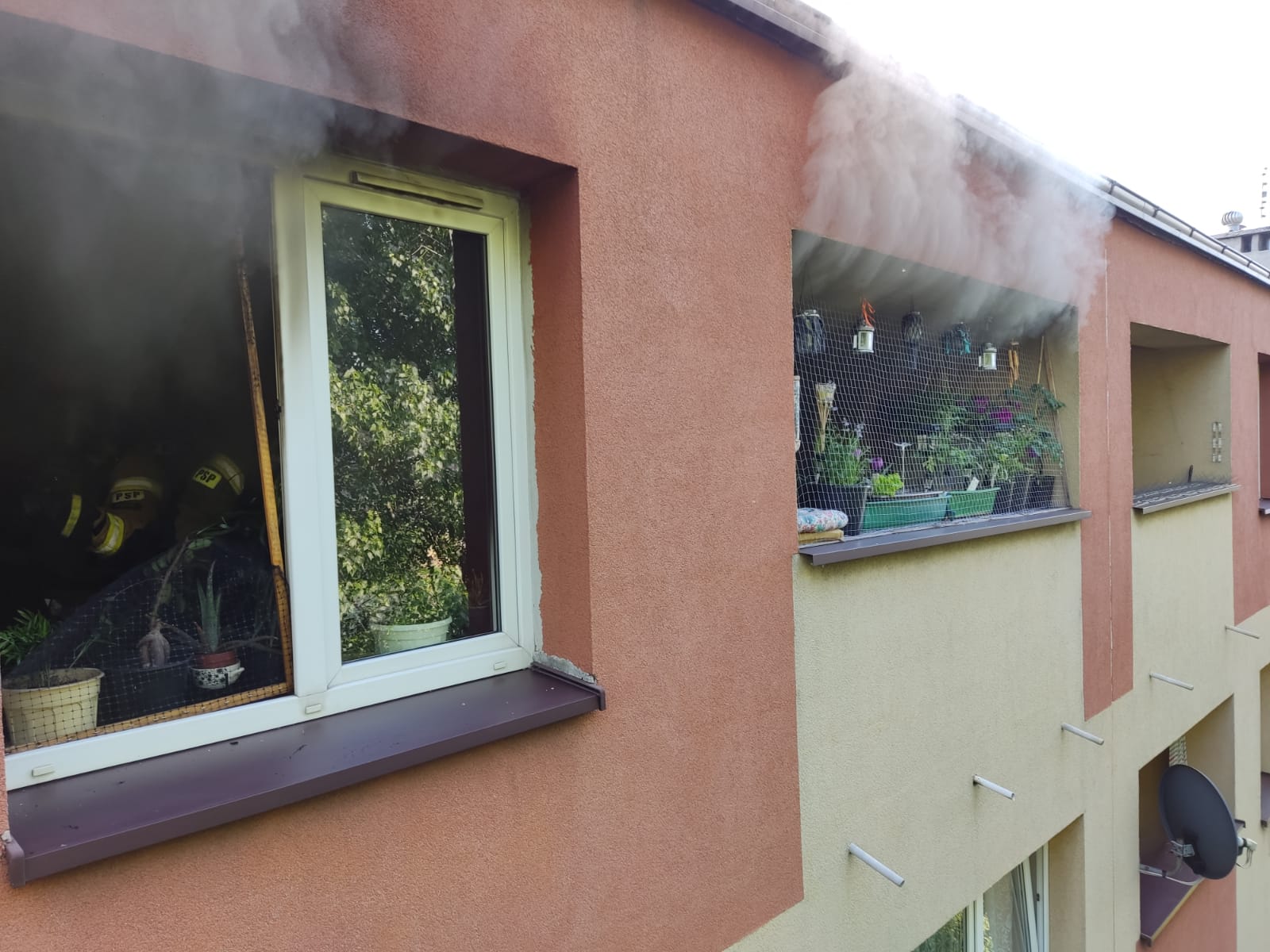 Po przybyciu na miejsce zdarzenia Kierujący Działaniem Ratowniczym stwierdził, że pali się w mieszkaniu na 4 piętrze w budynku 5 kondygnacyjnym. Na szczęście przed przybyciem zastępów straży pożarnej lokatorzy opuścili mieszkania.
