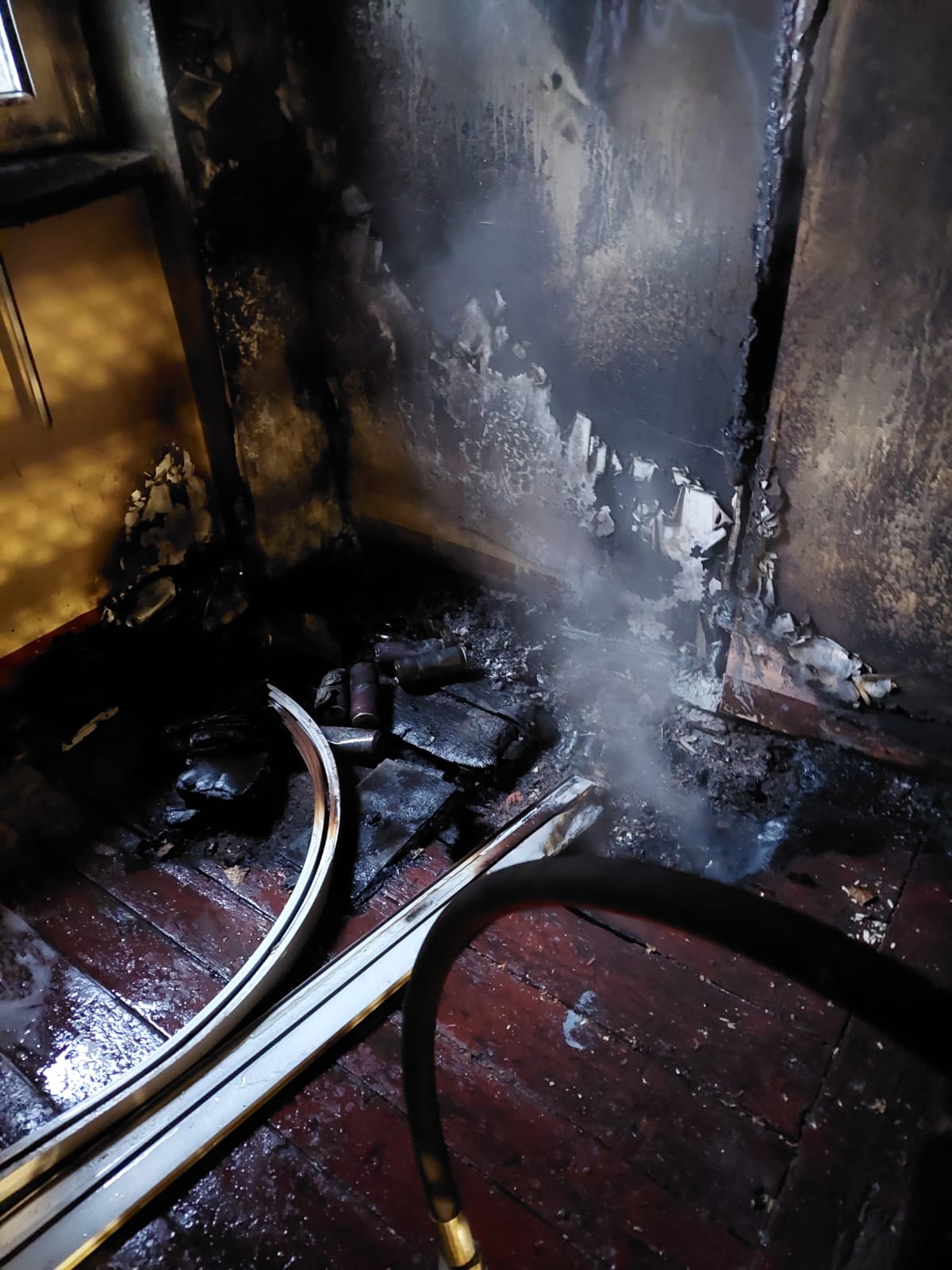 W wyniku pożaru nadpaleniu uległy deski na spoczniku przed wejściem na strych (4 kondygnacja). Strażacy dokonali rozbiórki 2,5 metra kw. desek. Okopceniu uległ sufit i ściany na klatce schodowej w miejscu pożaru. Ewakuacji nie prowadzono. Po przekazaniu miejsca policji oraz pogotowiu technicznemu PGM zastępy wróciły do bazy.
