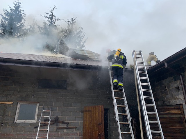 Po dojeździe na miejsce zdarzenia pierwszy Kierujący Działaniem Ratowniczym zastał silnie rozwinięty pożar w jednym ze skrzydeł budynku gospodarczo - warsztatowego.