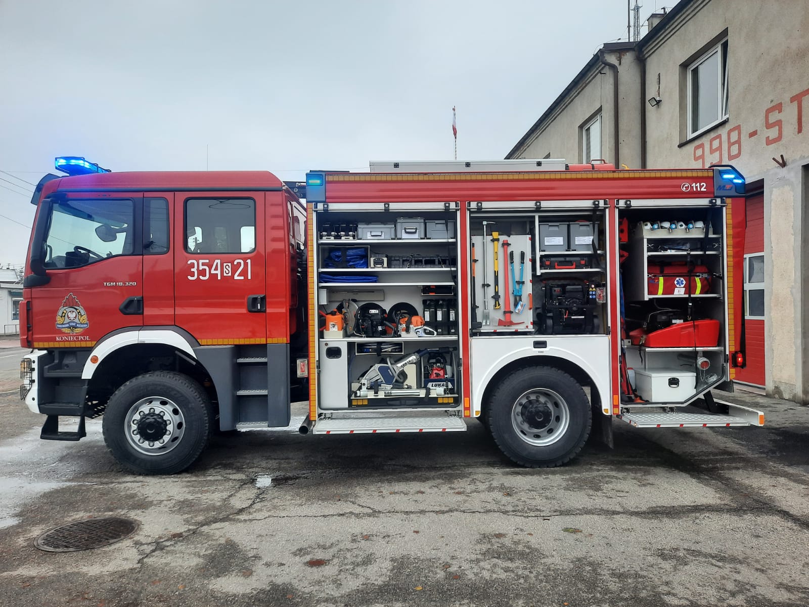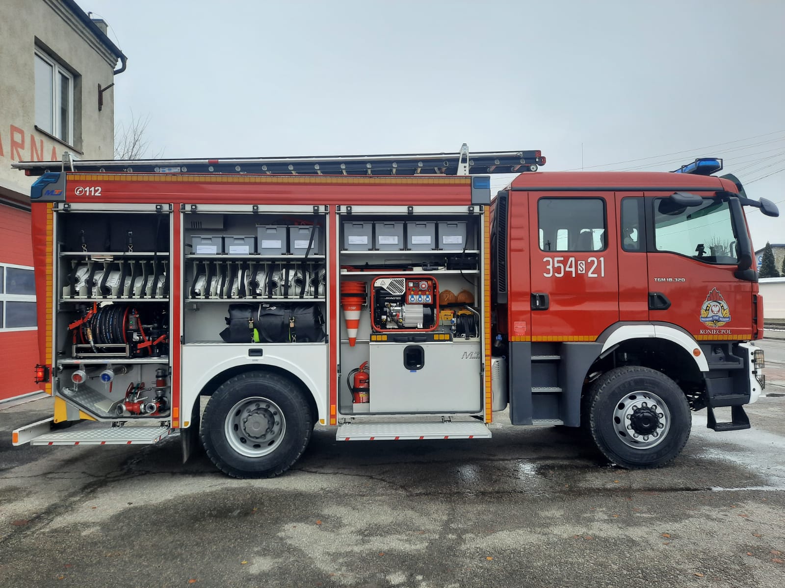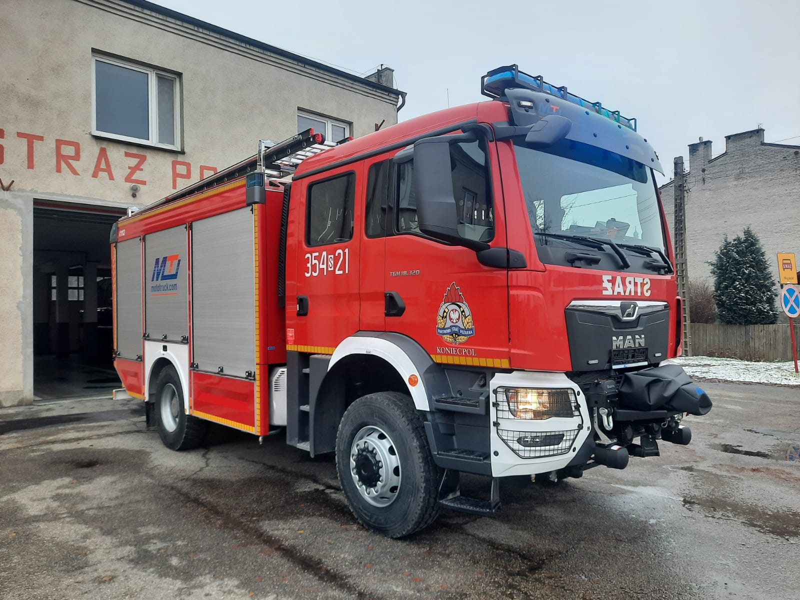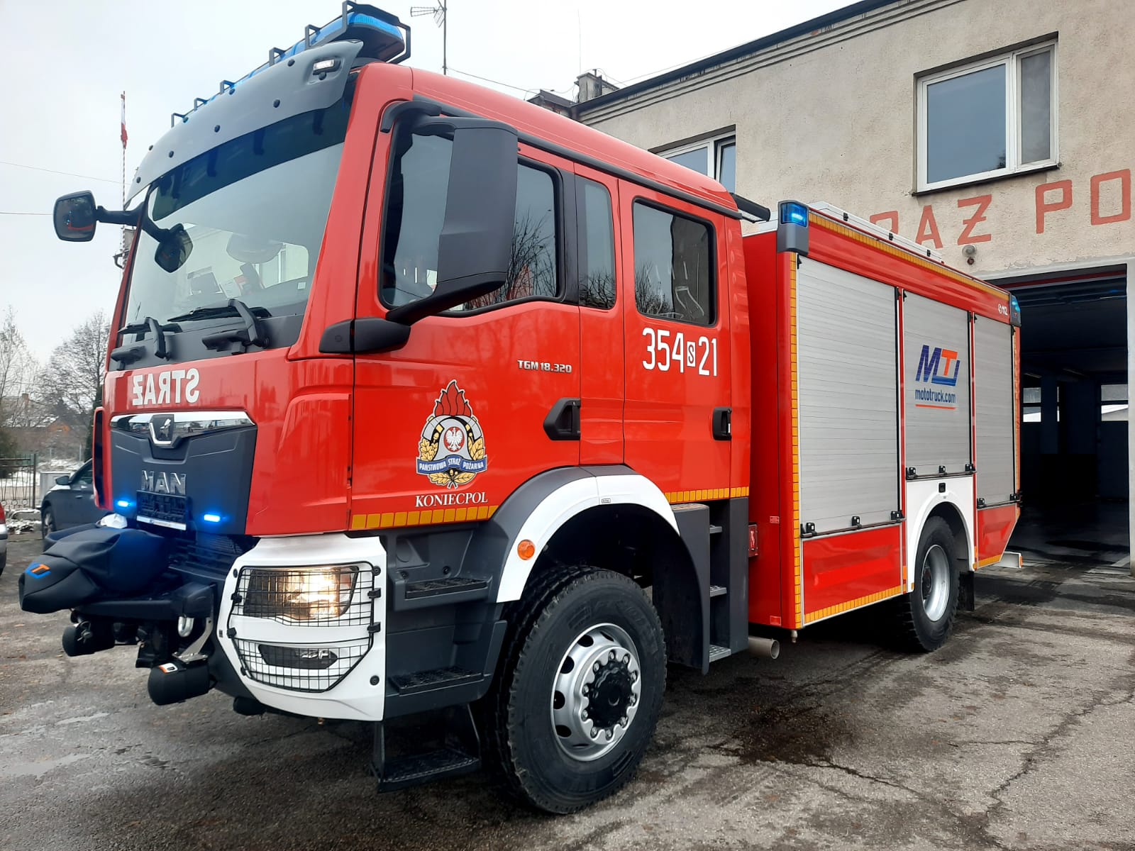 Jednostka Ratowniczo – Gaśnicza nr 4 w Koniecpolu została doposażona w średni samochód ratowniczo – gaśniczy GBA 3/16/4,7 zabudowany na podwoziu MAN TGM 18,320 4x4 BB. Samochód otrzymany w ramach Projektu „Usprawnienie systemu ratownictwa na drogach – etap V”. Zastąpił w podziale bojowym średni samochód ratowniczo-gaśniczy GBA 2,5/24/2,5 Renault Midlum.