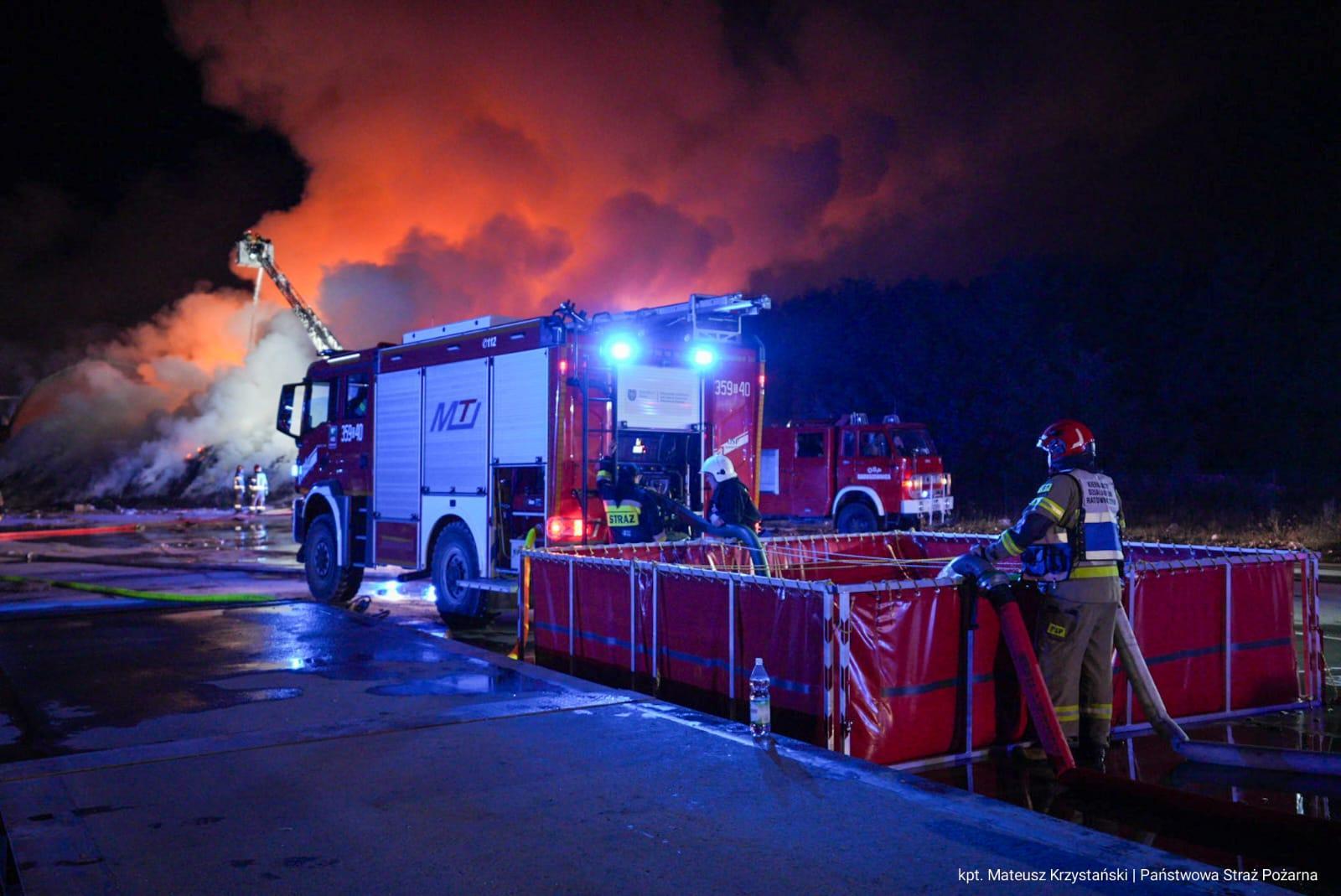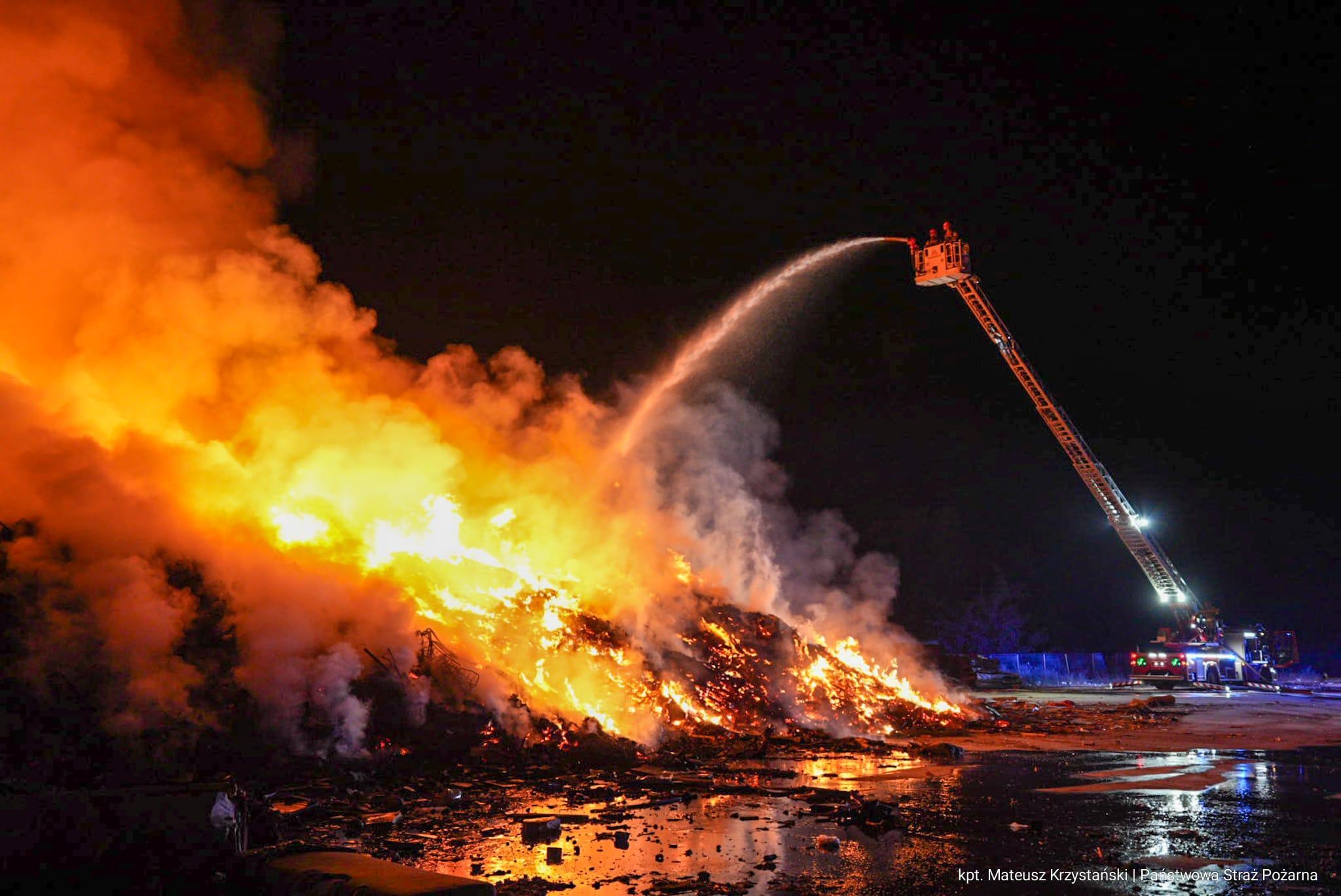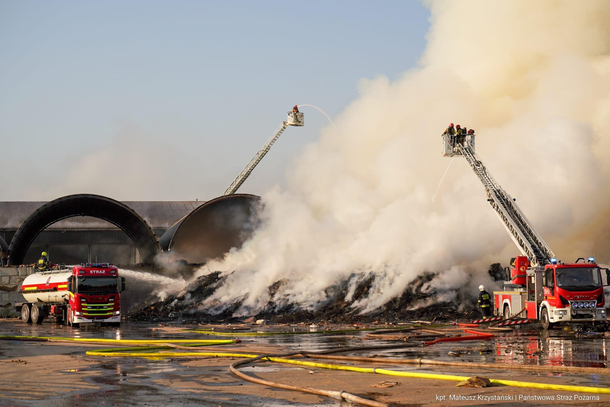 W związku z przybieraniem na intensywności pożaru i rozprzestrzenieniu ognia się na składowisko surowca, zlokalizowane przed halą zadysponowane zostały dodatkowe siły i środki.