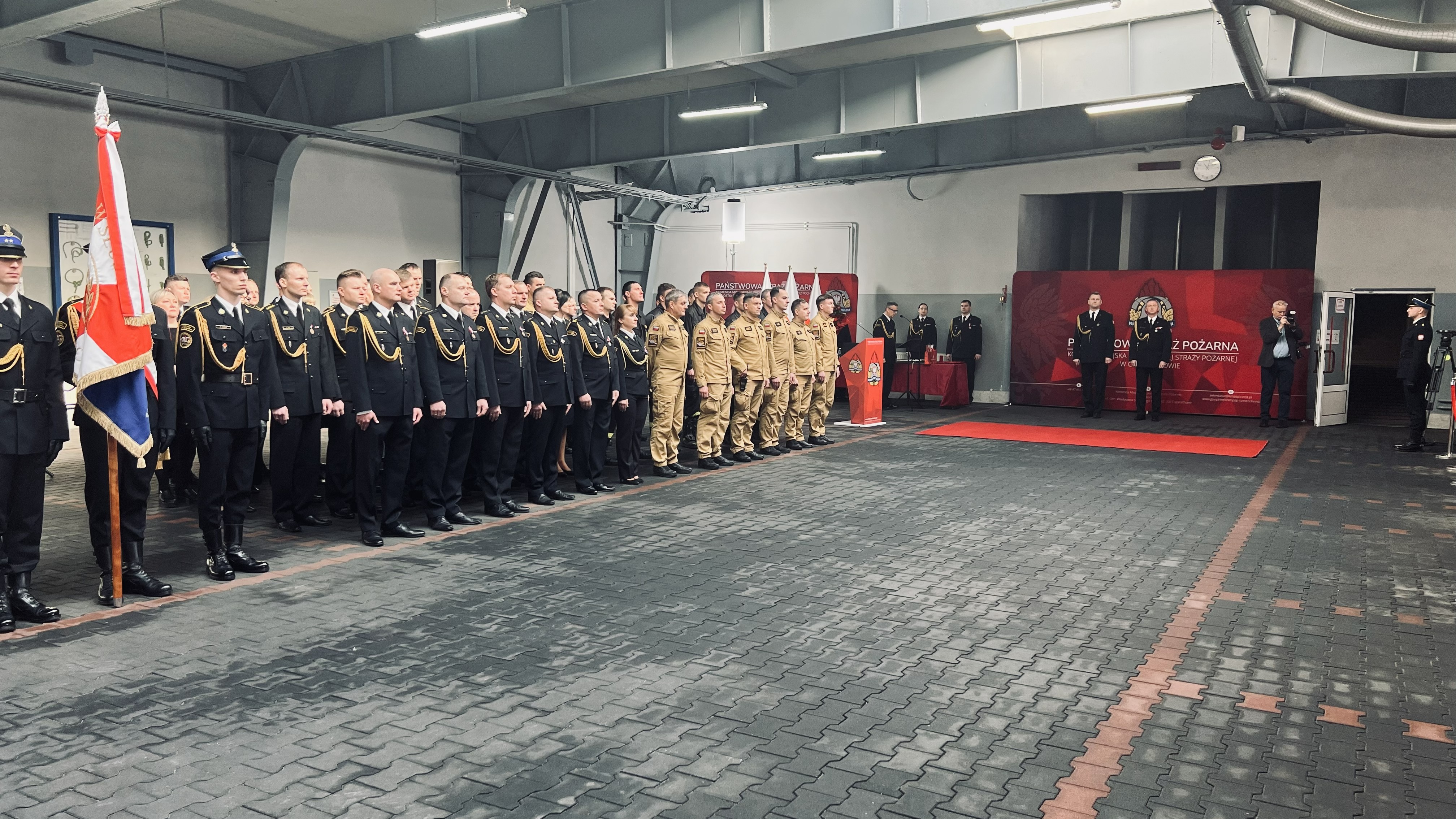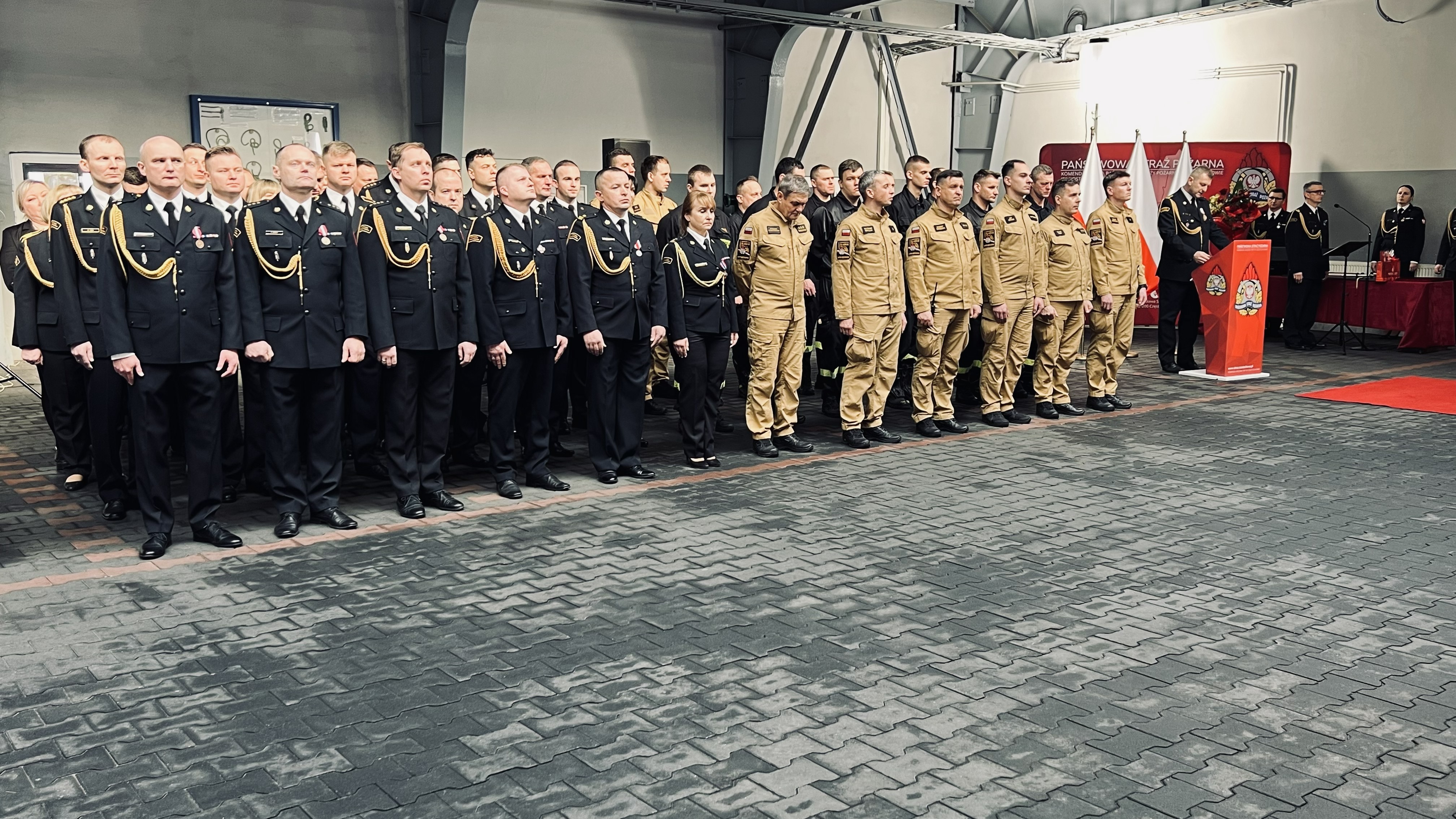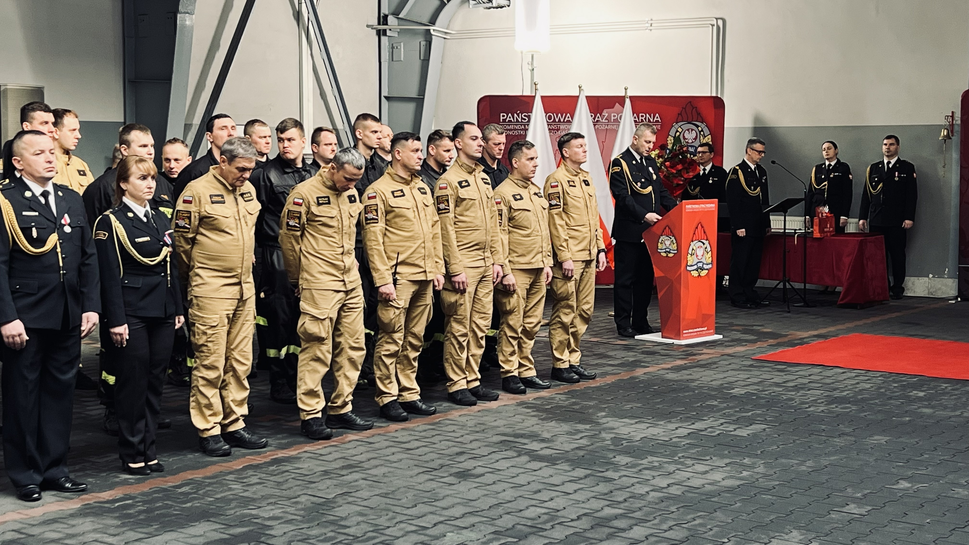 Uroczystość rozpoczęła się od złożenia meldunku przez dowódcę uroczystości Śląskiemu Komendantowi Wojewódzkiemu PSP st. bryg. Damianowi Legierskiemu. Śląski Komendant Wojewódzki PSP przywitał się z pocztem sztandarowym i pododdziałami, odegrano hymn państwowy.