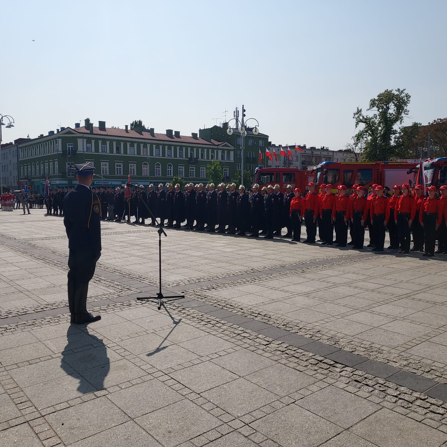 Pierwsza część wydarzenia odbyła się na Placu W. Biegańskiego, gdzie wprowadzona została Kompania Reprezentacyjna Państwowej Straży Pożarnej pod dowództwem mł. bryg. Mateusza Guli, Kompania Reprezentacyjna Związku Ochotniczych Straży Pożarnych RP, którą wystawiła Ochotnicza Straż Pożarna z Kołaczyc w woj. podkarpackim pod dowództwem druha Andrzeja Maziarza, Kompania Reprezentacyjna Młodzieżowych Drużyn Pożarniczych z Ochotniczej Straży Pożarnej Ćmińsk – Miedziana Góra i Gminy Daleszyce, w tym OSP Smyków i Komórki w woj. świętokrzyskim, pod dowództwem druhny Aleksandry Szczęśniak, oraz Kompania Reprezentacyjna Strażaków z Ukrainy pod dowództwem Andrija Wołoszczyszyna. Oprawę muzyczną uroczystości zapewniła orkiestra Ochotniczej Straży Pożarnej Mykanów pod batutą druha Krzysztofa Witczaka. Po złożeniu przez dowódcę uroczystości kpt. Szymona Kwaśnicę meldunku o gotowości pododdziałów do VIII Pielgrzymki Strażaków na Jasną Górę, głos zabrał Komendant Główny Państwowej Straży Pożarnej gen. brygadier Andrzej Bartkowiak oraz Prezes Zarządu Głównego ZOSP RP druh Waldemar Pawlak.