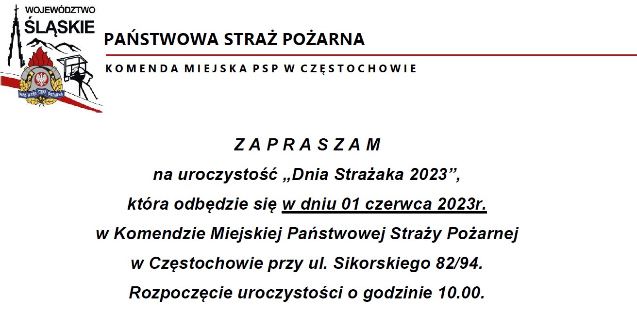 Zapraszam na uroczystość „Dnia Strażaka 2023”, która odbędzie się w dniu 01 czerwca 2023r. w Komendzie Miejskiej Państwowej Straży Pożarnej w Częstochowie przy ul. Sikorskiego 82/94. Rozpoczęcie uroczystości o godzinie 10.00.