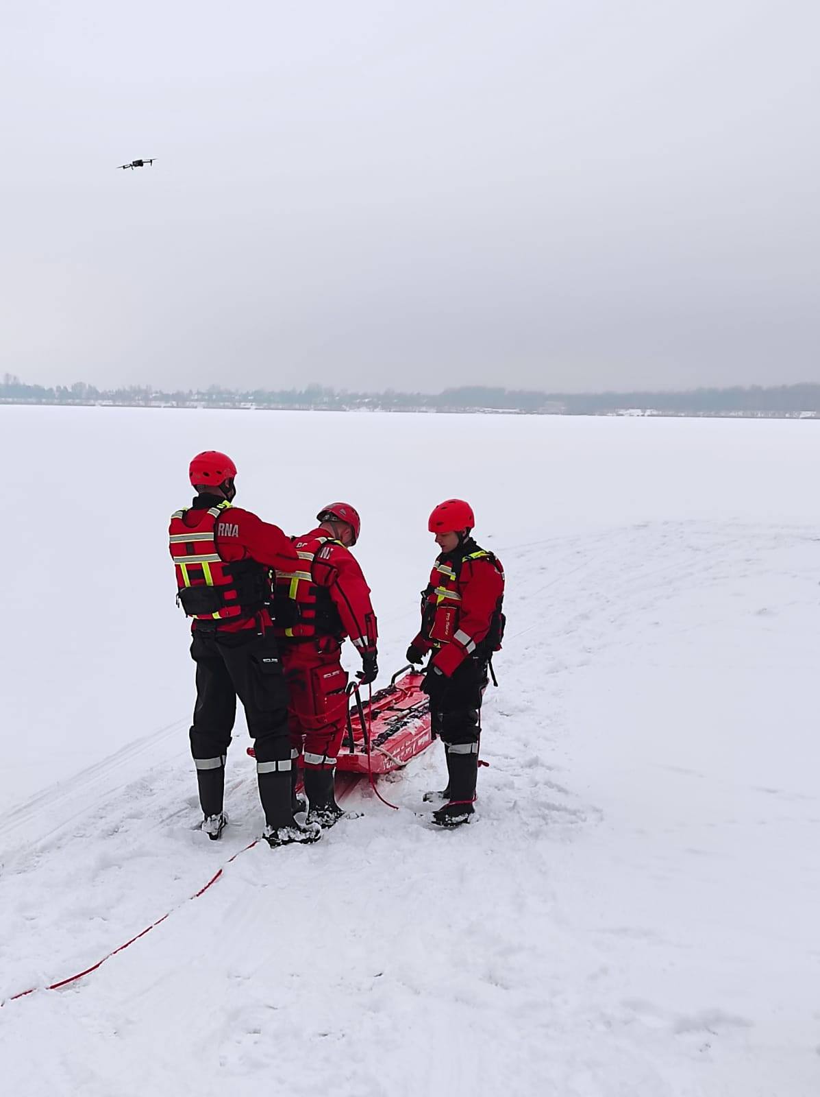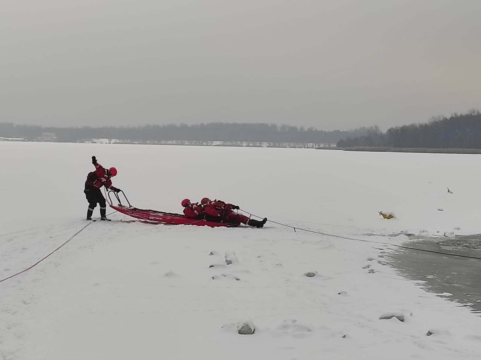 Podczas ćwiczeń strażacy doskonalili dostępne techniki ratownicze z wykorzystaniem specjalistycznego sprzętu, w tym m.in.: pasa ratowniczego typu „węgorz”, deski ortopedycznej oraz sań lodowych.