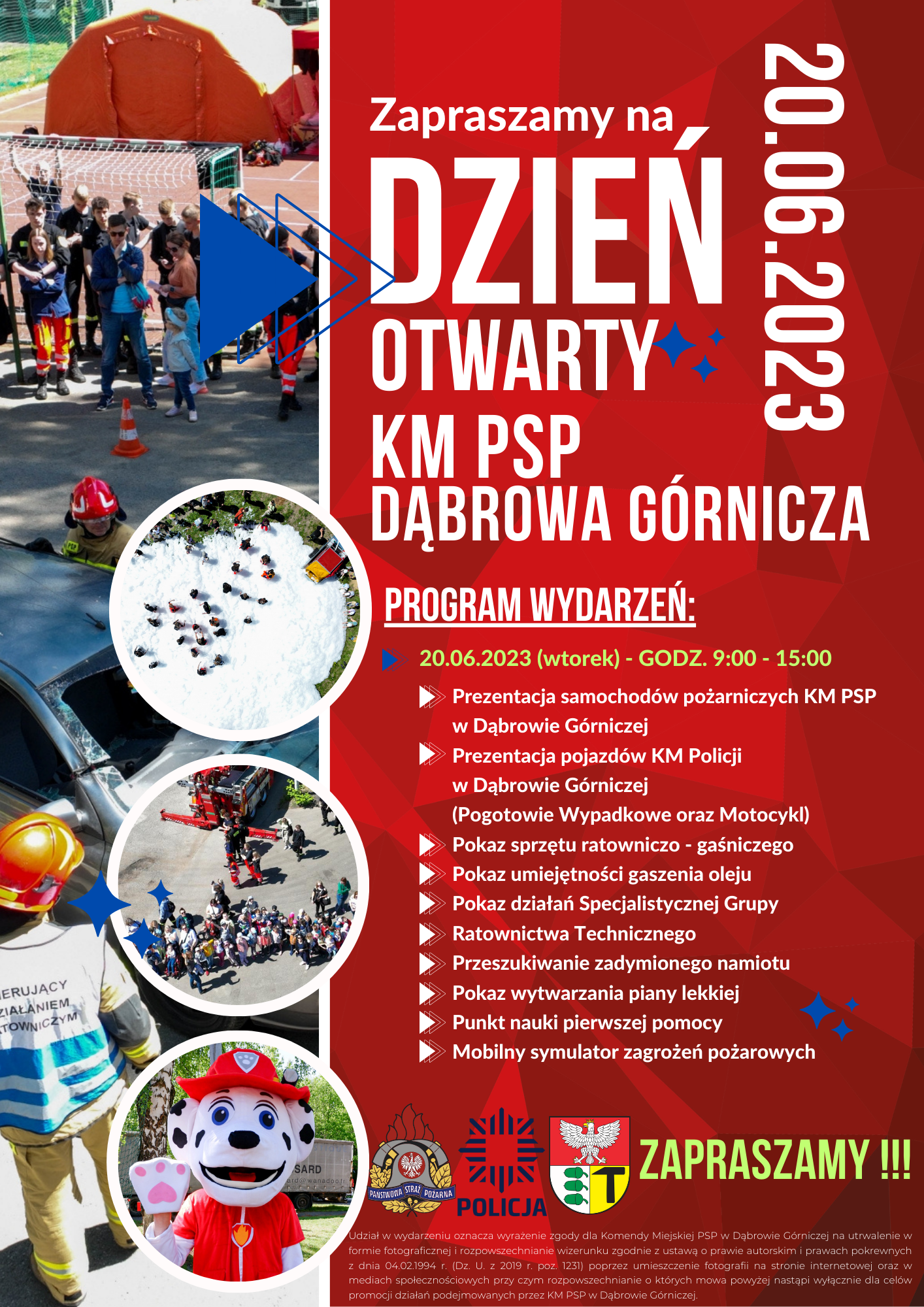 Komendant Miejski Państwowej Straży Pożarnej w Dąbrowie Górniczej serdecznie zaprasza na Dzień Otwarty w Komendzie Miejskiej PSP w Dąbrowie Górniczej organizowany w dniu 20 czerwca 2023 roku.
