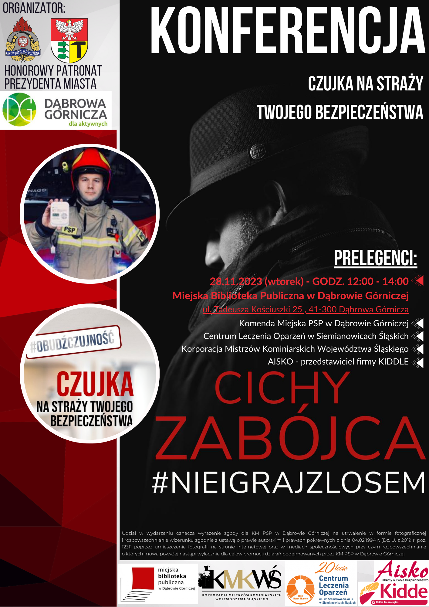 W dniu 28 listopada w Miejskiej Bibliotece Publicznej w Dąbrowie Górniczej, przy ul. Kościuszki 25, odbyła się konferencja pt. „Czujka na straży Twojego bezpieczeństwa!” zorganizowana przez Komendę Miejską Państwowej Straży Pożarnej w Dąbrowie Górniczej. Honorowy Patronat nad wydarzeniem objął Prezydent Miasta Dąbrowa Górnicza, Pan Marcin Bazylak.
