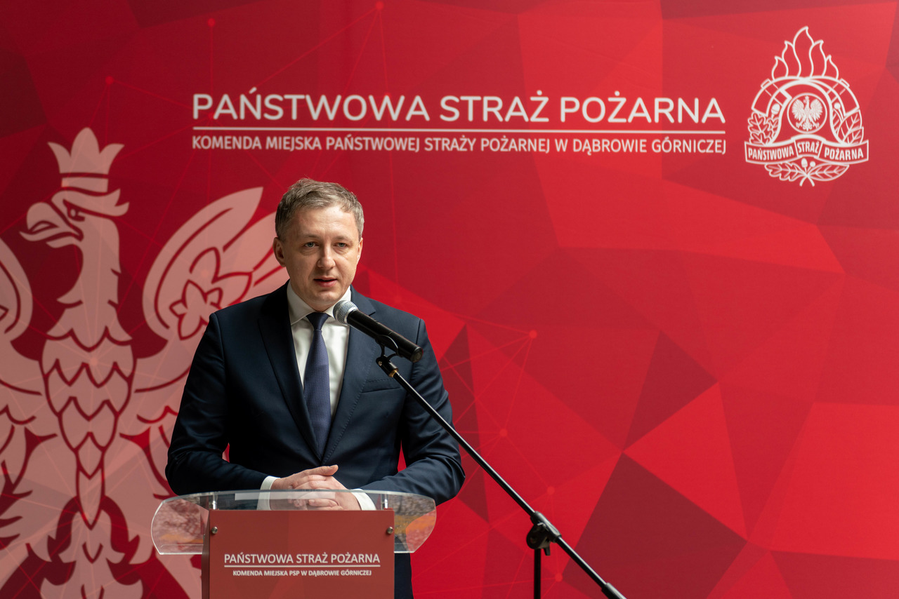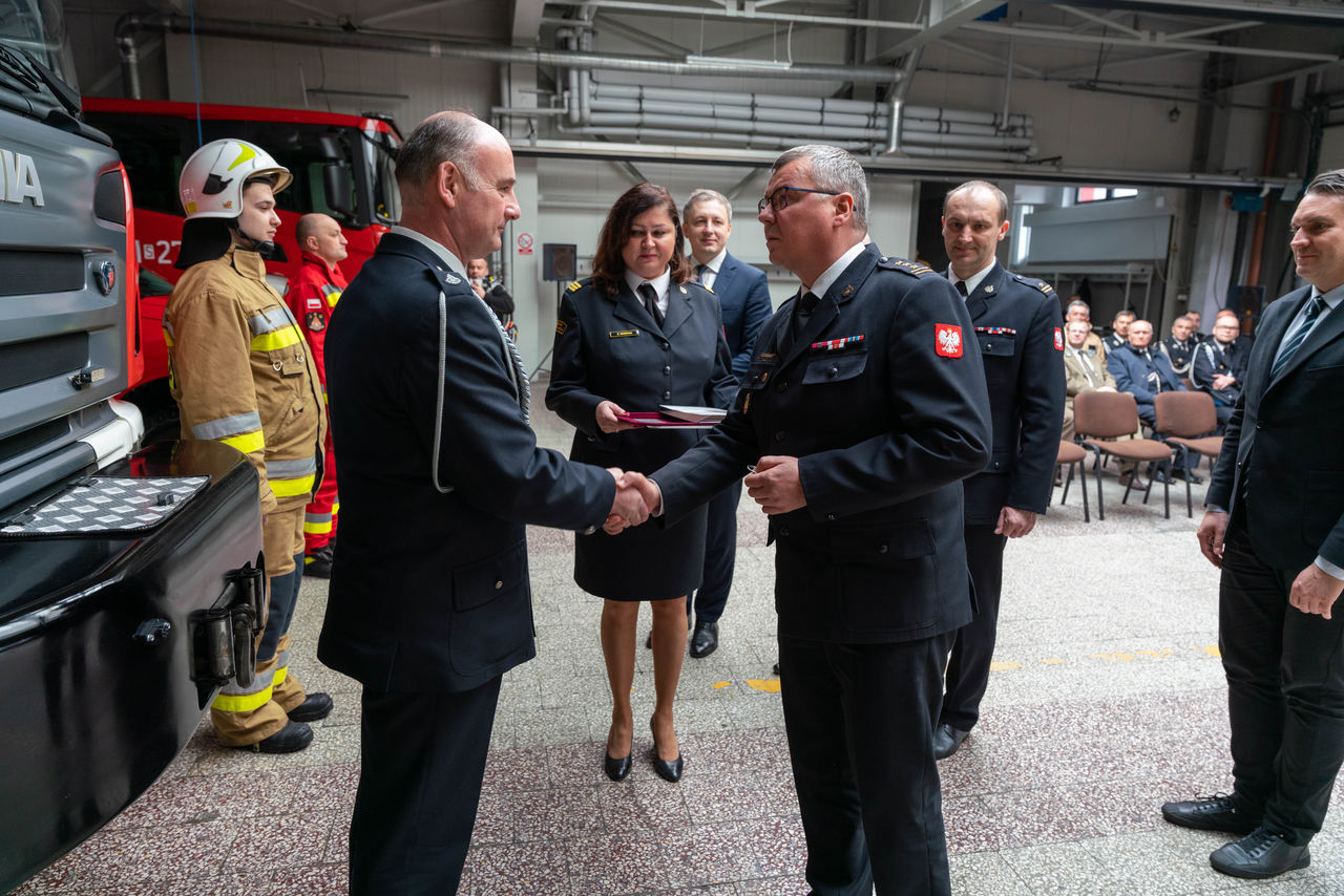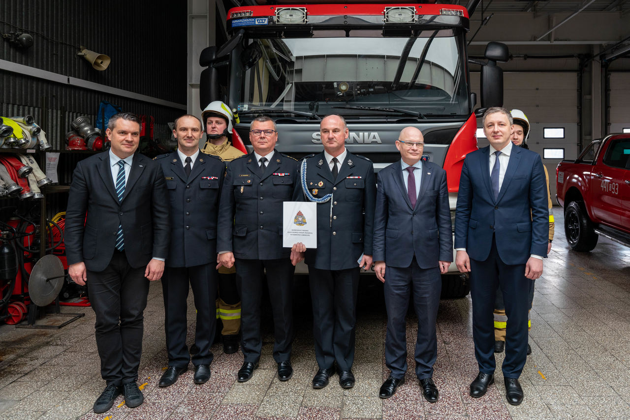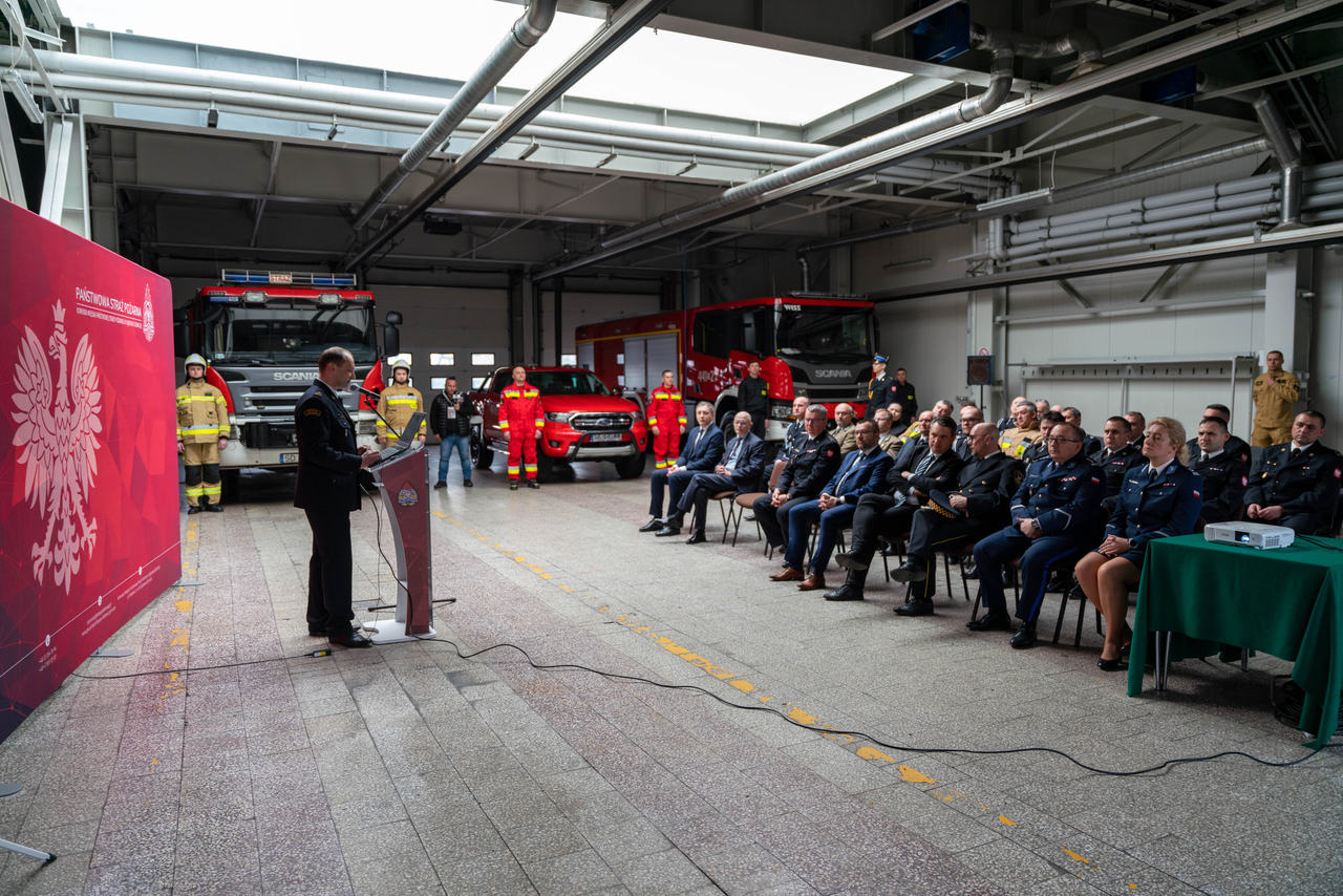 Następnie dokonano prezentacji nowych samochodów, które otrzymała Komenda Miejska PSP w Dąbrowie Górniczej. Na wyposażenie jednostki ratowniczo gaśniczej trafił ciężki samochód ratowniczo gaśniczy GCBA 8,3/64/27,4 SCANIA o wartości 1 663 821 zł natomiast Specjalistyczna Grupa Ratownictwa Technicznego „Dąbrowa Górnicza” otrzymała lekki samochód rozpoznawczo ratowniczy SLRr Ford RANGER o wartości 340 341 zł.