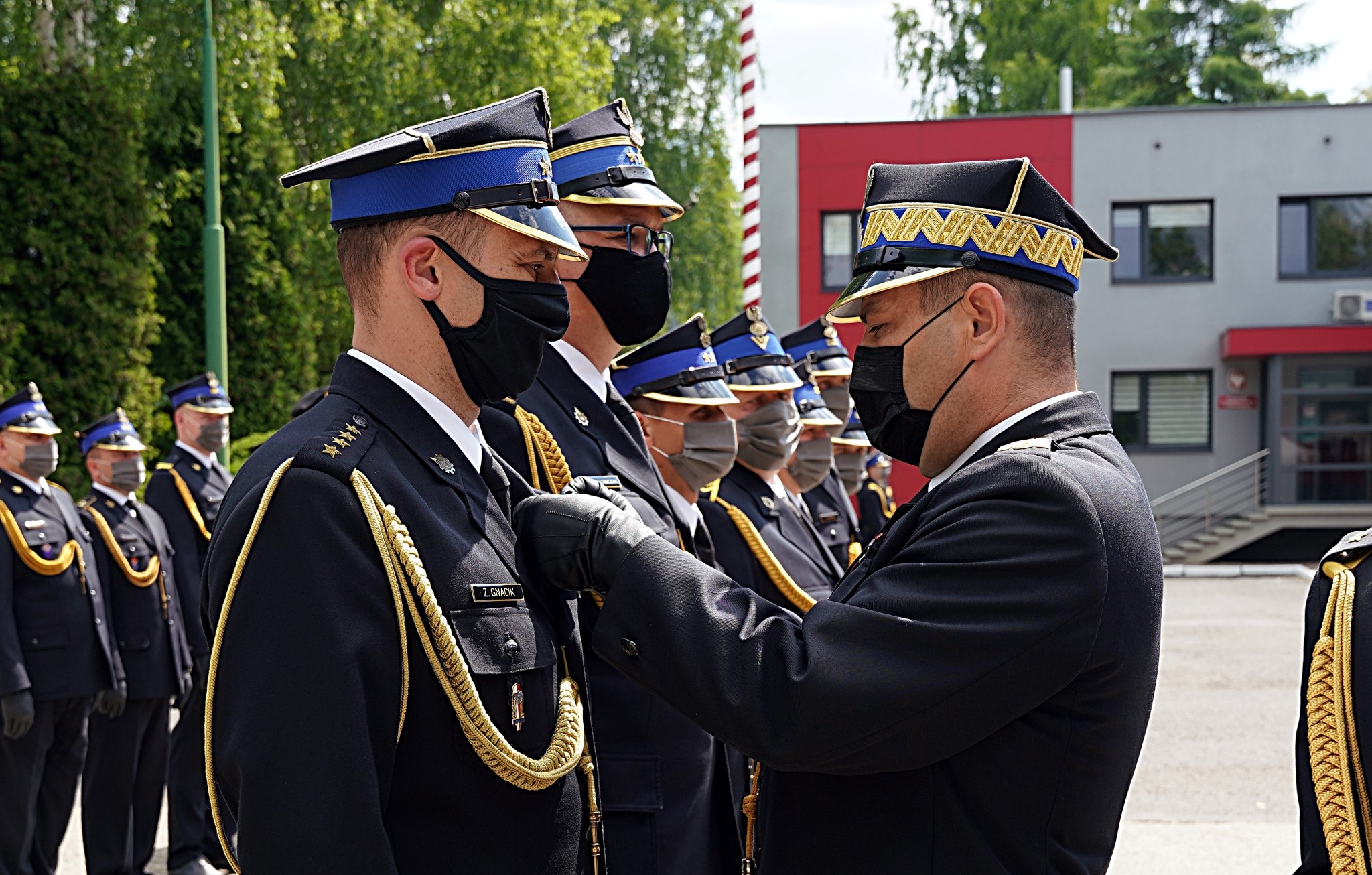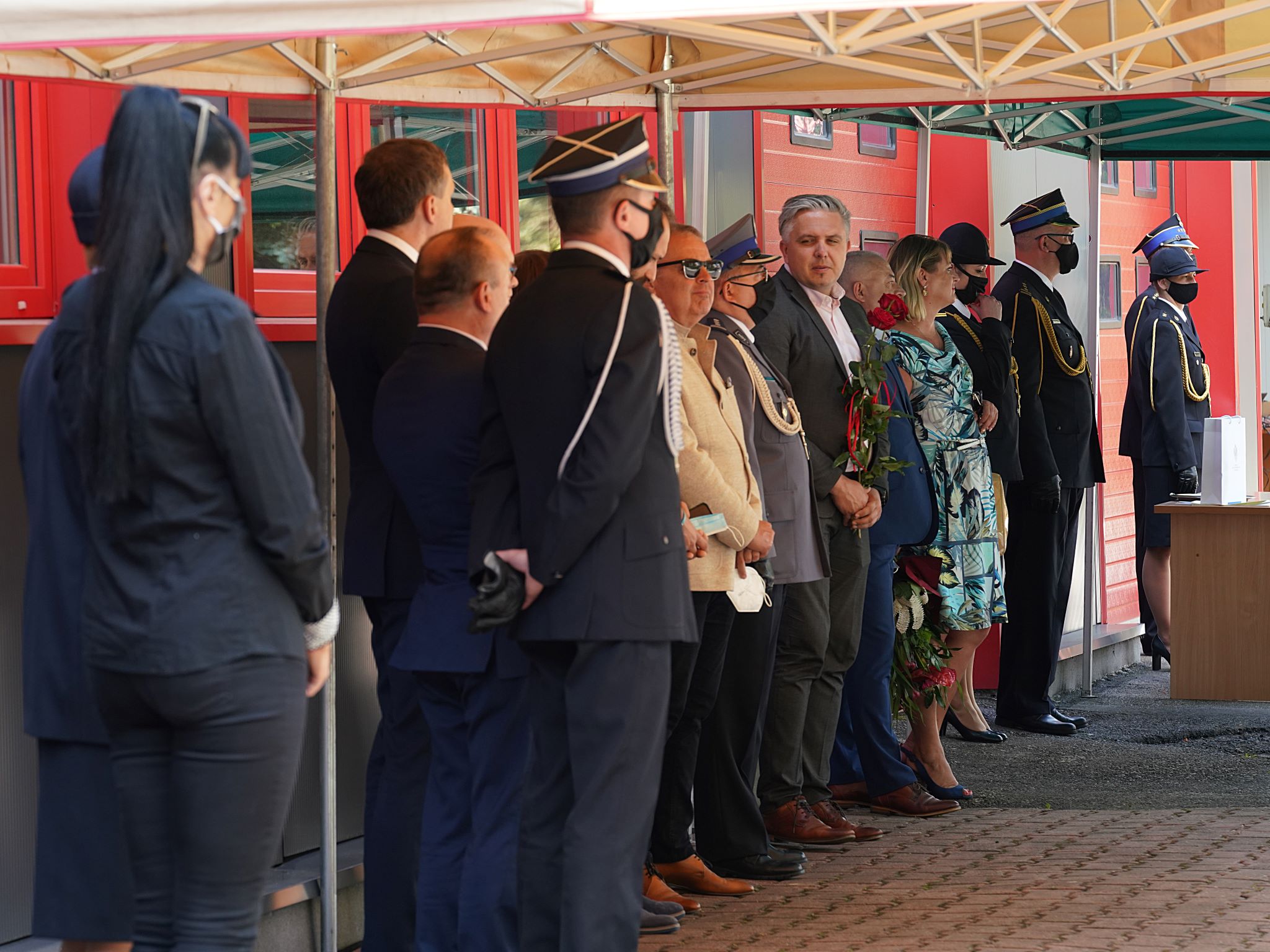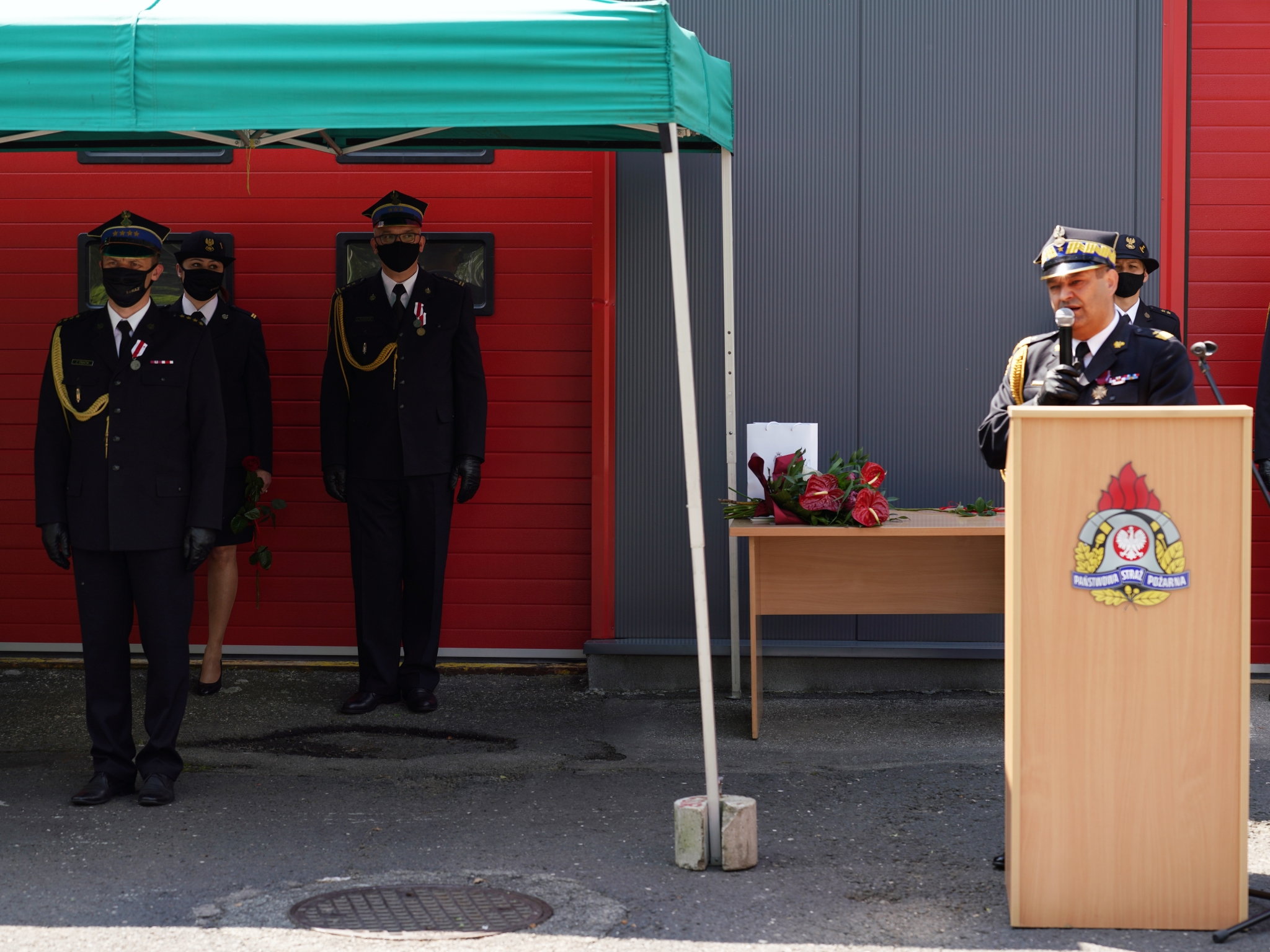 Zwieńczeniem uroczystości było przemówienie Śląskiego Komendanta Wojewódzkiego Państwowej Straży Pożarnej w Katowicach Pana nadbrygadiera Jacka Kleszczewskiego, który również przekazał podziękowania strażakom za służbę, w szczególności za zaangażowanie w przeciwdziałaniu pandemii, a także złożył gratulacje i życzenia Komendantowi Miejskiemu oraz strażakom i druhom.